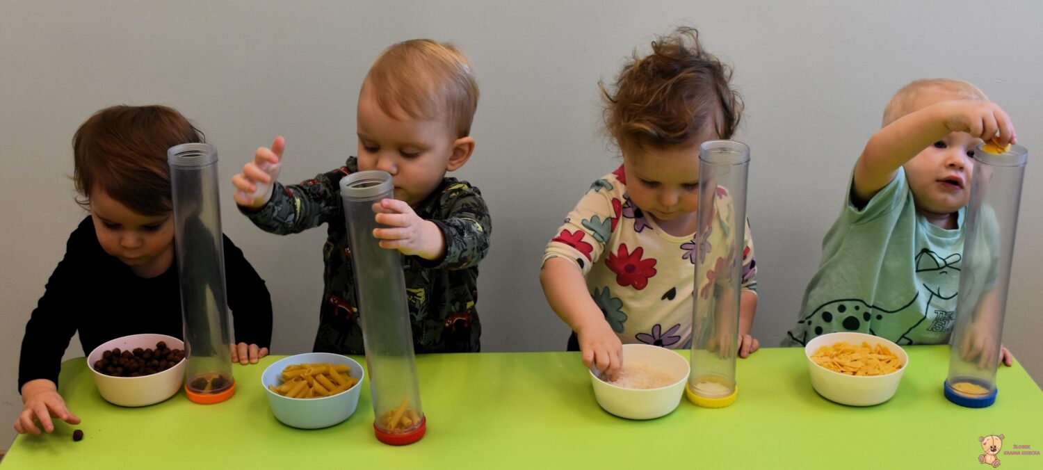 Podczas dzisiejszych zajęć sensoplastyki dzieci eksperymentowały z makaronem, ryżem oraz płatkami czekoladowymi i kukurydzianymi . Wrzucały produkty do przezroczystej tuby, obserwując, jak się mieszają i opadają, a także wsłuchując się w różne dźwięki . Zabawa stymulowała zmysł wzroku, słuchu i dotyku oraz wspierała rozwój motoryki małej i koordynacji wzrokowo-ruchowej. Była to radosna, twórcza aktywność, która […]