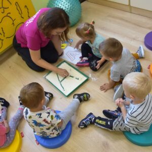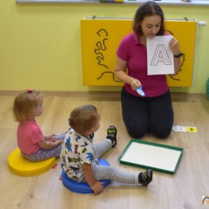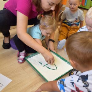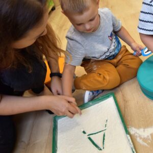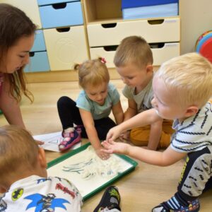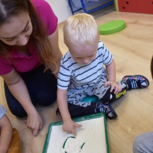 Na dzisiejszych zajęciach nasze AMIsiaki- starszaki rozpoczęły poznawanie literek. Ciocia przygotowała dla nich szablony z literką A. Amisiaki uczyły się kreślić kształt literki na tacy wysypanej mąką. Wszystkie dzieci z wielkim zainteresowaniem i uwagą rysowały literę swoimi paluszkami. Zajęcia ,,literkowo” zostały wprowadzone w celu przygotowania dzieci do nauki w przedszkolu.