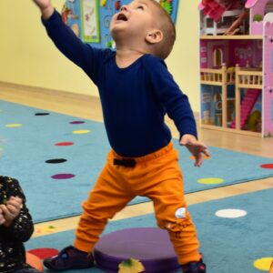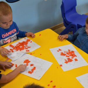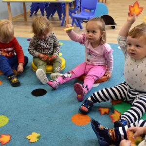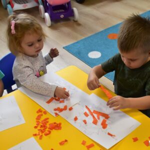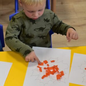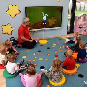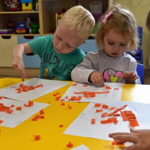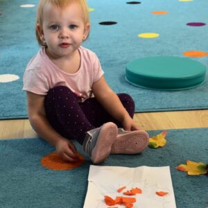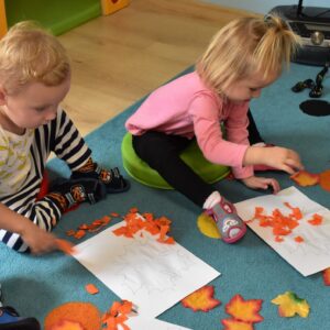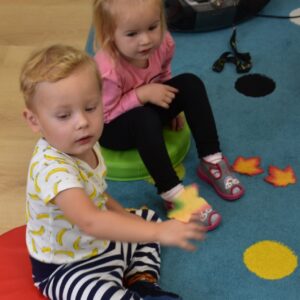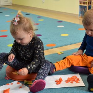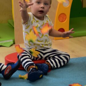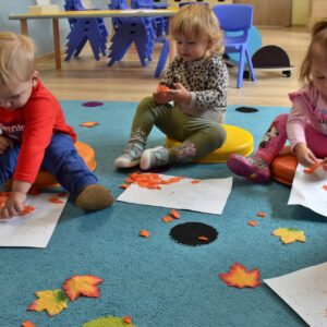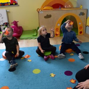 Dzisiaj na języku angielskim zawitała do nas jesień o czym świadczyły porozsypywane dookoła nas pomarańczowe liście. Bawiliśmy się nimi razem z ciocią, machając nimi, unosząc je do góry i puszczając jakby spadały z drzewa. Żeby umilić sobie te czynności śpiewaliśmy piosenkę. Ciocia pokazała nam również krótki filmik ukazujący historię samotnego liścia. A na koniec starsze Amisiaki same tworzyły.