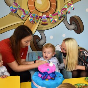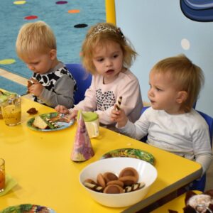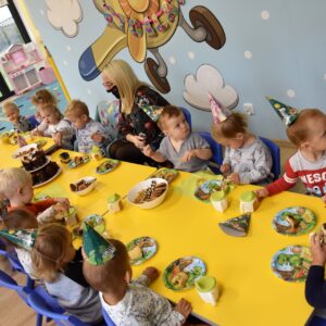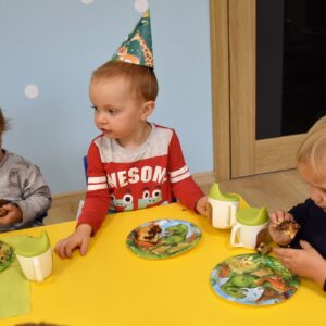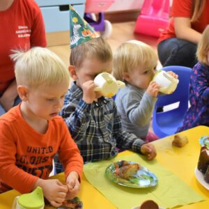 Dziś w naszym żłobku swoje święto obchodził Julian ! Wspólnie świętowaliśmy jego drugie urodzinki, a w tym dniu towarzyszyła nam jego mama. Była wspólna zabawa na dywanie, dzieci pięknie odśpiewały „Sto Lat” . Julian zdmuchnął dwie świeczki z AMIsiowego tortu i wybrał sobie prezent z urodzinowego pudełka. Mama Juliana przygotowała dla wszystkich pyszny słodki poczęstunek.