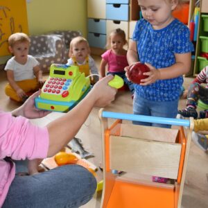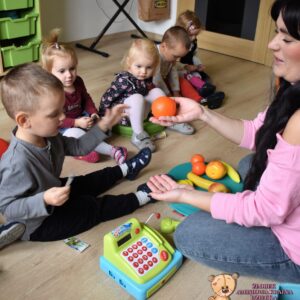 Meldujemy ze jesteśmy gotowi aby pomóc naszym rodzicom i dziadkom w zakupach bo dzisiaj bogaciliśmy nasze słownictwo w zakresie właśnie produktów spożywczych. Znamy już warzywa, owoce, rybki, mięsko, nabiał. Ciocia kasowała nasze zakupy – niestety musieliśmy zapłacić naszymi pieniążkami