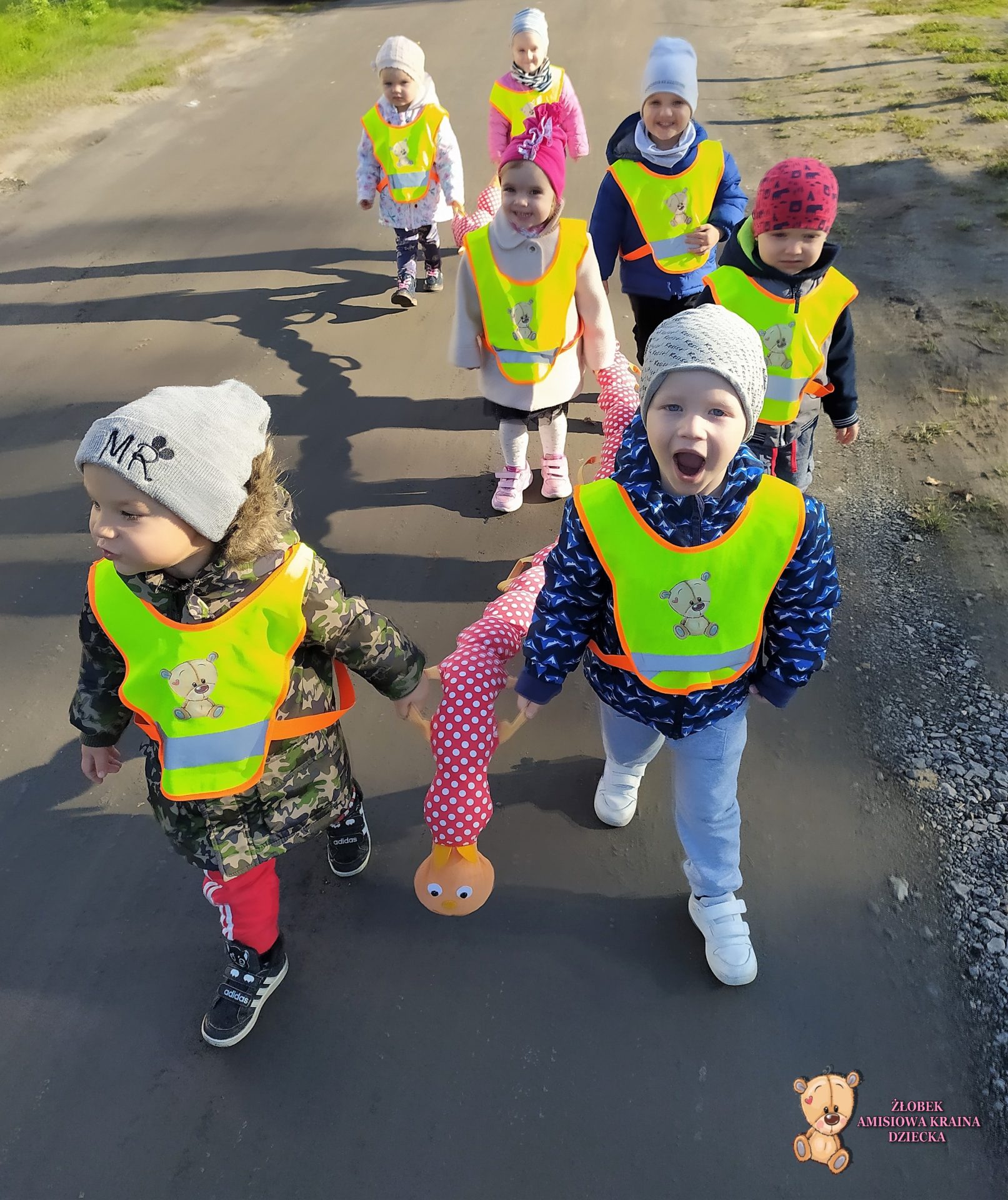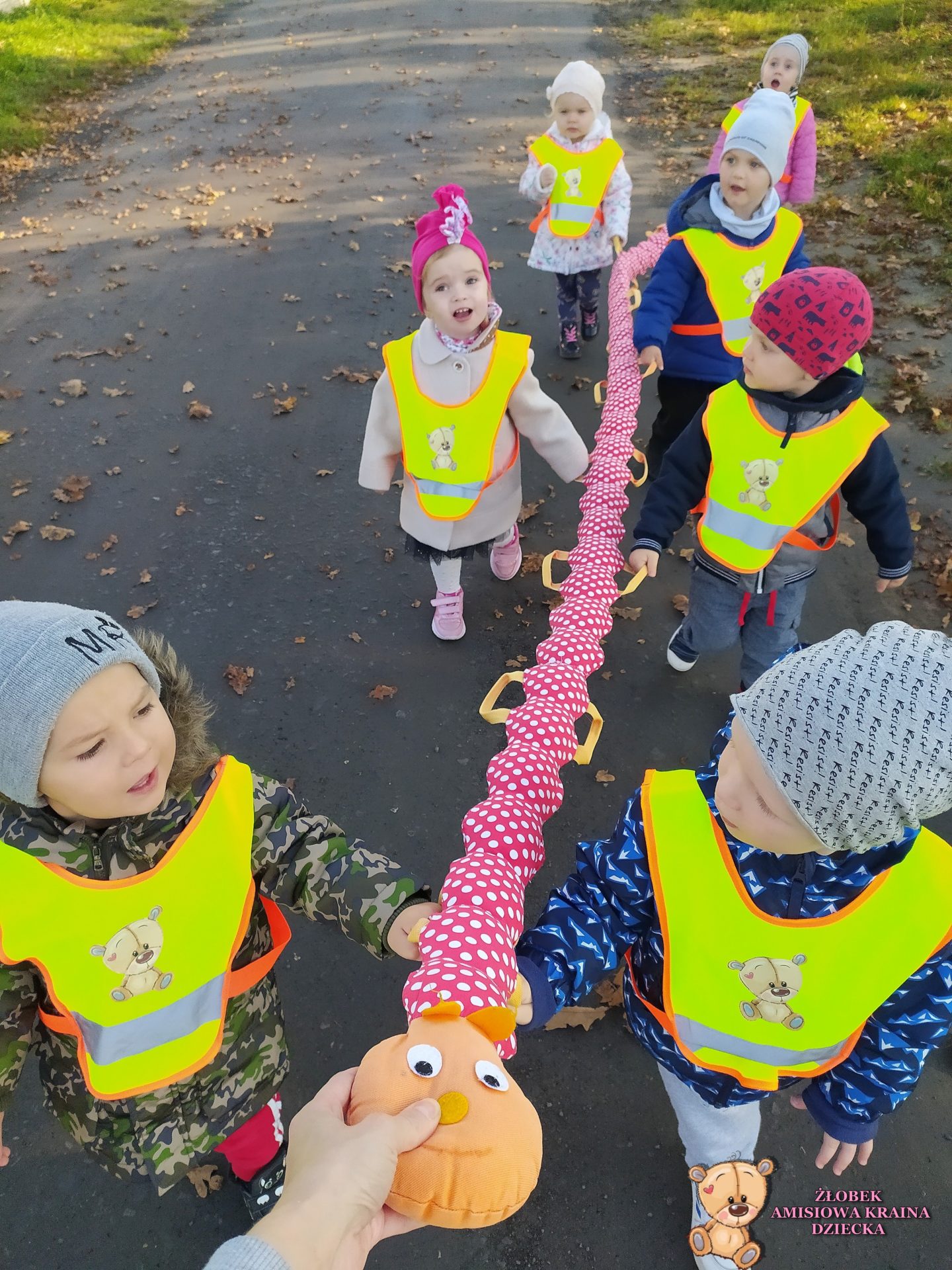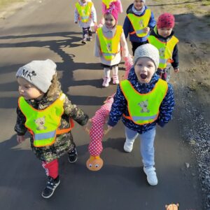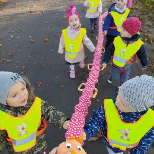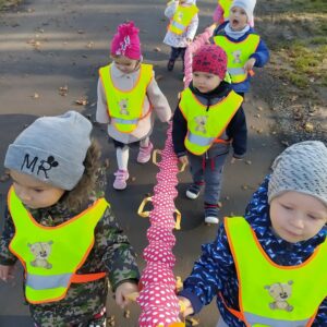 Dzisiaj grupa niedźwiadków korzystając z pięknej jesiennej pogody wybrała się na spacer po najbliższej okolicy. Śpiewając  z uśmiechem na twarzy obserwowali kolorowo mieniące się w słońcu liście.