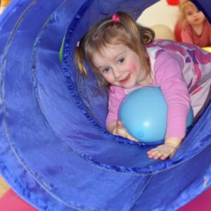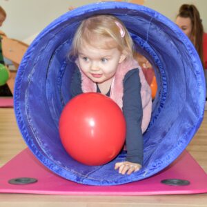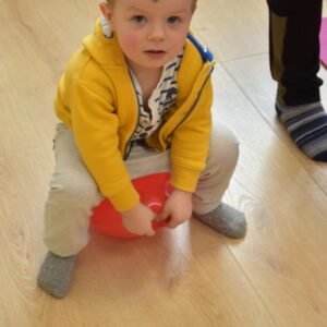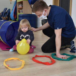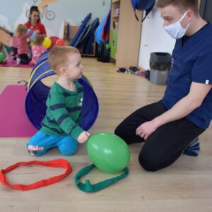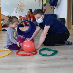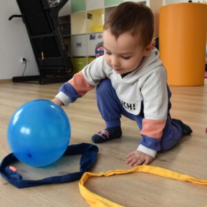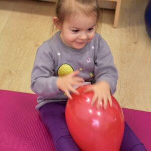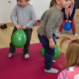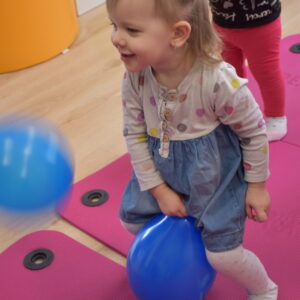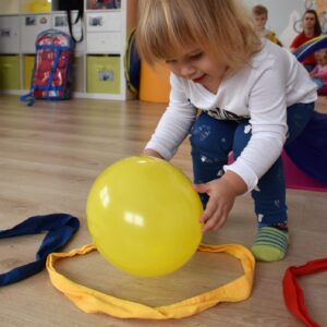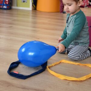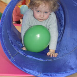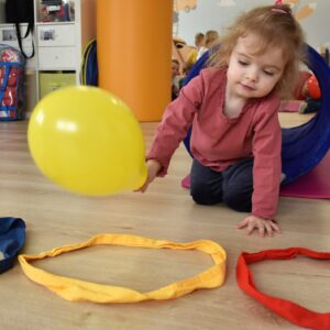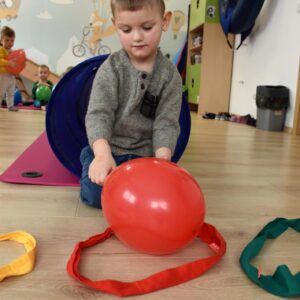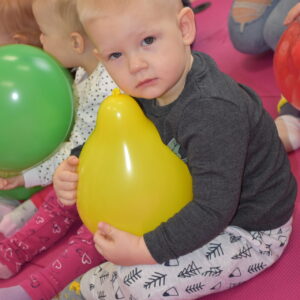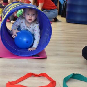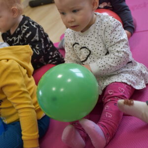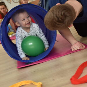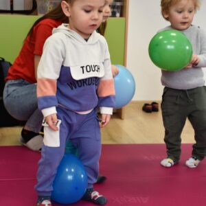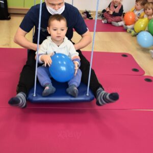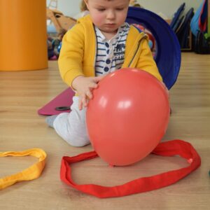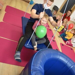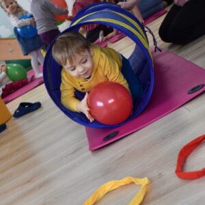 Dziś kolorowe, uwielbiane przez wszystkich balony 🙂 rozwijaliśmy dziś naszą koordynację poprzez różne zabawy ruchowe z balonami. Wykorzystaliśmy je również do rozróżniania kolorów. Każde z dzieciaków musiało się przecisnąć przez tunel razem ze swoim kolorowym towarzyszem. Było też trochę huku, bo niektóre balony pękały! BUM! Ale nie straszne nam już takie hałasy 🙂 Na koniec wujek przygotował najtrudniejsze zadanie. Próbowaliśmy wrzucić balon do beczki podczas huśtania na dużej huśtawce 🙂 to naprawdę nie było łatwe, ale bardzo przypadło do gustu dzieciom. Wujek obiecał, że powtórzymy tę zabawę za jakiś czas i zobaczymy jak nam wtedy pójdzie 🙂