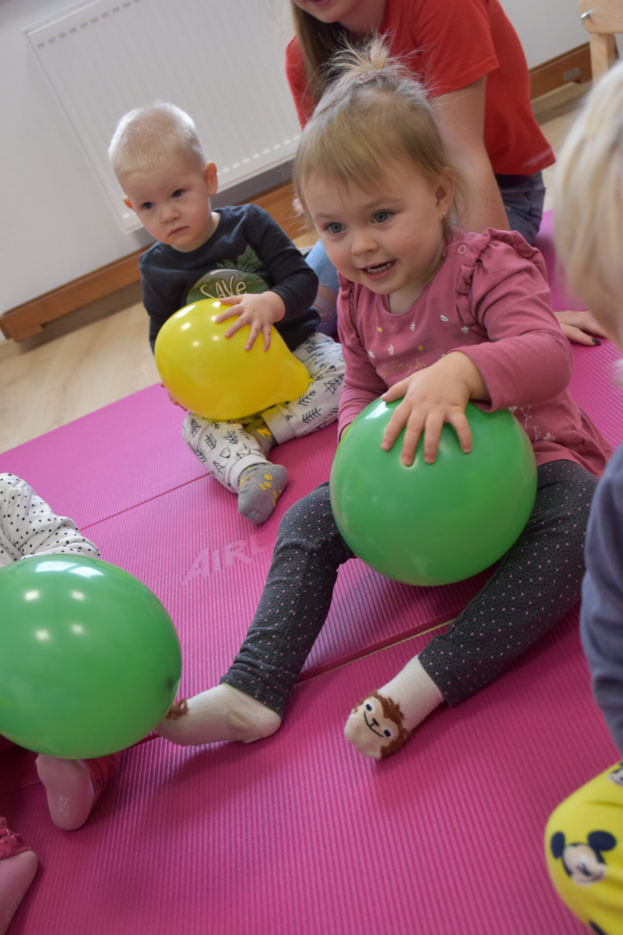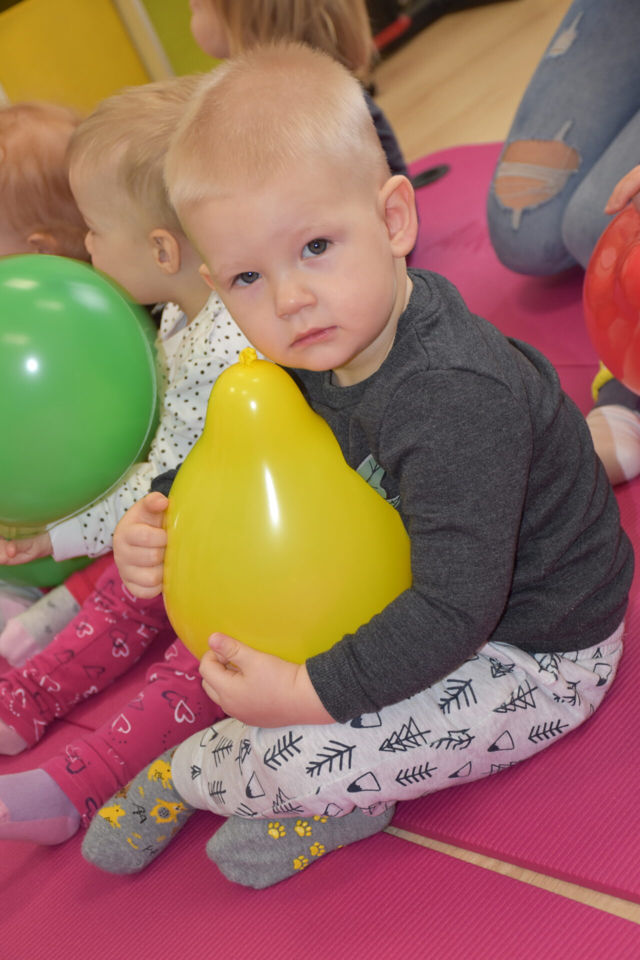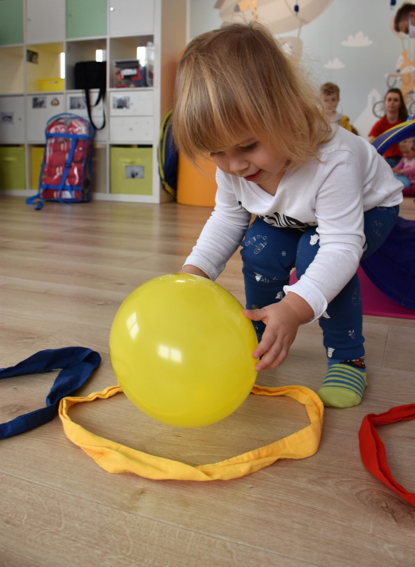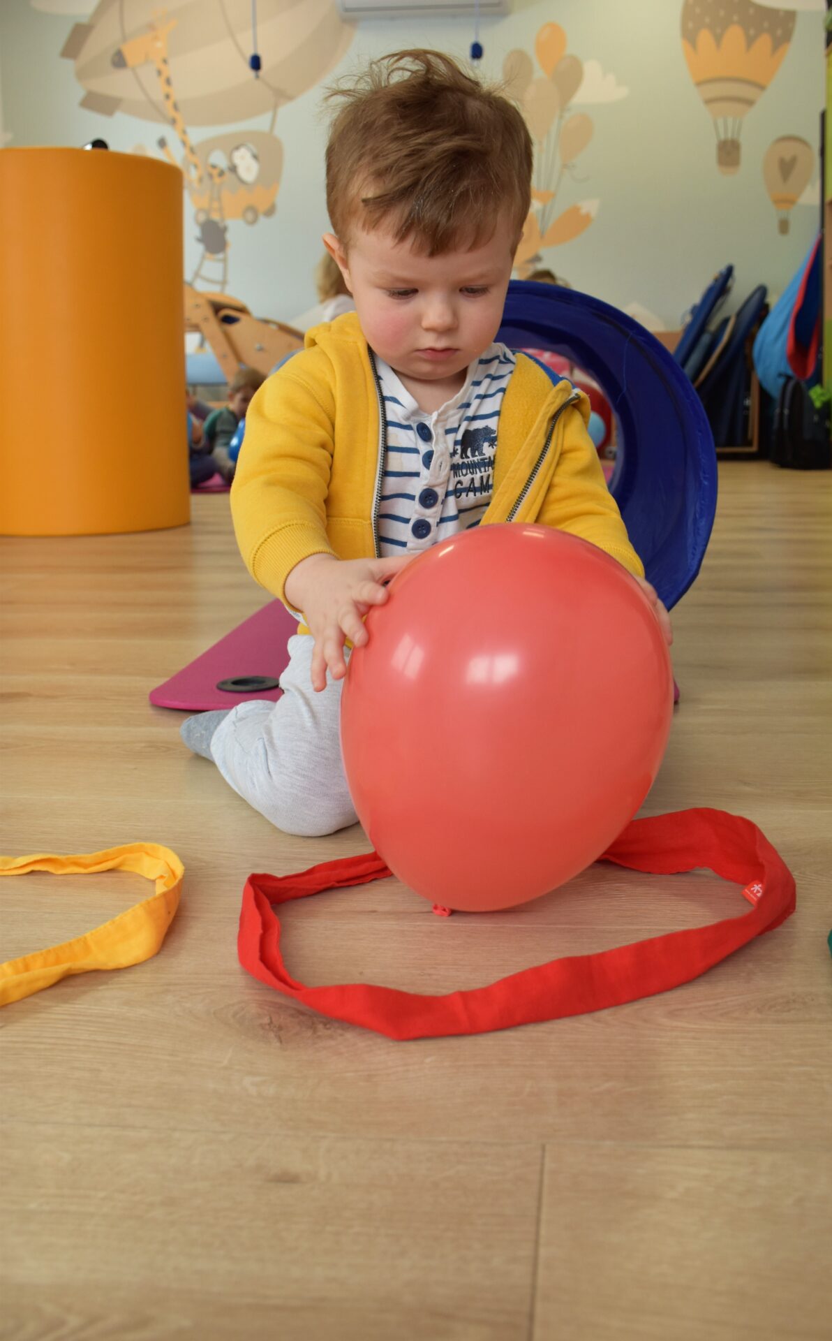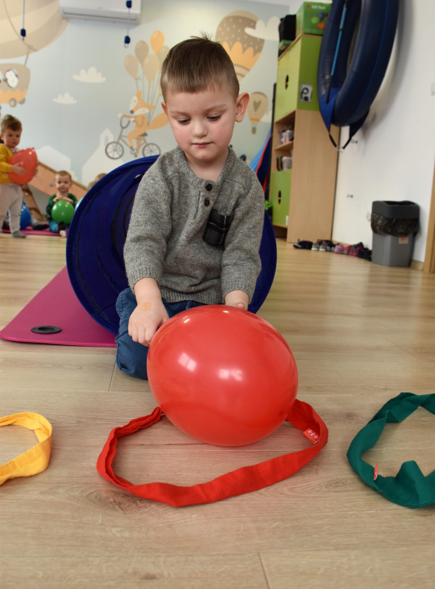 Dziś kolorowe, uwielbiane przez wszystkich balony 🙂 rozwijaliśmy dziś naszą koordynację poprzez różne zabawy ruchowe z balonami. Wykorzystaliśmy je również do rozróżniania kolorów. Każde z dzieciaków musiało się przecisnąć przez tunel razem ze swoim kolorowym towarzyszem. Było też trochę huku, bo niektóre balony pękały! BUM! Ale nie straszne nam już takie hałasy 🙂 Na koniec wujek przygotował najtrudniejsze zadanie. Próbowaliśmy wrzucić balon do beczki podczas huśtania na dużej huśtawce 🙂 to naprawdę nie było łatwe, ale bardzo przypadło do gustu dzieciom. Wujek obiecał, że powtórzymy tę zabawę za jakiś czas i zobaczymy jak nam wtedy pójdzie 🙂