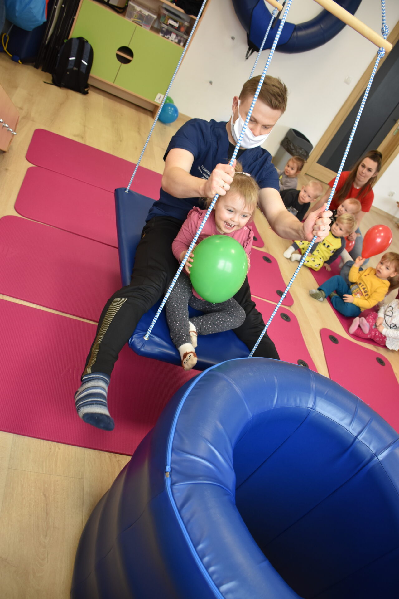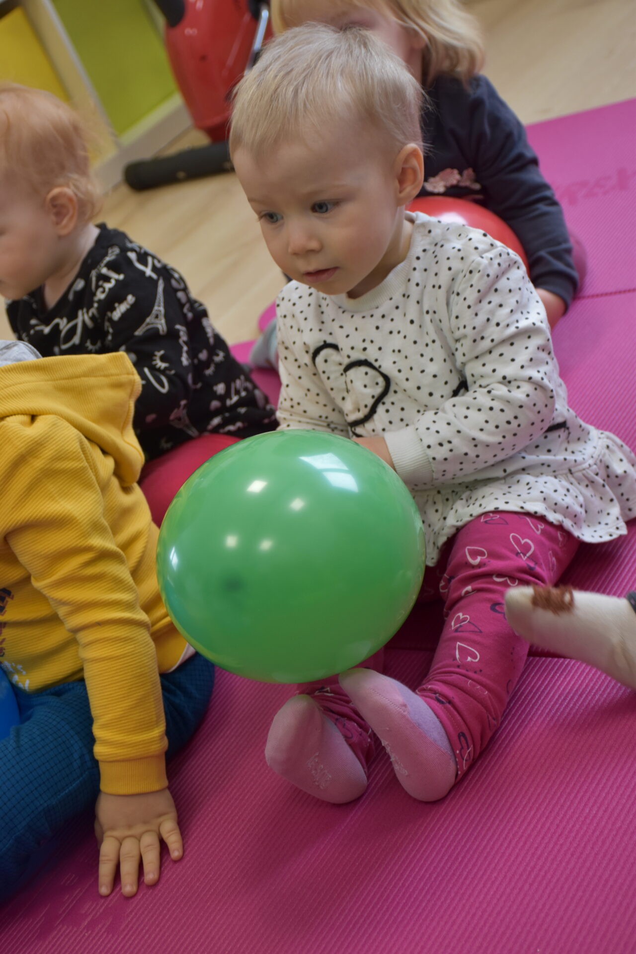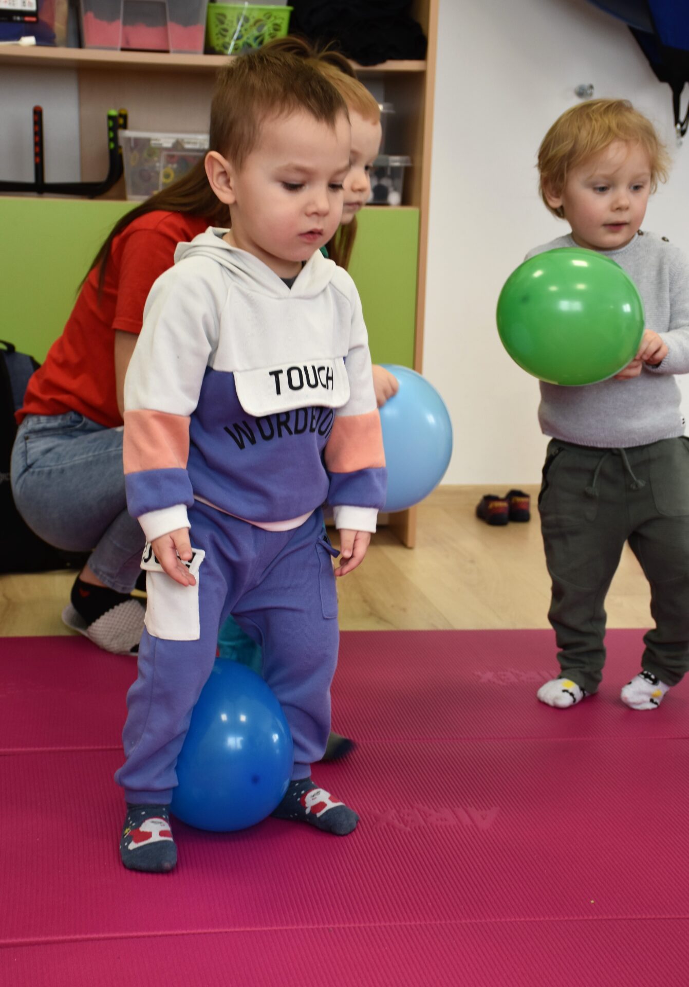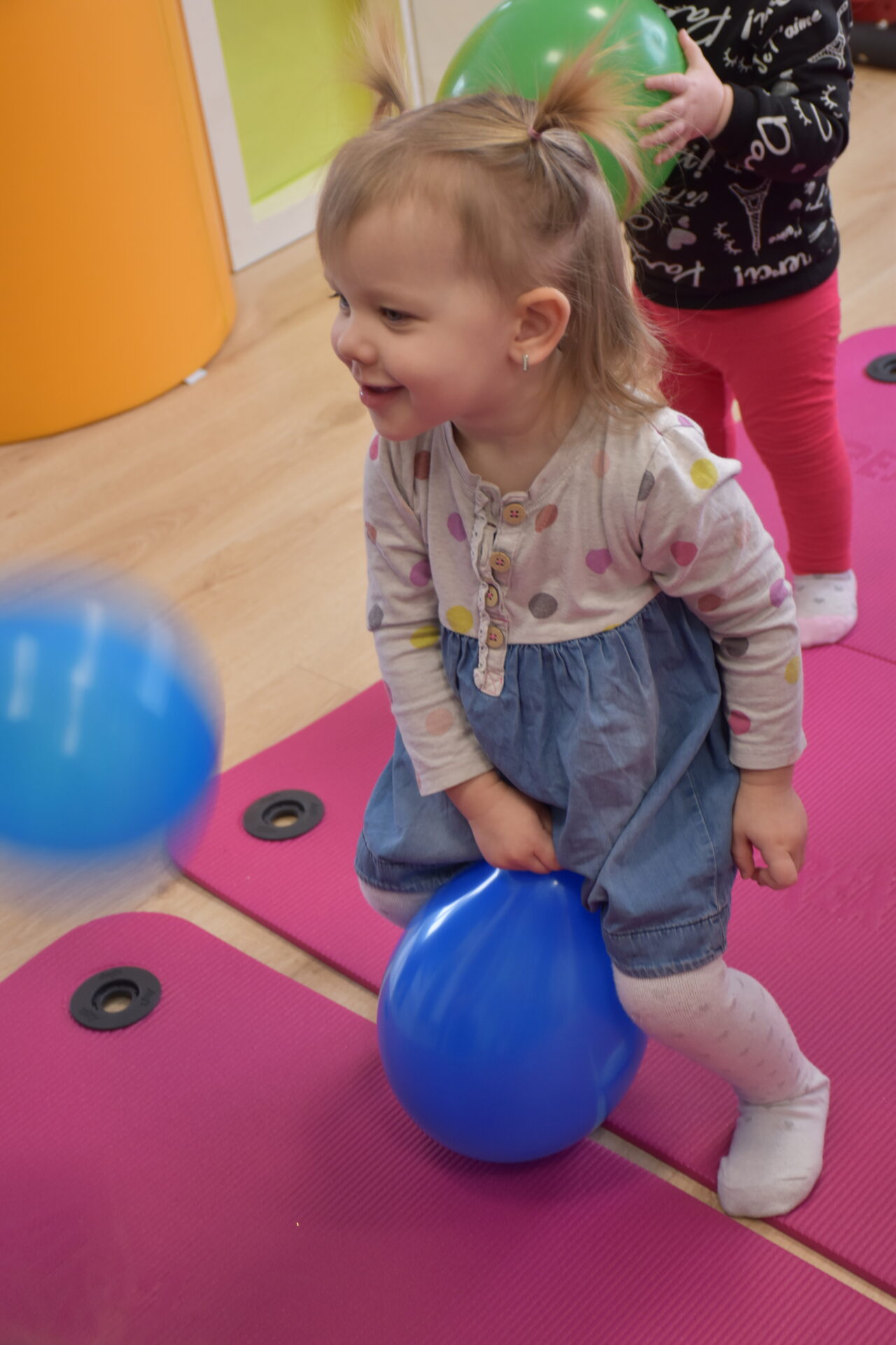 Dziś kolorowe, uwielbiane przez wszystkich balony 🙂 rozwijaliśmy dziś naszą koordynację poprzez różne zabawy ruchowe z balonami. Wykorzystaliśmy je również do rozróżniania kolorów. Każde z dzieciaków musiało się przecisnąć przez tunel razem ze swoim kolorowym towarzyszem. Było też trochę huku, bo niektóre balony pękały! BUM! Ale nie straszne nam już takie hałasy 🙂 Na koniec wujek przygotował najtrudniejsze zadanie. Próbowaliśmy wrzucić balon do beczki podczas huśtania na dużej huśtawce 🙂 to naprawdę nie było łatwe, ale bardzo przypadło do gustu dzieciom. Wujek obiecał, że powtórzymy tę zabawę za jakiś czas i zobaczymy jak nam wtedy pójdzie 🙂