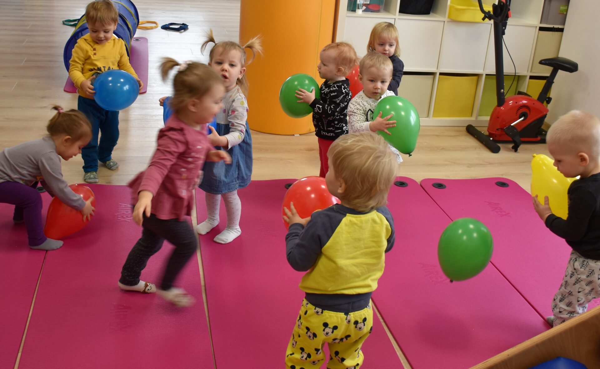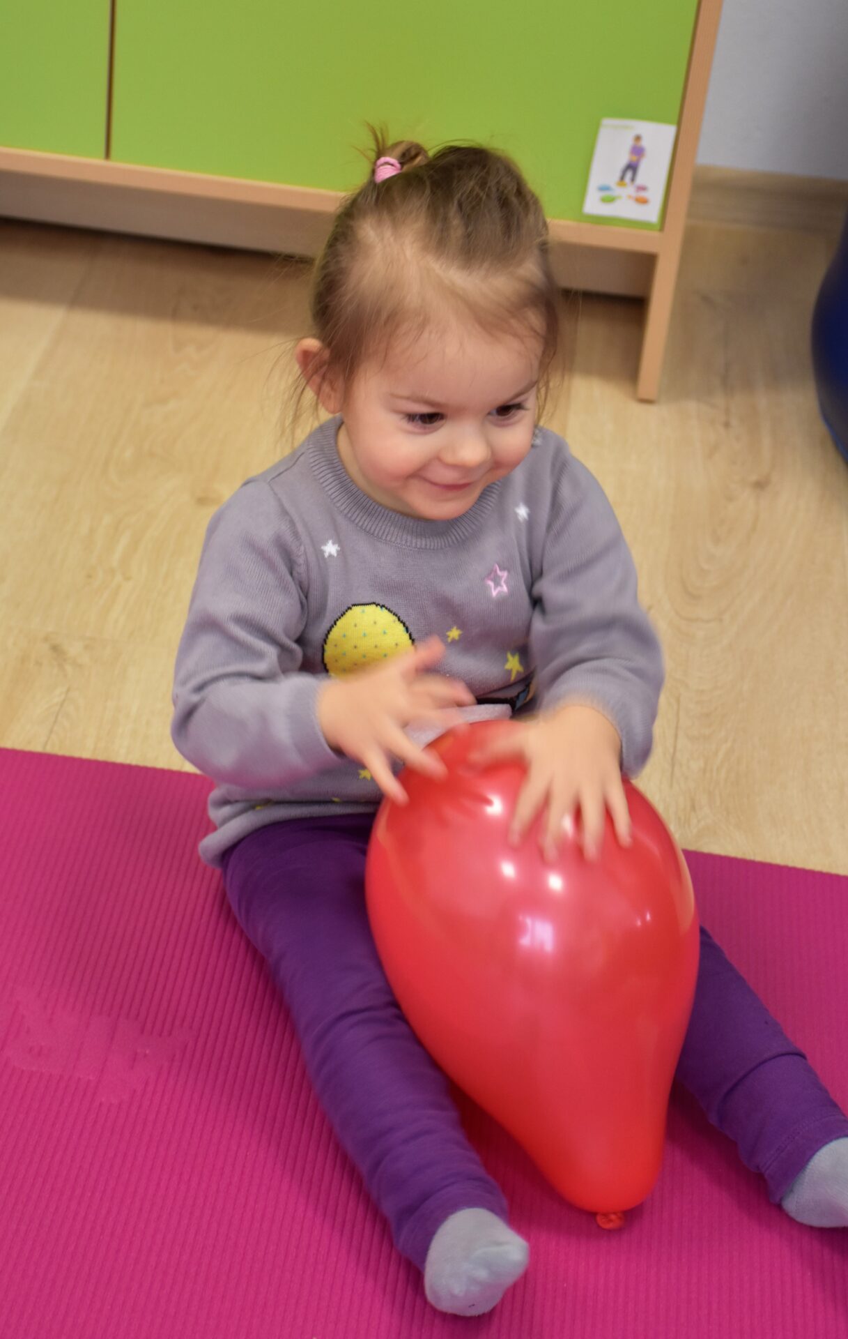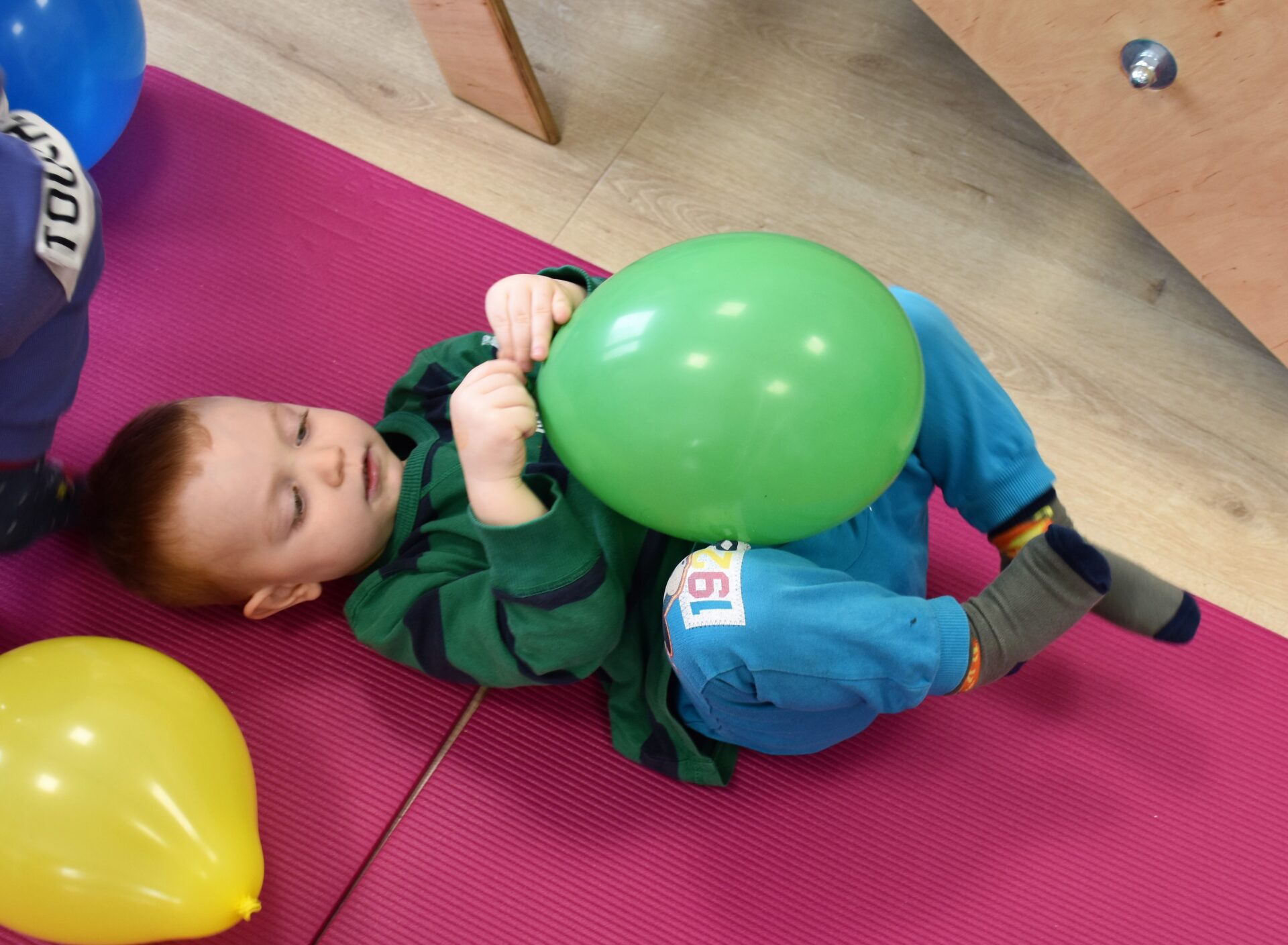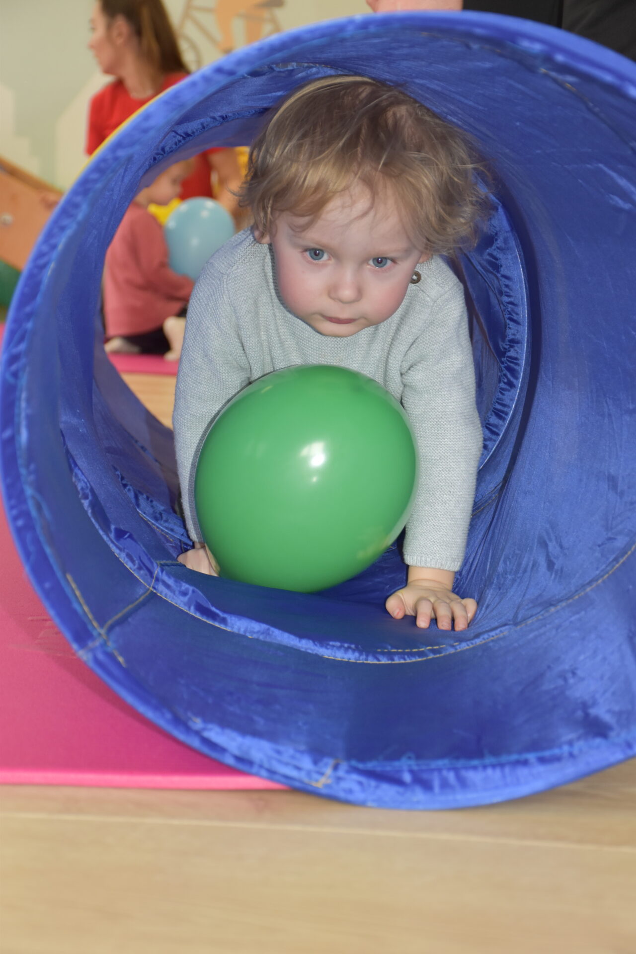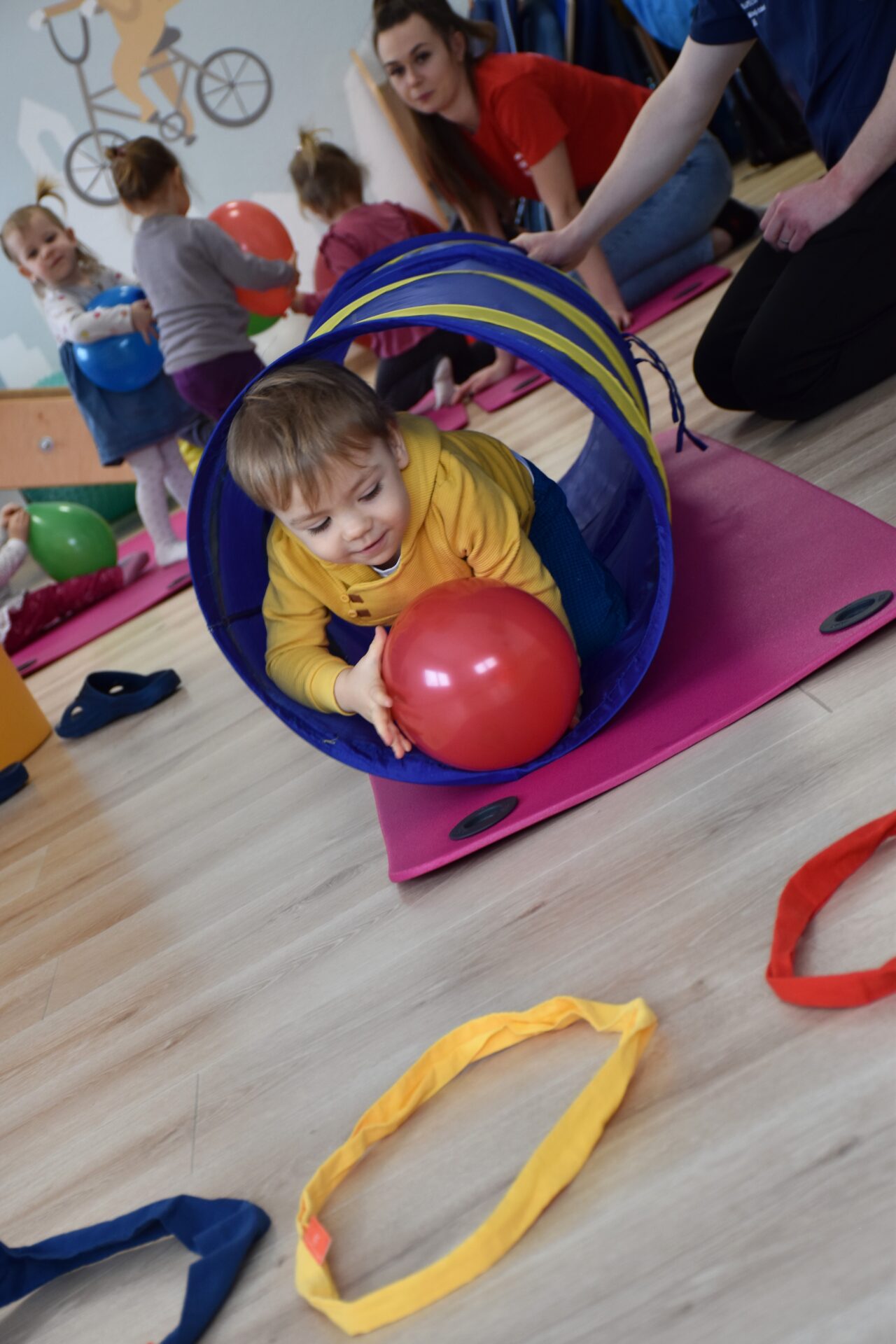 Dziś kolorowe, uwielbiane przez wszystkich balony 🙂 rozwijaliśmy dziś naszą koordynację poprzez różne zabawy ruchowe z balonami. Wykorzystaliśmy je również do rozróżniania kolorów. Każde z dzieciaków musiało się przecisnąć przez tunel razem ze swoim kolorowym towarzyszem. Było też trochę huku, bo niektóre balony pękały! BUM! Ale nie straszne nam już takie hałasy 🙂 Na koniec wujek przygotował najtrudniejsze zadanie. Próbowaliśmy wrzucić balon do beczki podczas huśtania na dużej huśtawce 🙂 to naprawdę nie było łatwe, ale bardzo przypadło do gustu dzieciom. Wujek obiecał, że powtórzymy tę zabawę za jakiś czas i zobaczymy jak nam wtedy pójdzie 🙂