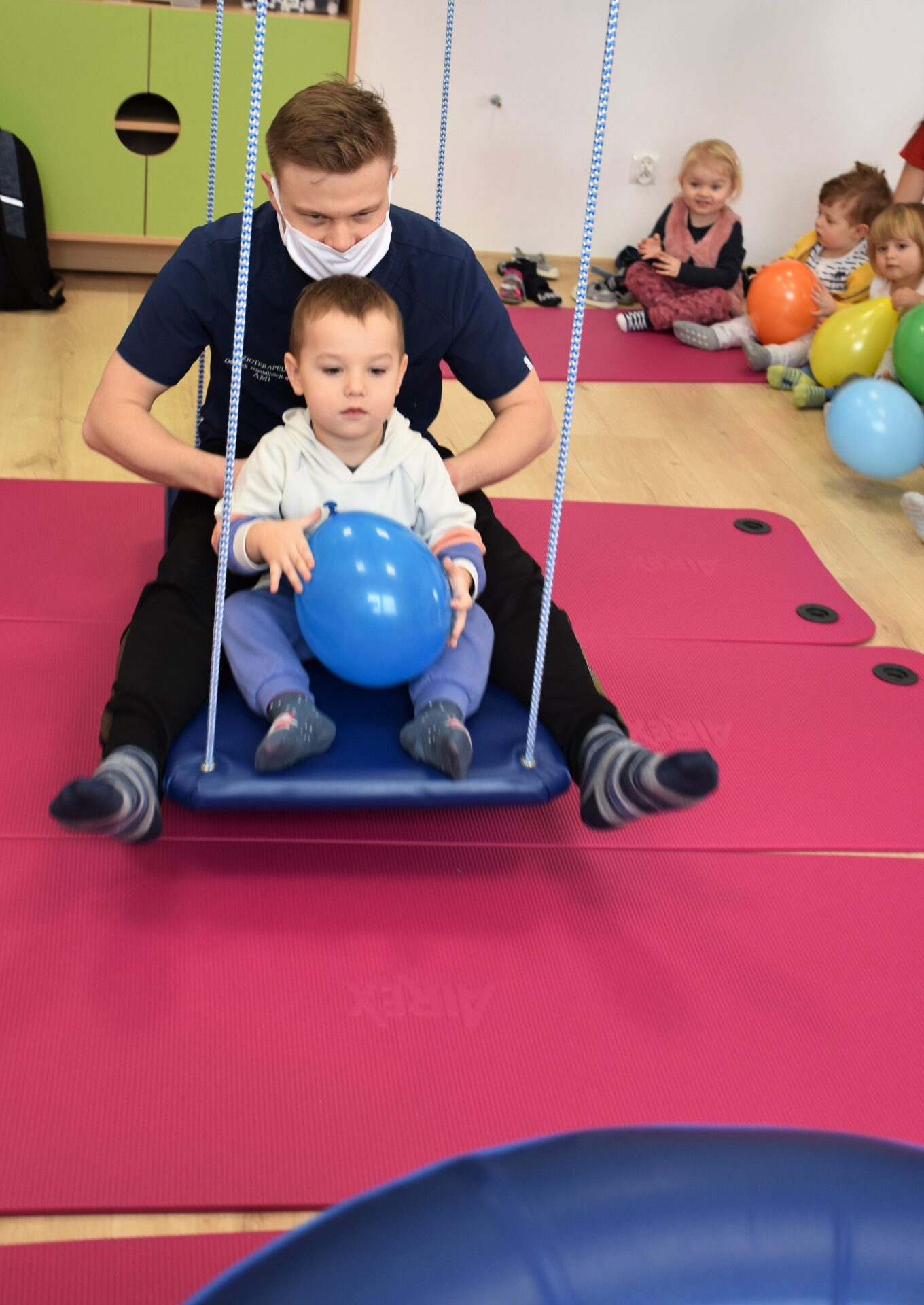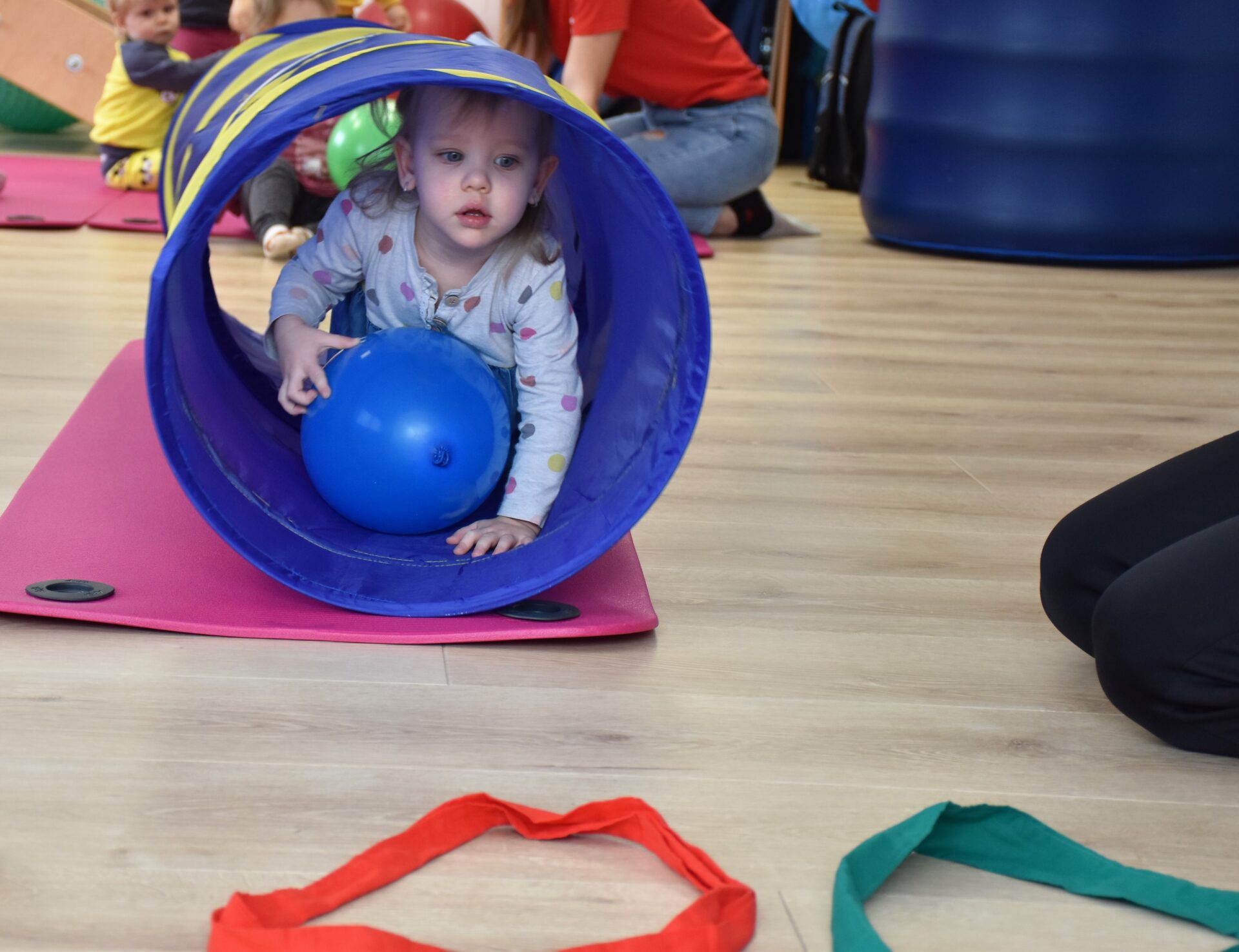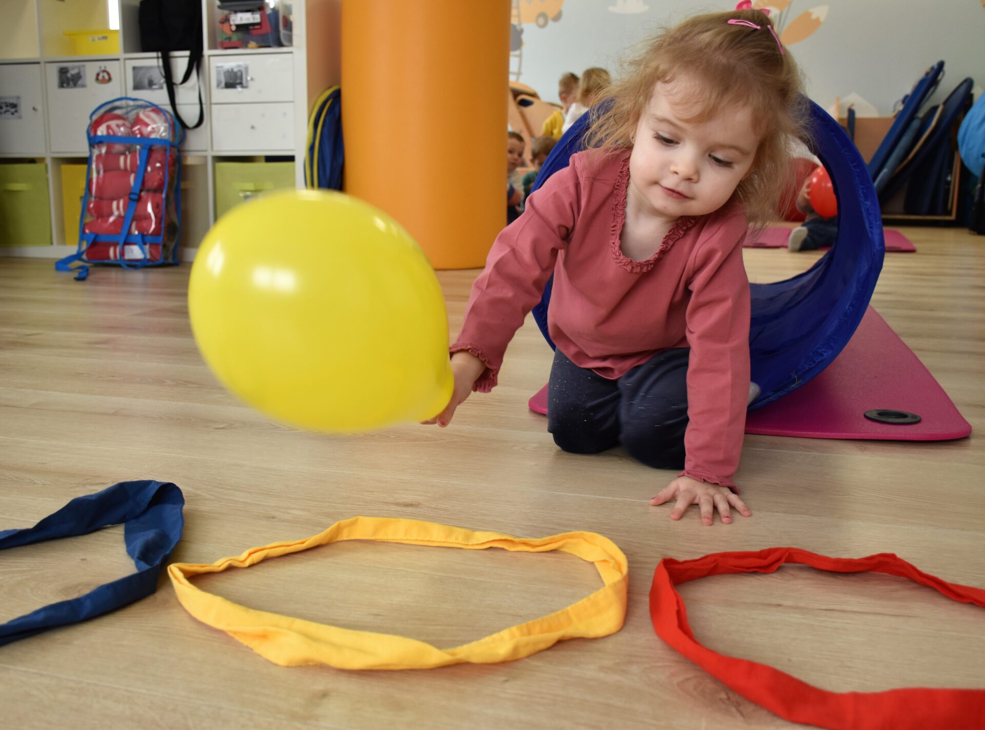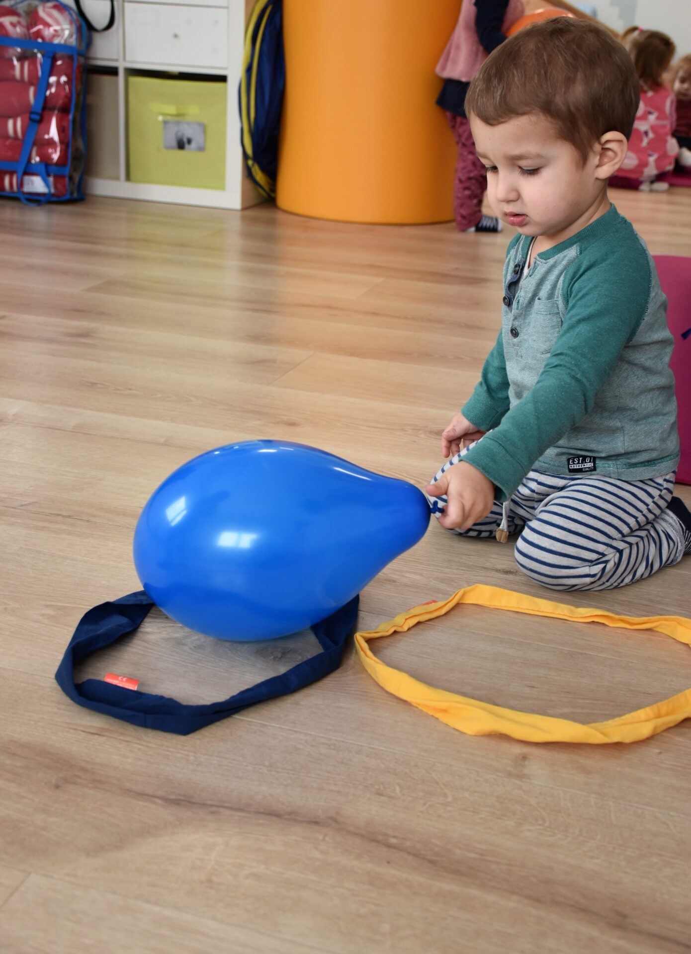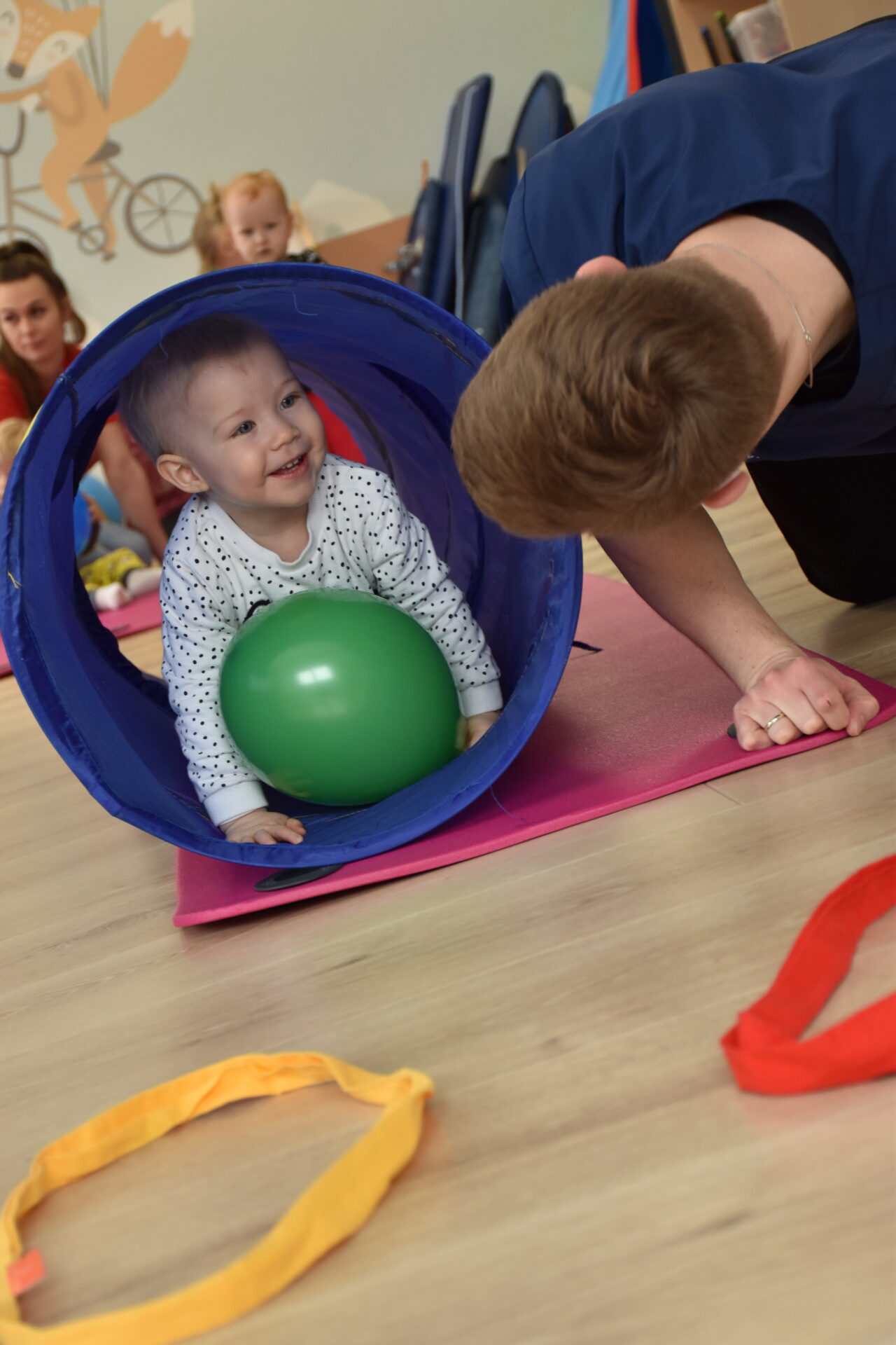 Dziś kolorowe, uwielbiane przez wszystkich balony 🙂 rozwijaliśmy dziś naszą koordynację poprzez różne zabawy ruchowe z balonami. Wykorzystaliśmy je również do rozróżniania kolorów. Każde z dzieciaków musiało się przecisnąć przez tunel razem ze swoim kolorowym towarzyszem. Było też trochę huku, bo niektóre balony pękały! BUM! Ale nie straszne nam już takie hałasy 🙂 Na koniec wujek przygotował najtrudniejsze zadanie. Próbowaliśmy wrzucić balon do beczki podczas huśtania na dużej huśtawce 🙂 to naprawdę nie było łatwe, ale bardzo przypadło do gustu dzieciom. Wujek obiecał, że powtórzymy tę zabawę za jakiś czas i zobaczymy jak nam wtedy pójdzie 🙂