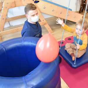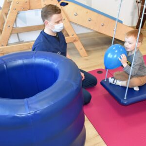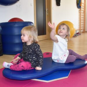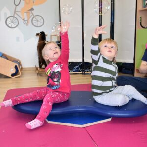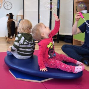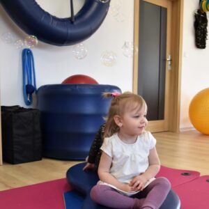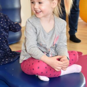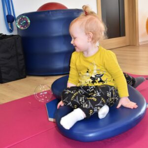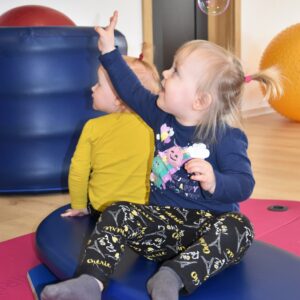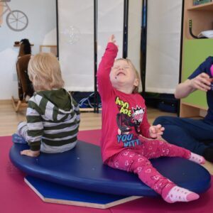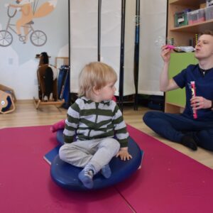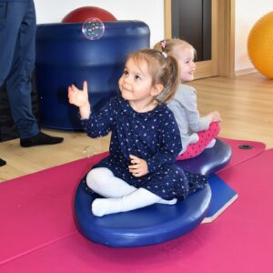 Czas na relację z naszej dzisiejszej zabawy z wujkiem Mateuszem. Grupa młodszych dzieci miała okazję kręcić się na desce rotacyjnej i zbijać bańki mydlane. Później zawijalismy się jak naleśniki a na koniec wujek masował nas piłką