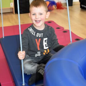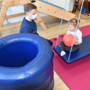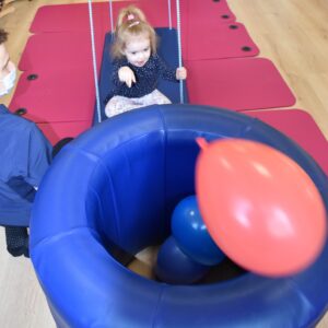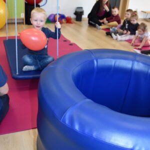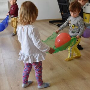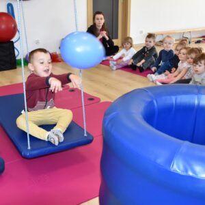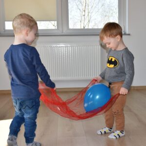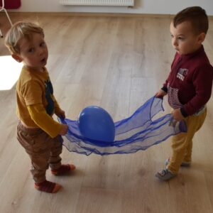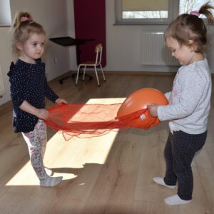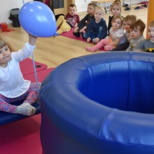Starszaki miały zadanie w parach, aby utrzymać balon na chuście trzymając za jej końce. Następnie bawiliśmy się w bieganie zgodnie z rytmem tamburyna, a gdy była cisza zastaliśmy jak posągi. Na koniec każde z dzieci bujając się na huśtawce próbowało wrzucić balon do beczki ![]()