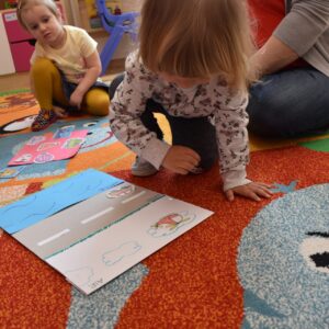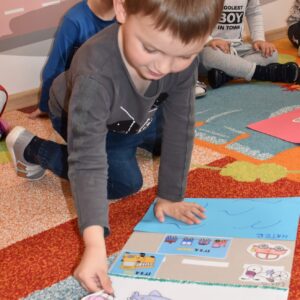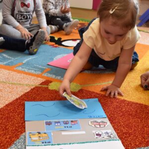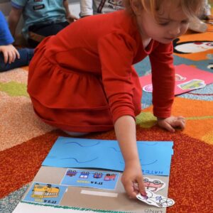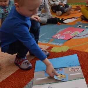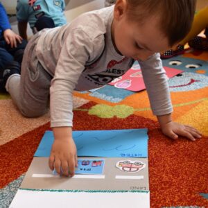Dzisiaj na zabawach z językiem angielskim AMISIAKI poznały środki transportu. Ciocia najpierw zapoznała dzieci ze słownictwem, następnie zadaniem dzieci było dopasowanie danego pojazdu do środowiska, w którym się poruszają. Kolejna zabawa polegała na tym, że AMIsiaki miały najpierw wysłuchać dźwięk pojazdu i odszukać obrazek, który go przedstawia.