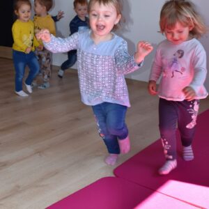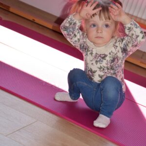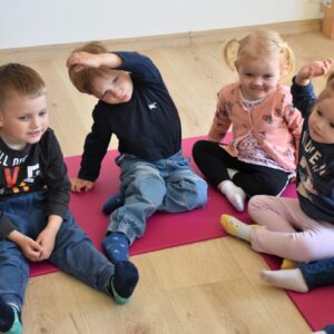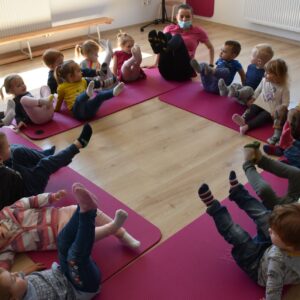 Dzisiejsze zajęcia ruchowe starszaki rozpoczęły tanecznym krokiem – świetnie sobie poradziły naśladując ruchy ciocia Iwonki. Następnie współpracowały z rówieśnikami naśladując zwierzęta, a skończyly zajęcia rozciągając się