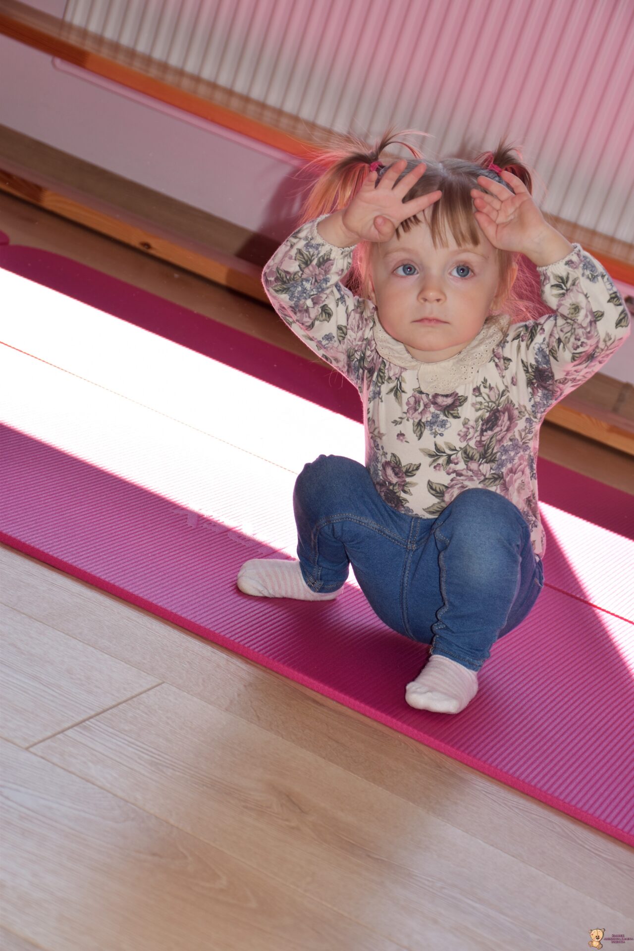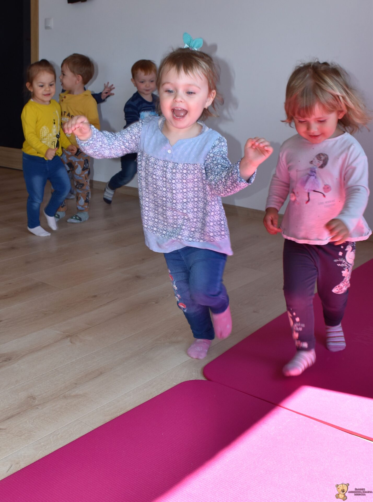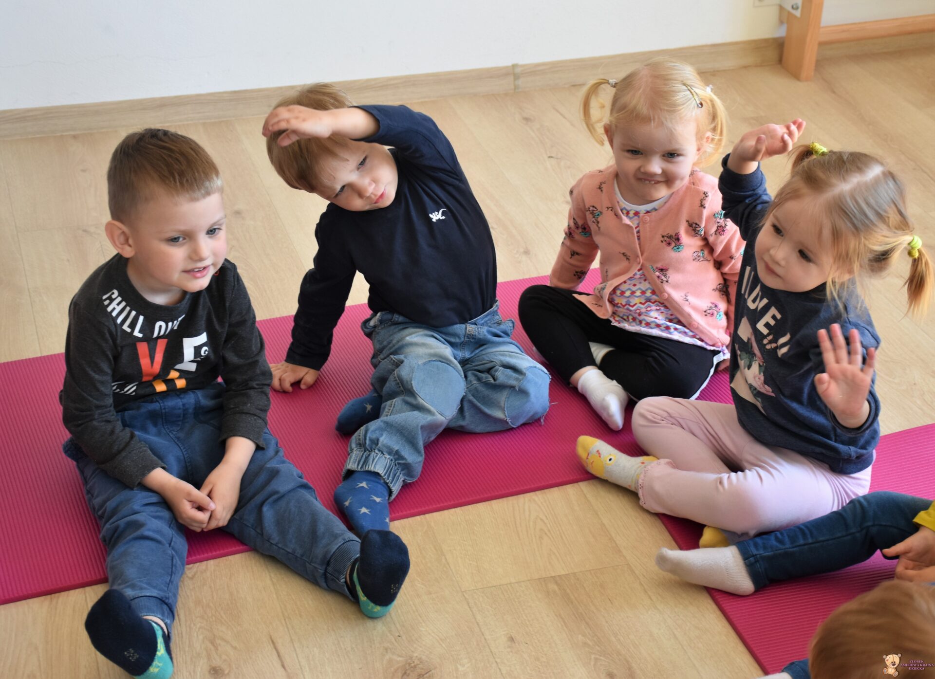 Dzisiejsze zajęcia ruchowe starszaki rozpoczęły tanecznym krokiem – świetnie sobie poradziły naśladując ruchy ciocia Iwonki. Następnie współpracowały z rówieśnikami naśladując zwierzęta, a skończyly zajęcia rozciągając się