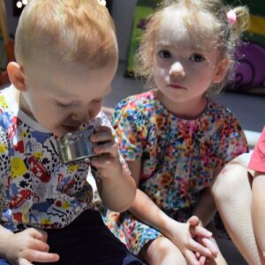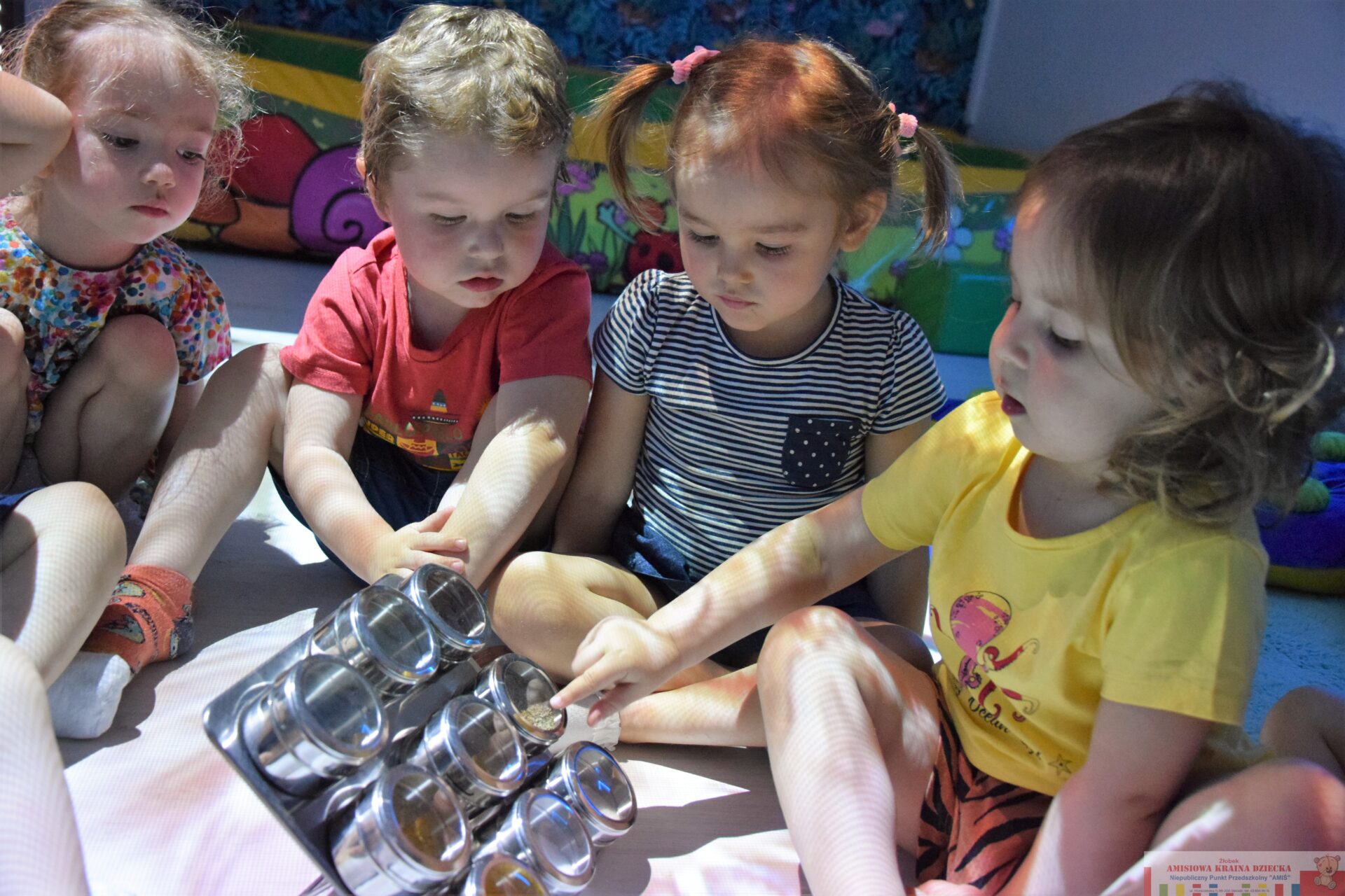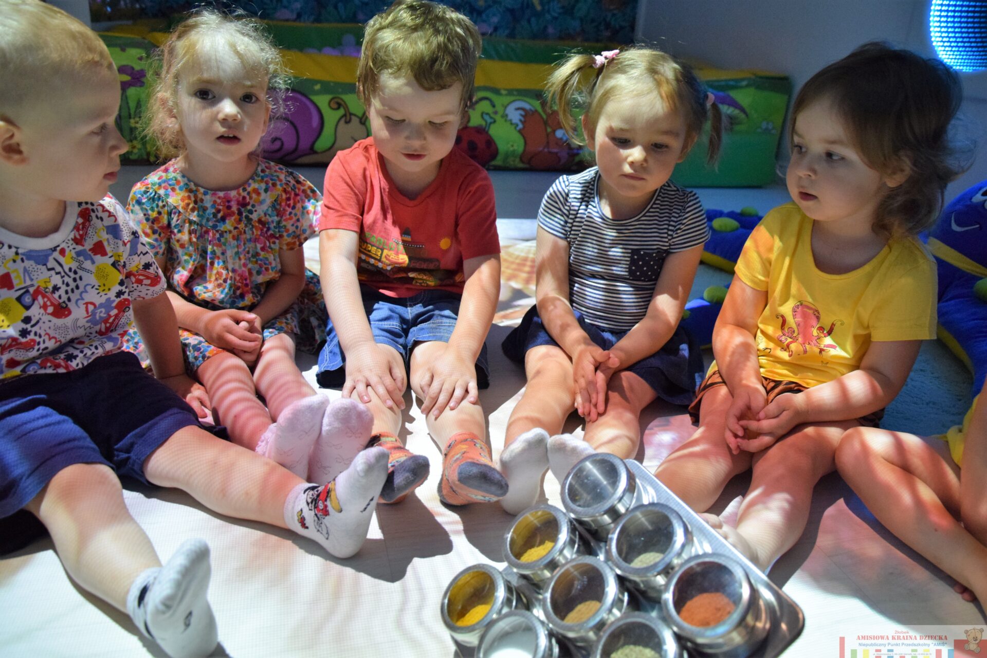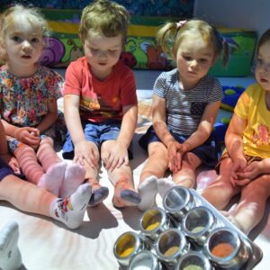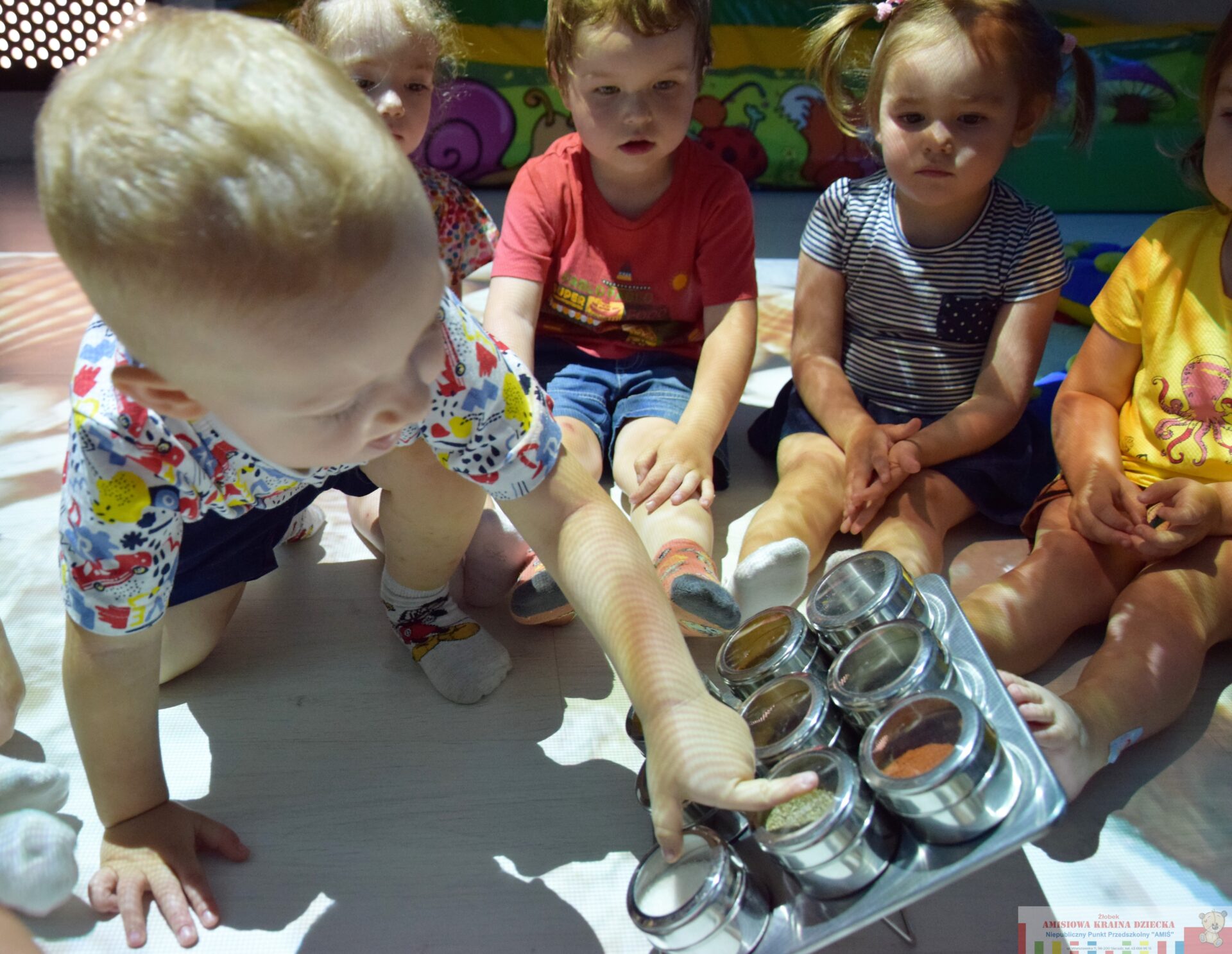 Dziś na Sali Doświadczania Świata stymulowaliśmy zmysł węchu i smaku. Razem z ciociami bawiliśmy się w,, co to jest?” oraz próbowaliśmy smaków różnych przypraw. Dzięki temu doskonaliliśmy procesy poznawcze, wrażliwość i czułość.