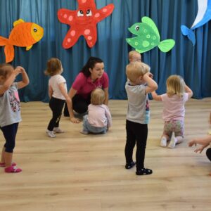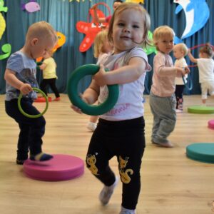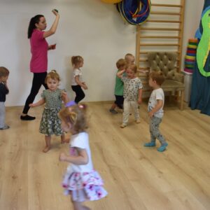 To już rytuał, ze zajęcia z Ciocia Iwonka rozpoczynają się od muzycznej rozgrzewki – tym razem – „skaczemy biegniemy”. Dzieciaki z uśmiechem naśladowały tekst piosenki – skaczemy, biegniemy, ćwiczymy, tańczymy.