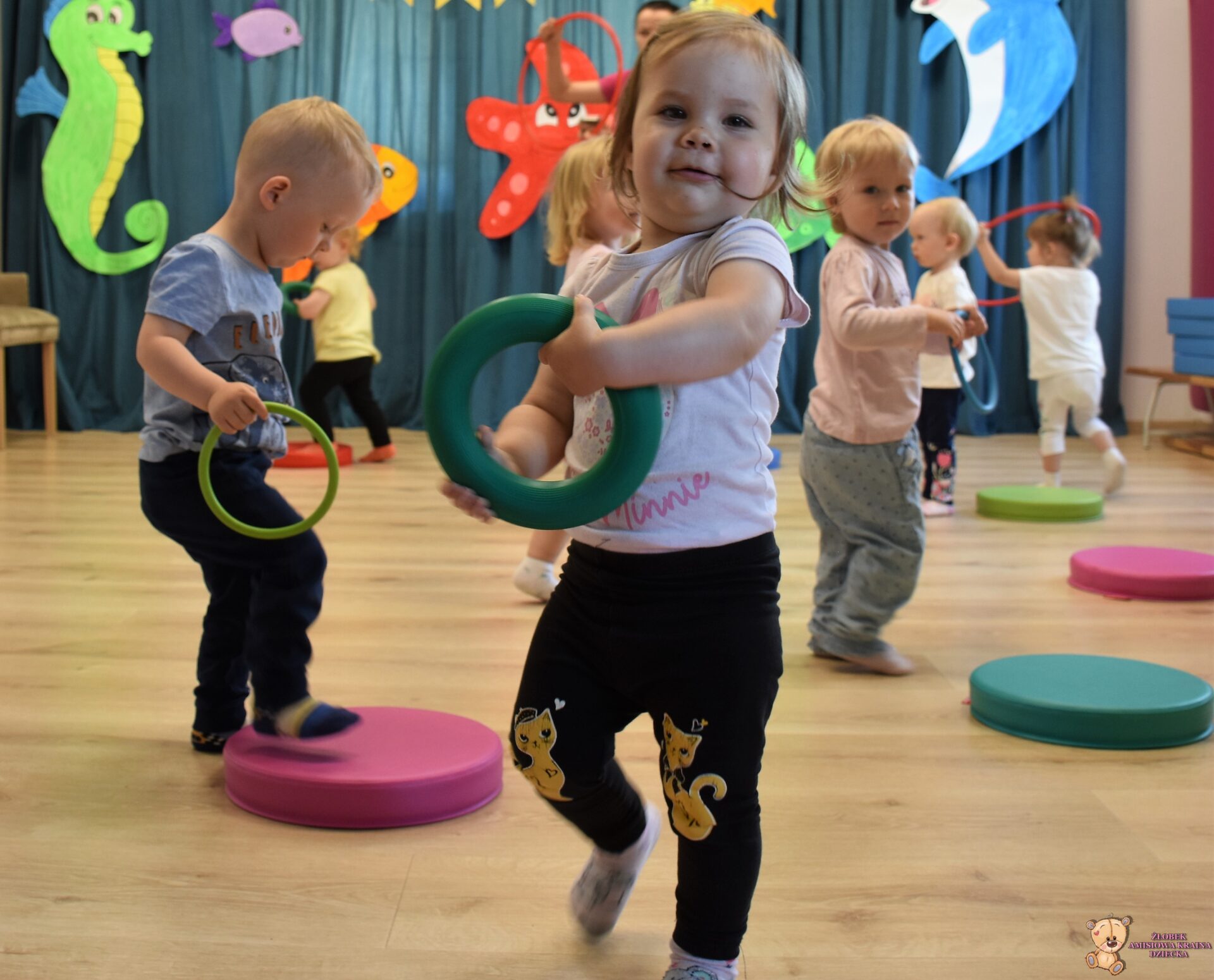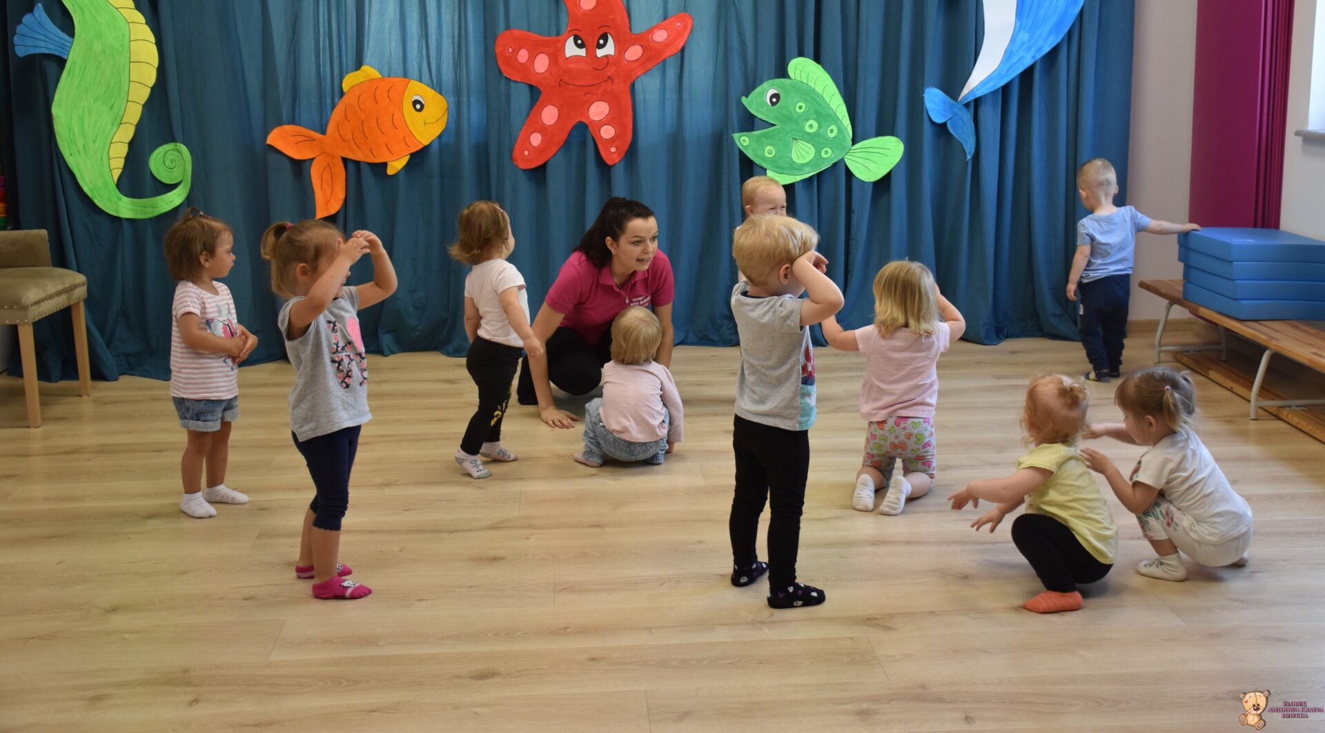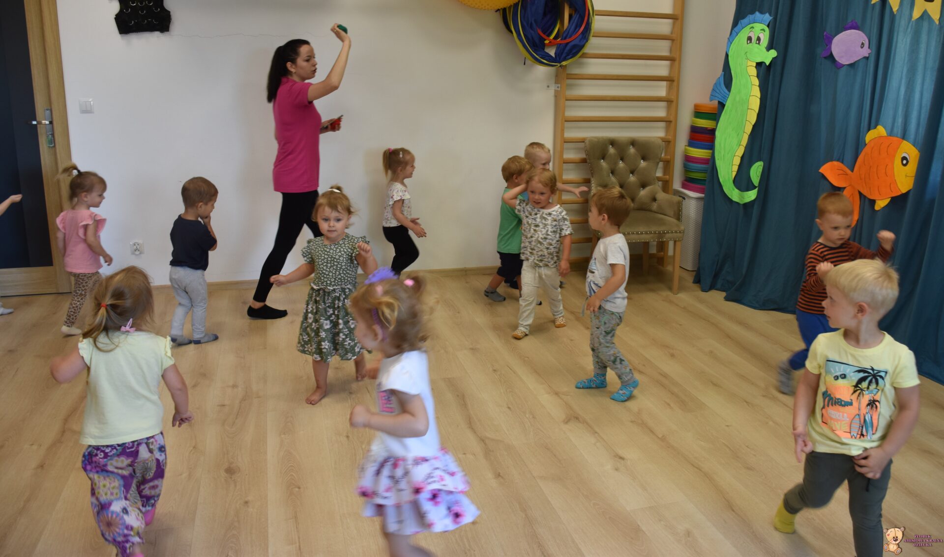 To już rytuał, ze zajęcia z Ciocia Iwonka rozpoczynają się od muzycznej rozgrzewki – tym razem – „skaczemy biegniemy”. Dzieciaki z uśmiechem naśladowały tekst piosenki – skaczemy, biegniemy, ćwiczymy, tańczymy.