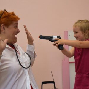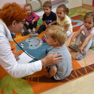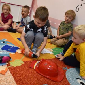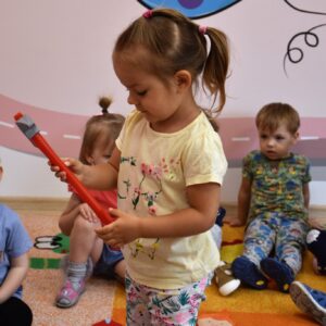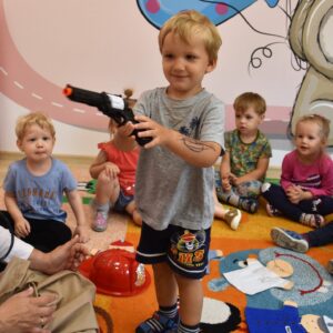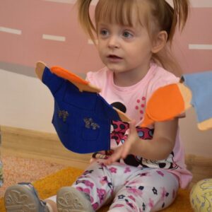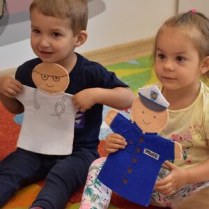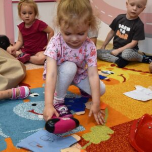 ,które bardzo spodobały się dzieciom. Następnie AMIsiaki z tajemniczego worka wyjmowały narzędzia pomocne w wykonywaniu danego zawodu i ich zadaniem bylo dopasowanie do konkretnej pacynki.