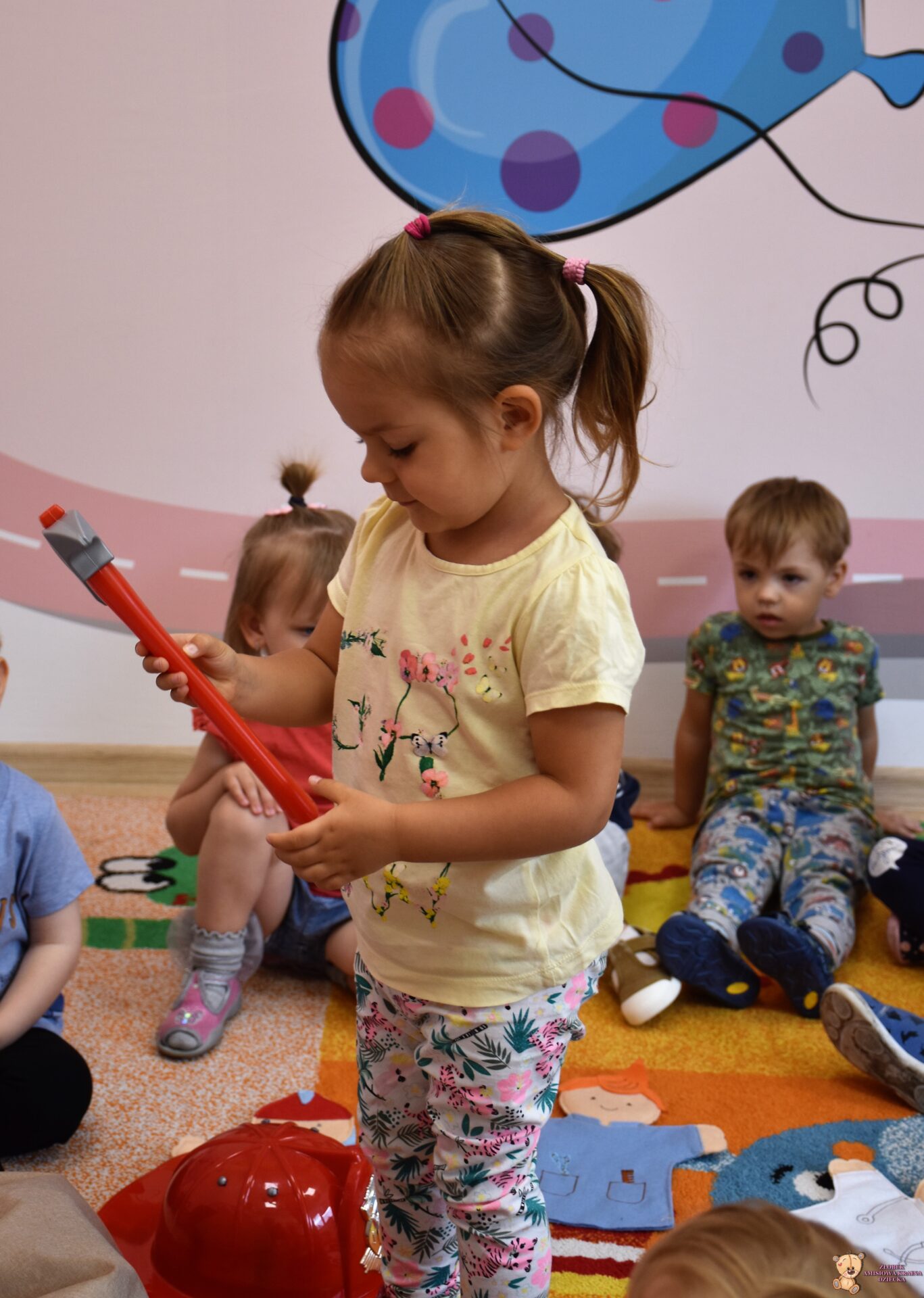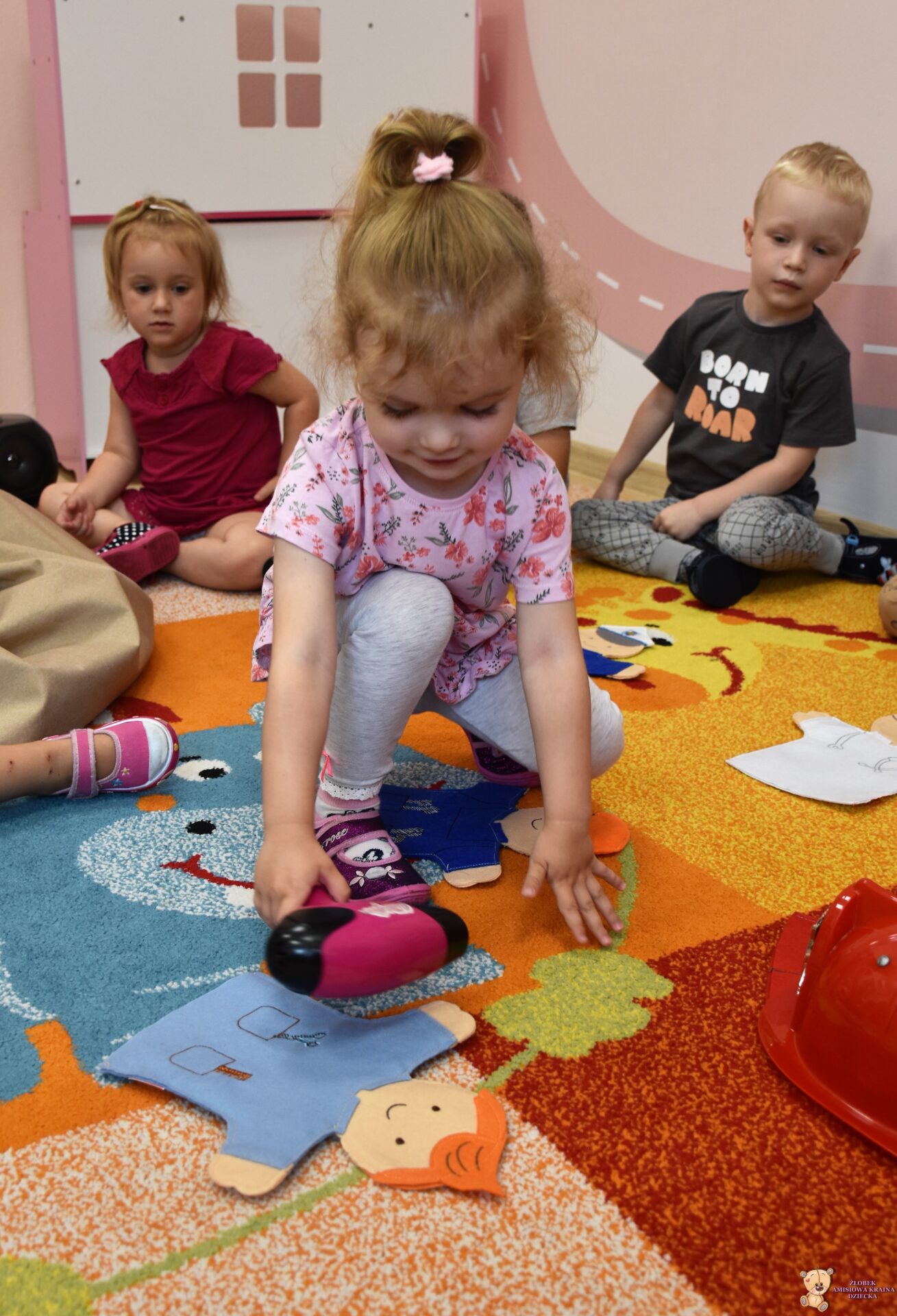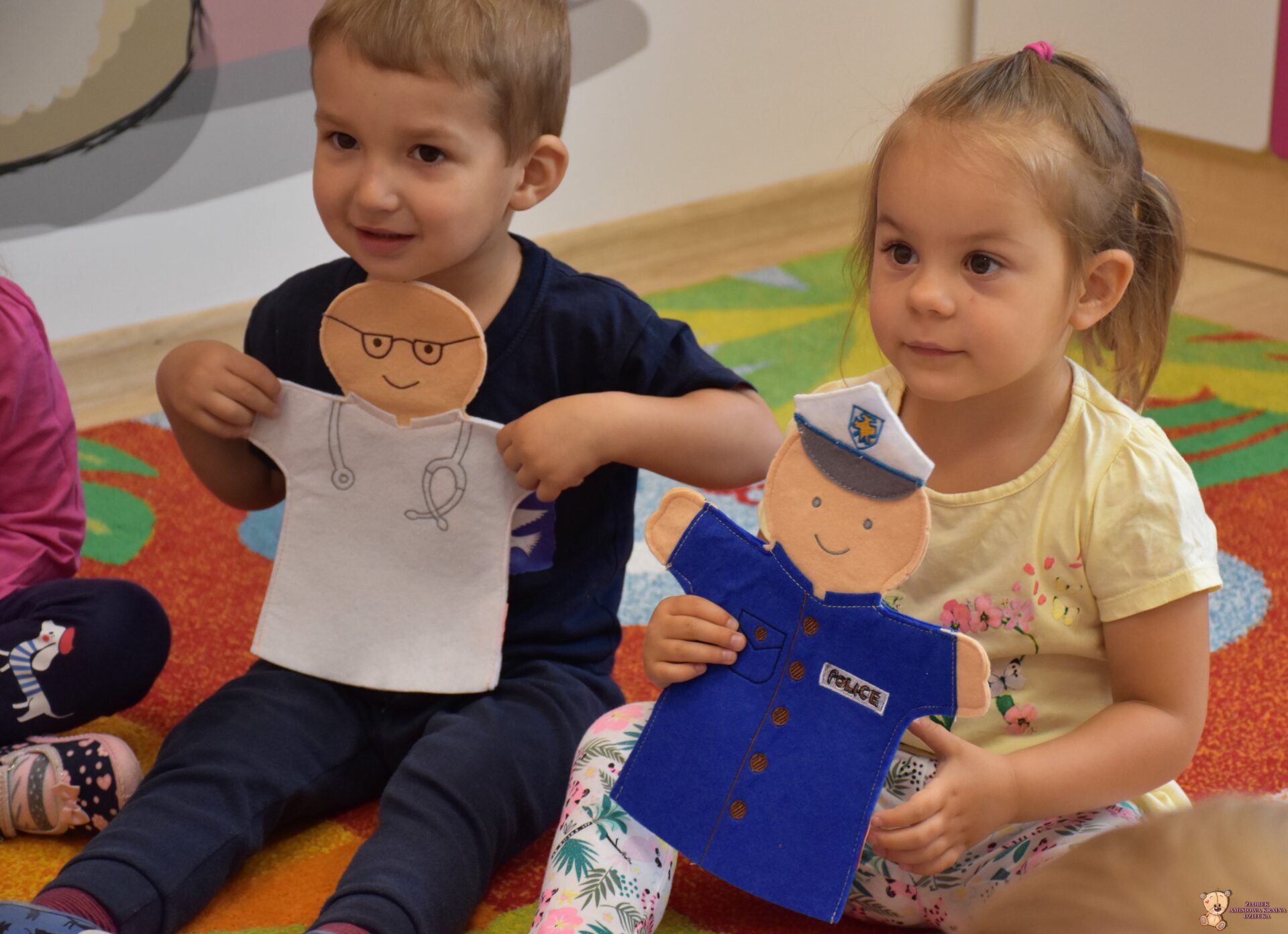 ,które bardzo spodobały się dzieciom. Następnie AMIsiaki z tajemniczego worka wyjmowały narzędzia pomocne w wykonywaniu danego zawodu i ich zadaniem bylo dopasowanie do konkretnej pacynki.