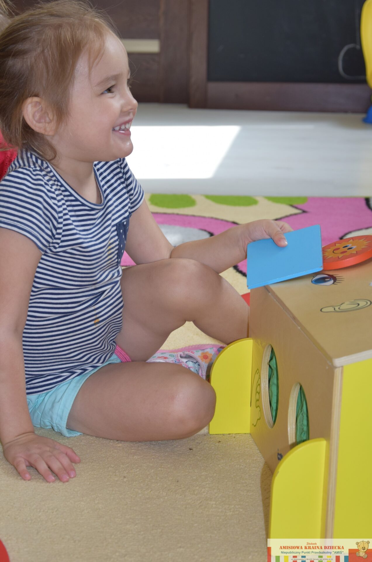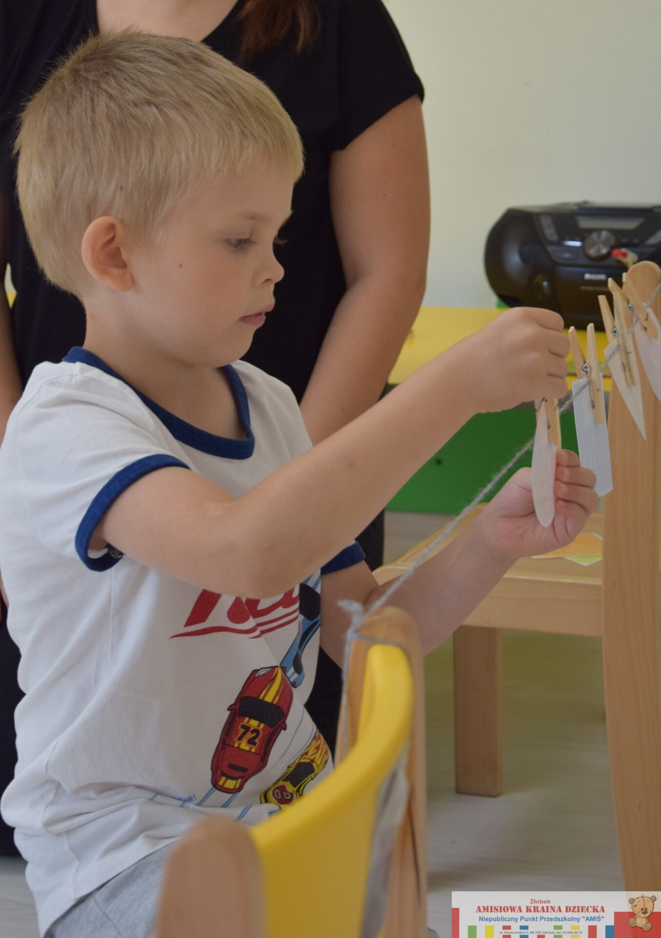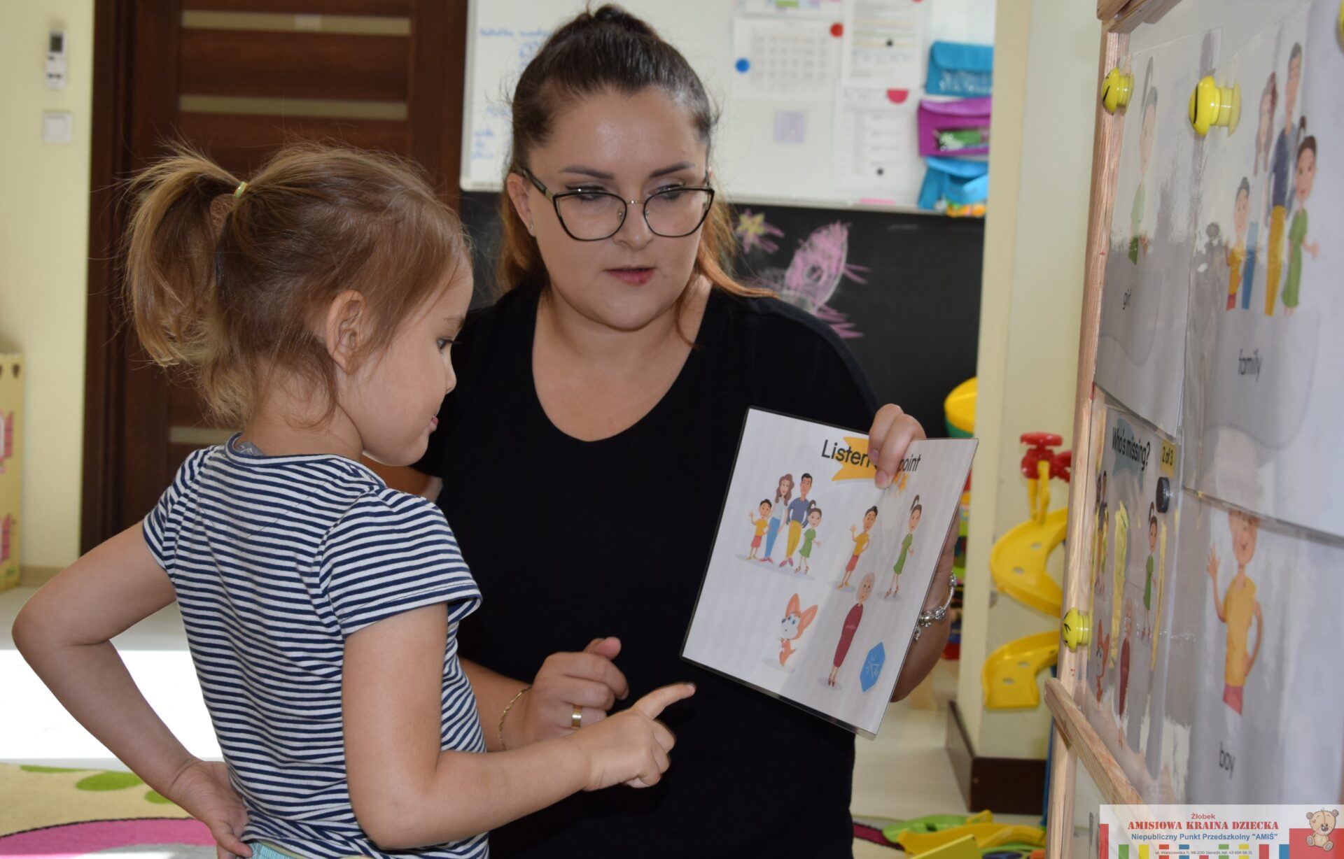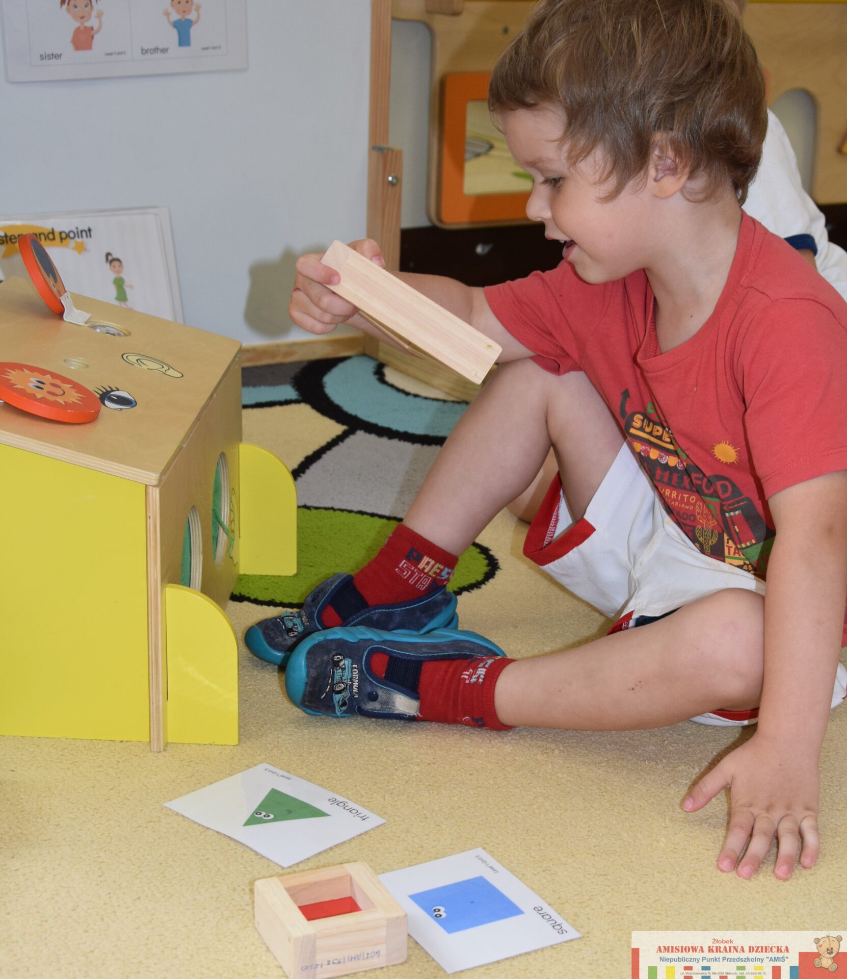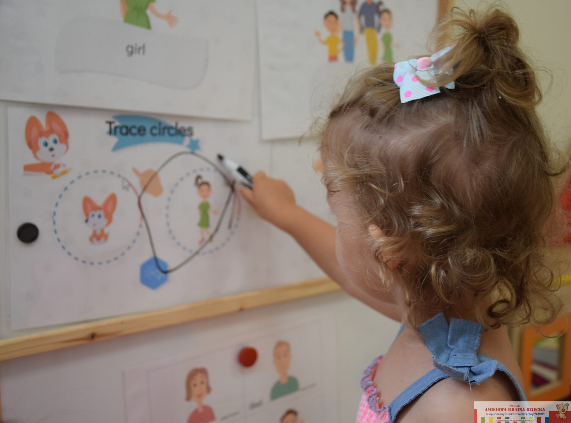 Dzisiaj Dzieci z AMIsiowej Krainy brały udział w zajęciach dydaktycznych z elementami języka angielskiego. Utrwalały znajomość nazw członków rodziny oraz rozwijały motorykę małą. Poznały także nazwy figur geometrycznych (a circle, a triangle, a square). AMIsie rozwijały również umiejętności matematyczne poprzez tworzenie rytmów z poznanych figur geometrycznych według podanego przez ciocię wzoru, jak również poprzez klasyfikację przedmiotów według danej cechy. Dzieci dzięki dobrej zabawie poszerzały swoją wiedzę i umiejętności zarówno z języka angielskiego, jak i z matematyki.