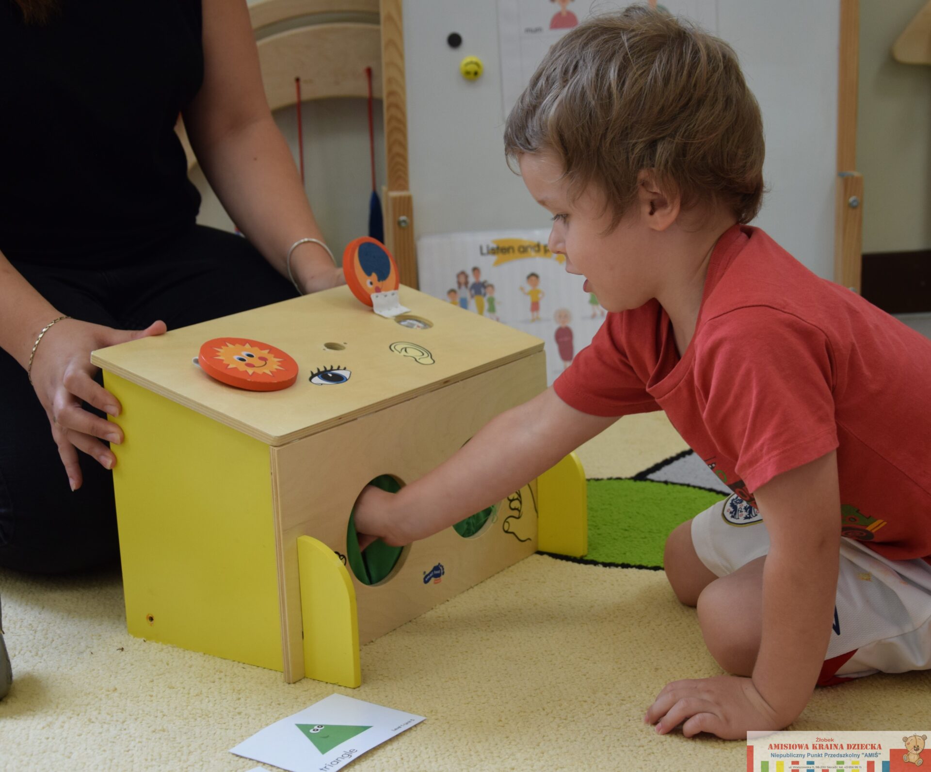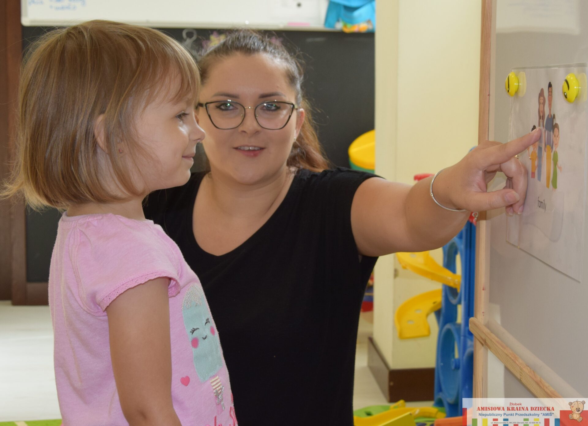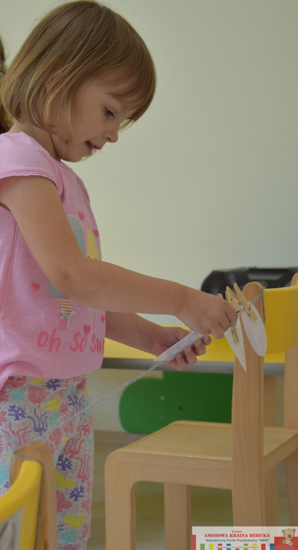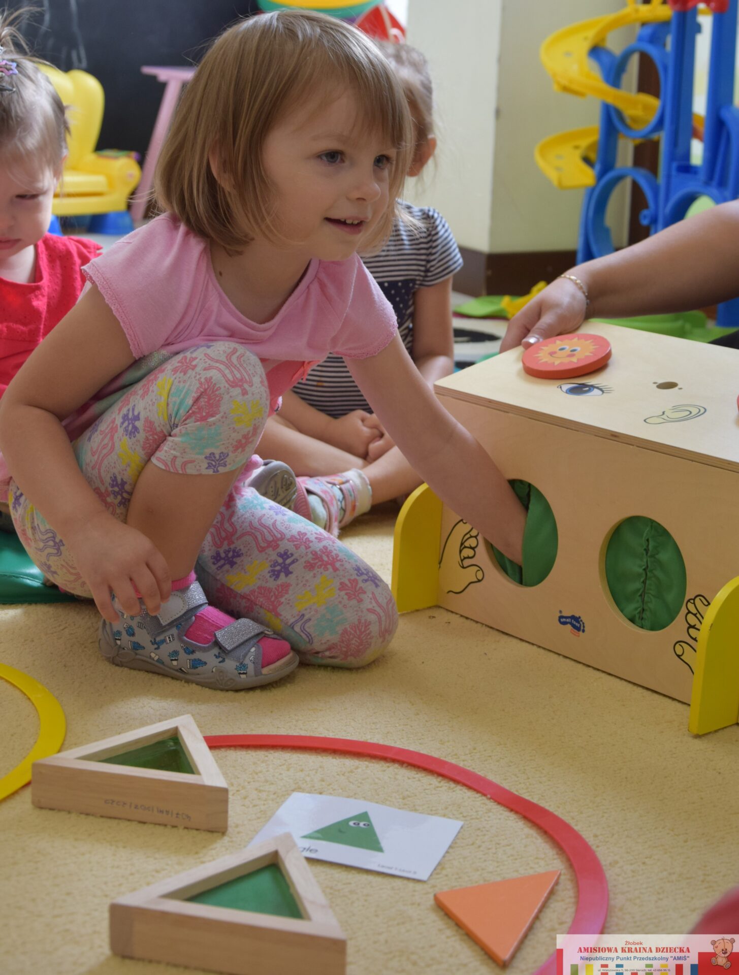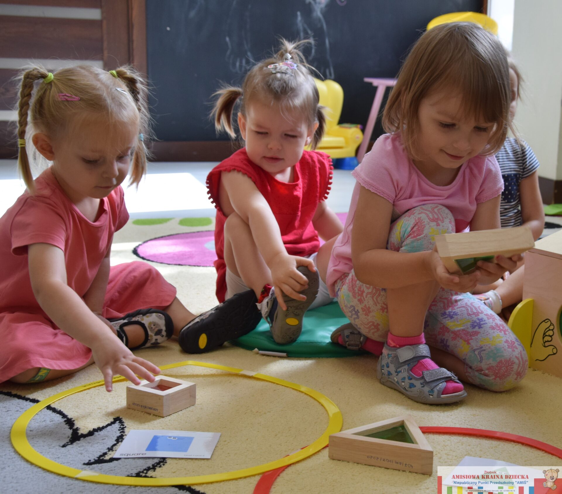 Dzisiaj Dzieci z AMIsiowej Krainy brały udział w zajęciach dydaktycznych z elementami języka angielskiego. Utrwalały znajomość nazw członków rodziny oraz rozwijały motorykę małą. Poznały także nazwy figur geometrycznych (a circle, a triangle, a square). AMIsie rozwijały również umiejętności matematyczne poprzez tworzenie rytmów z poznanych figur geometrycznych według podanego przez ciocię wzoru, jak również poprzez klasyfikację przedmiotów według danej cechy. Dzieci dzięki dobrej zabawie poszerzały swoją wiedzę i umiejętności zarówno z języka angielskiego, jak i z matematyki.