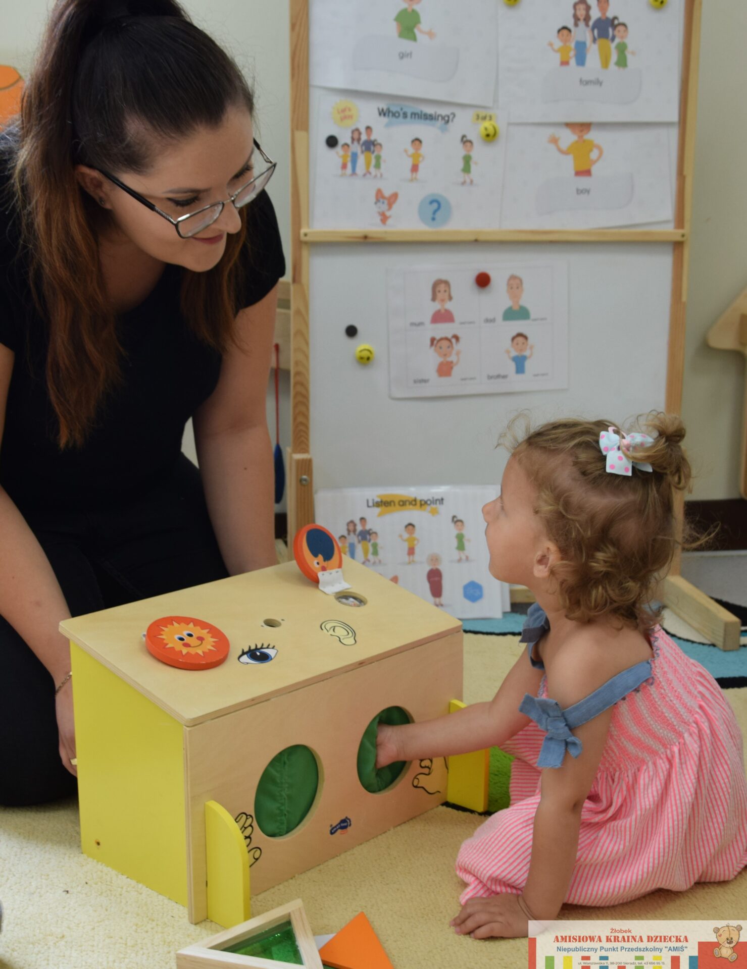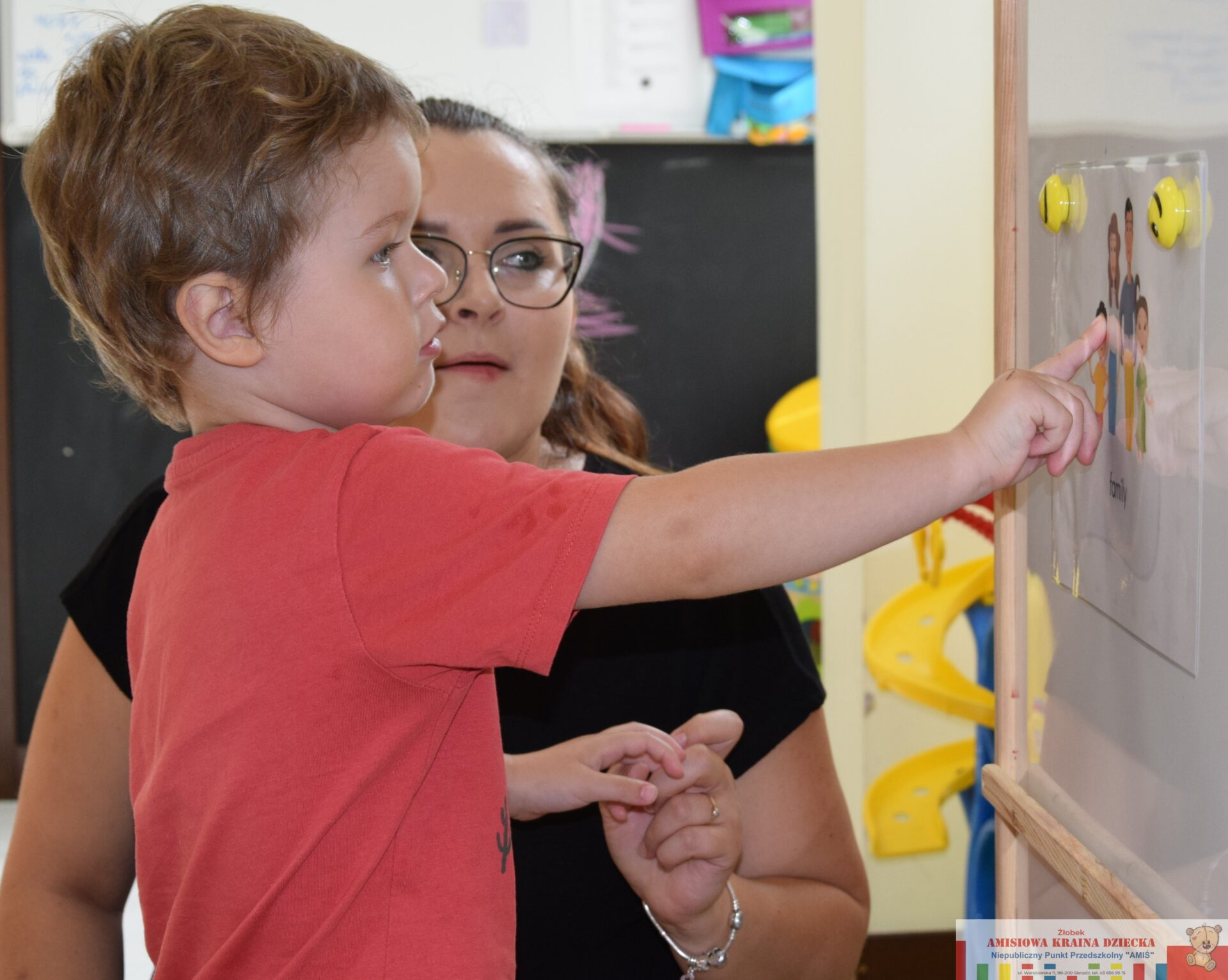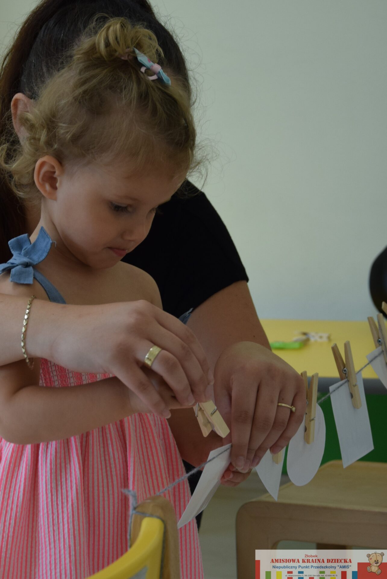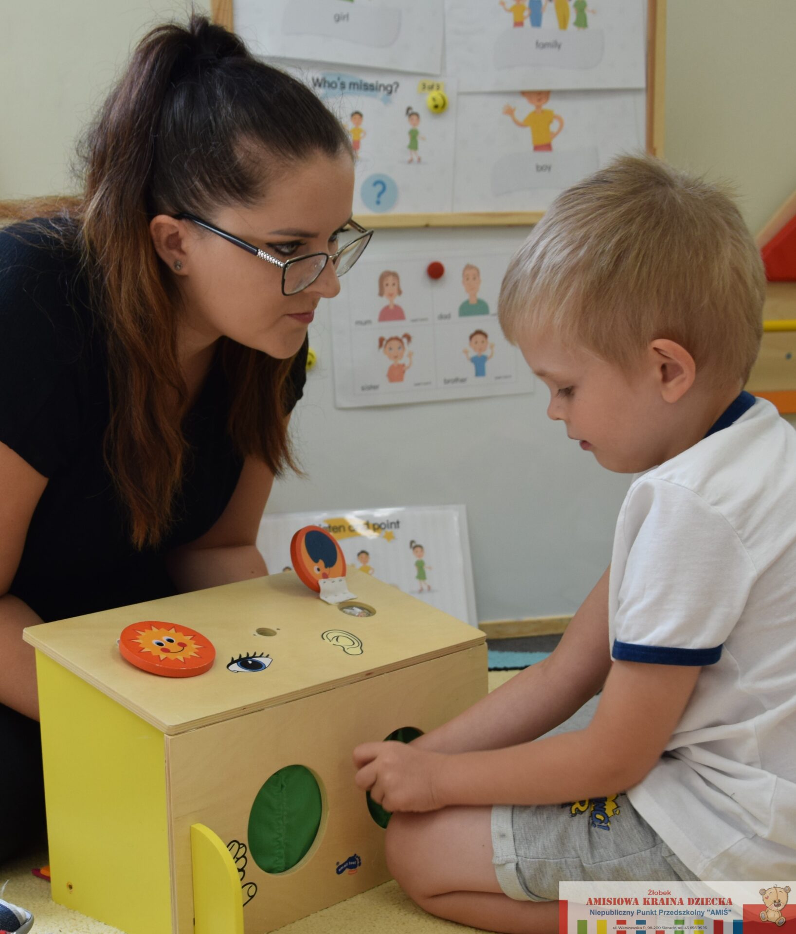 Dzisiaj Dzieci z AMIsiowej Krainy brały udział w zajęciach dydaktycznych z elementami języka angielskiego. Utrwalały znajomość nazw członków rodziny oraz rozwijały motorykę małą. Poznały także nazwy figur geometrycznych (a circle, a triangle, a square). AMIsie rozwijały również umiejętności matematyczne poprzez tworzenie rytmów z poznanych figur geometrycznych według podanego przez ciocię wzoru, jak również poprzez klasyfikację przedmiotów według danej cechy. Dzieci dzięki dobrej zabawie poszerzały swoją wiedzę i umiejętności zarówno z języka angielskiego, jak i z matematyki.