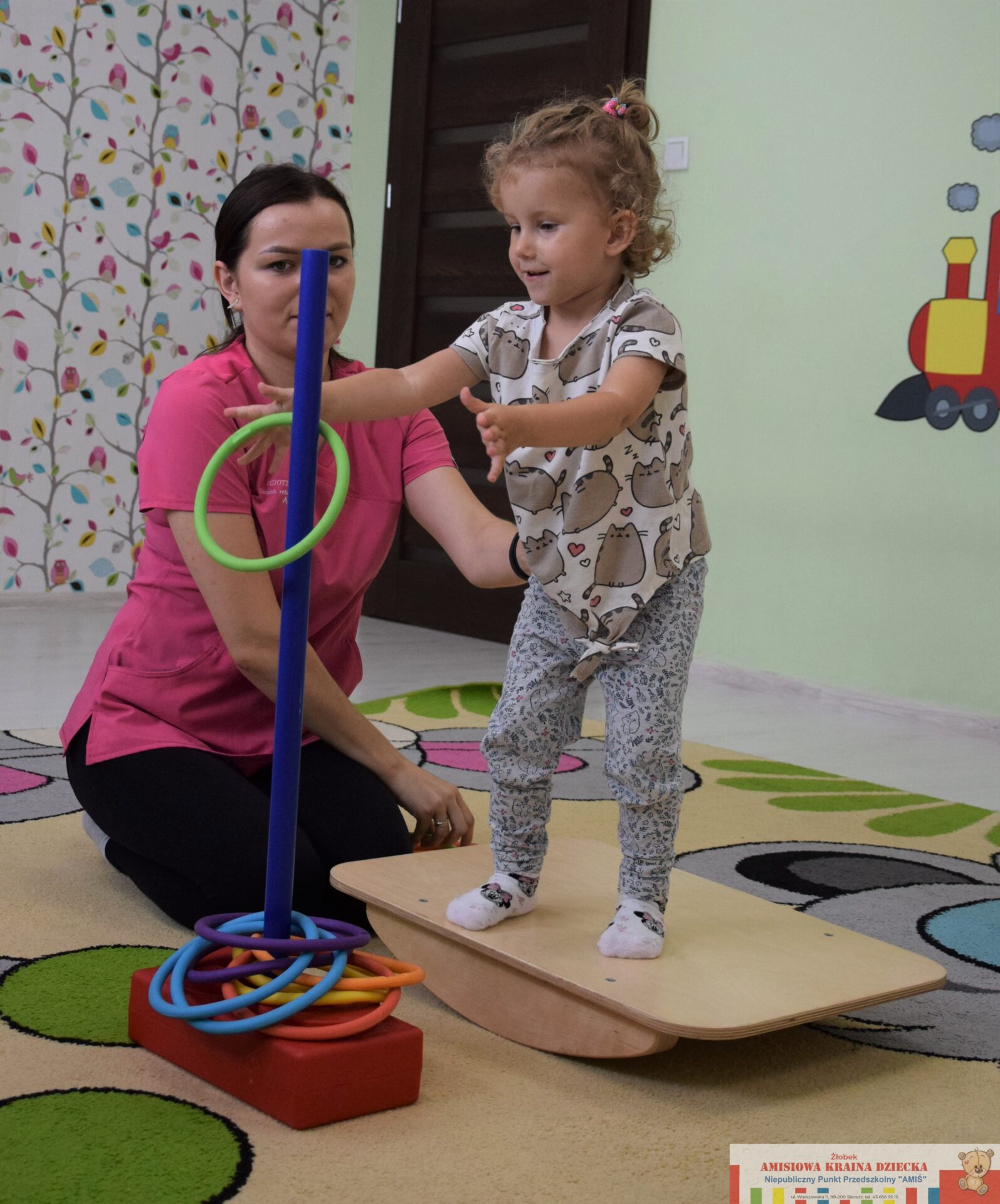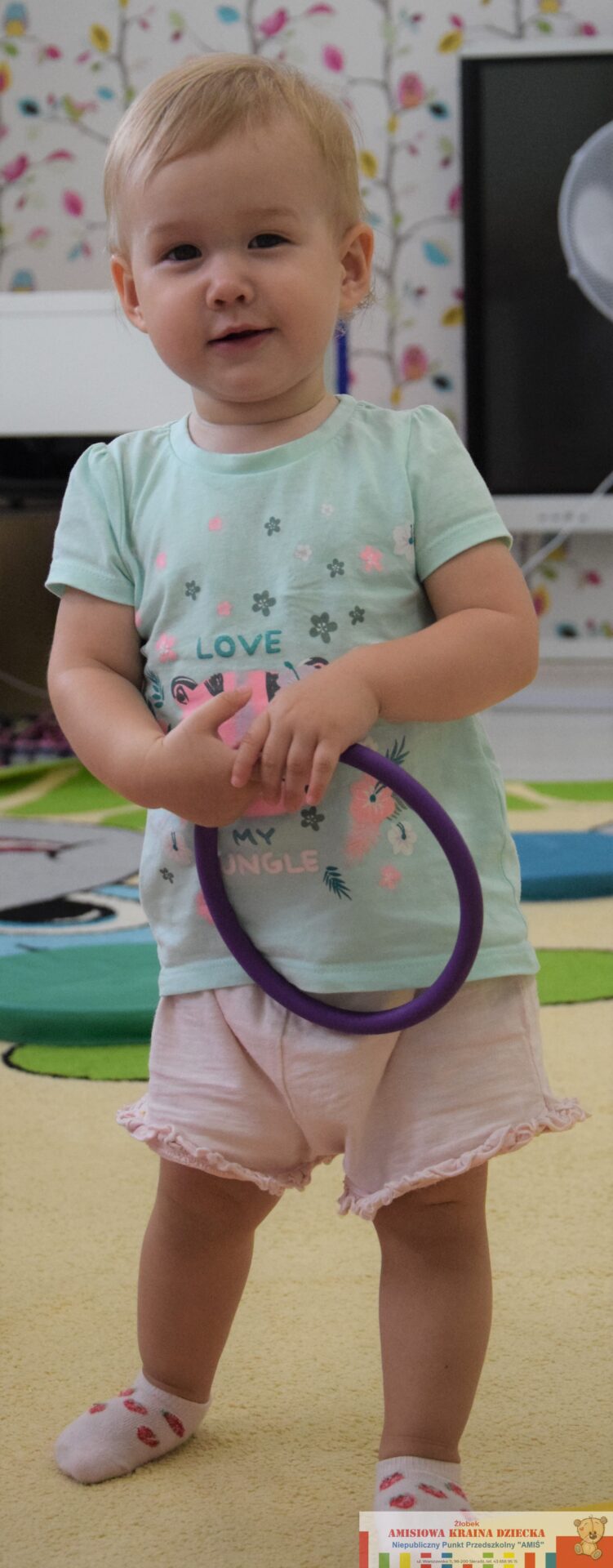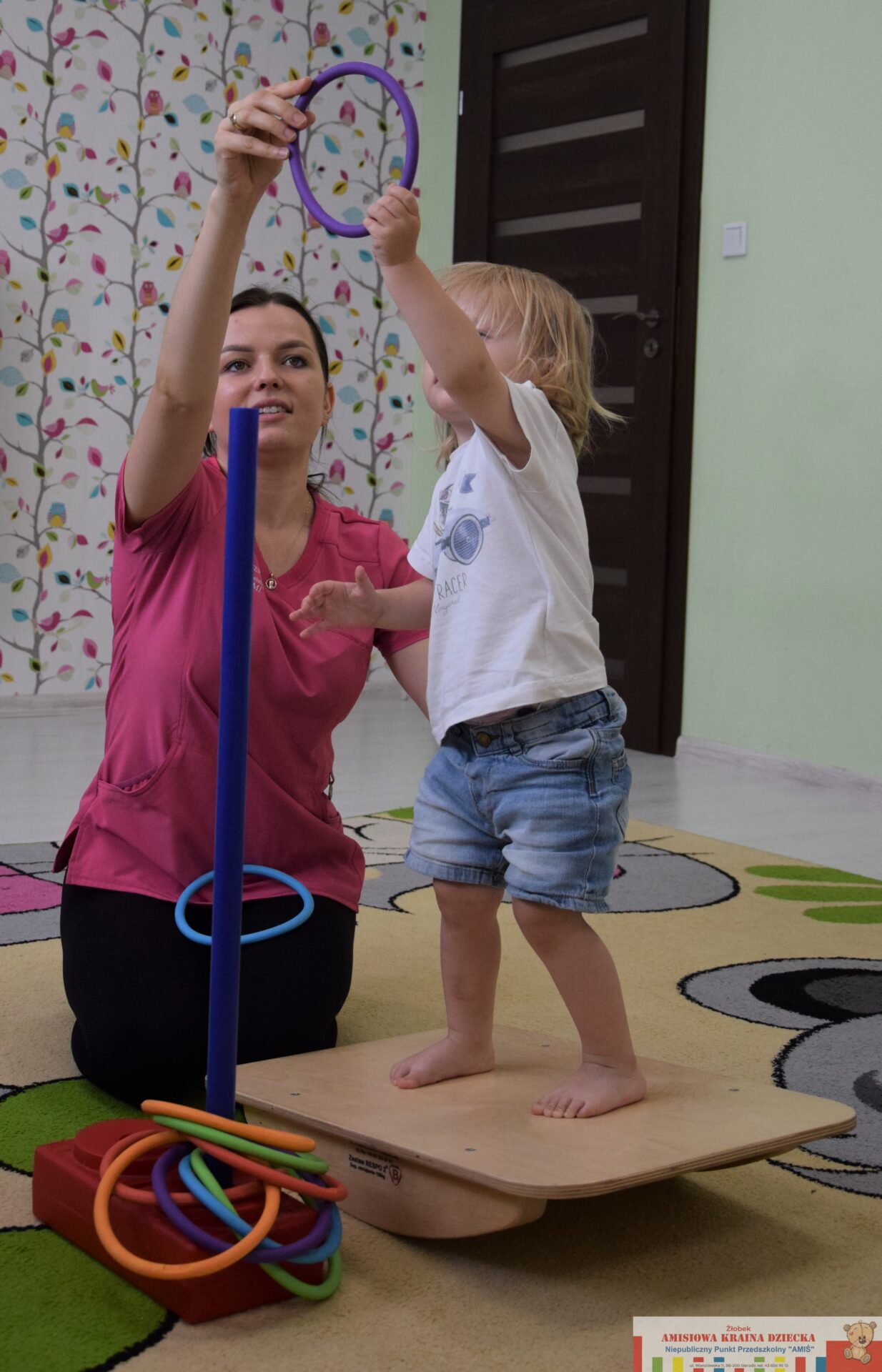Dzisiaj Żłobek AMIsiowa Kraina Dziecka w Sieradzu odwiedziła ciocia Iwonka. Podczas zajęć z ciocią dzieci rozwijały zmysł równowagi balansując ciałem na równoważni oraz motorykę i celność poprzez rzut okręgiem na patyk. Ciocia przygotowała dla naszych maluszków również zadania związane z ich ulubioną piłką. Jak zawsze AMIsie dzielnie i ochoczo wzięły udział w cotygodniowych ćwiczeniach.
