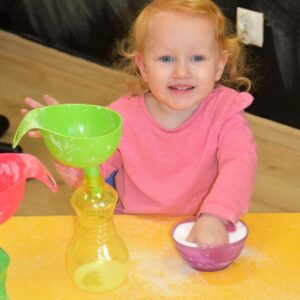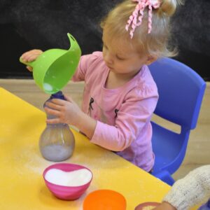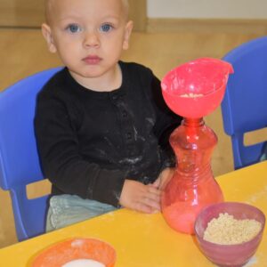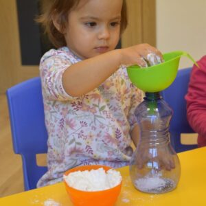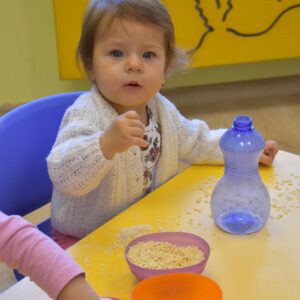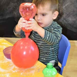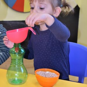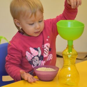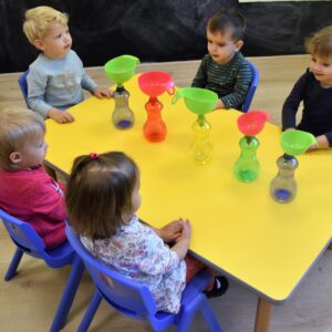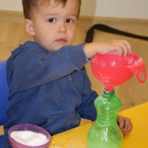 W ramach dzisiejszych zajęć z sensoplastyki dzieci miały okazję stworzyć własnoręcznie sensoryczne gniotki. Do przygotowanych kolorowych butelek, dzieci przesypywały suche produkty spożywcze: mąkę, sól, drobny makaron itd.  Następnie na butelki nakładaliśmy nadmuchane z pomocą cioci balony, by przesypać do nich zawartość butelek. Tak wypełnione balony, po zawiązaniu, zamieniły się w kolorowe gniotki. Dzieci podczas zajęć ćwiczyły motorykę małą, pobudzały swoją wyobraźnię i relaksowały się gniotąc w rączkach samodzielnie stworzone zabawki. 🙂