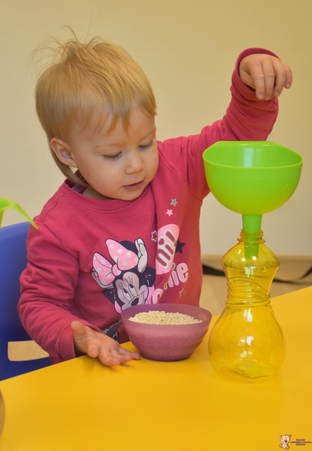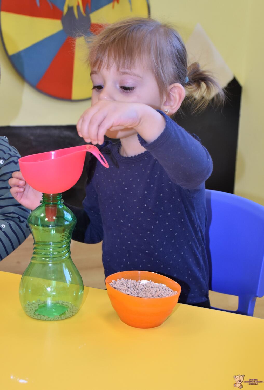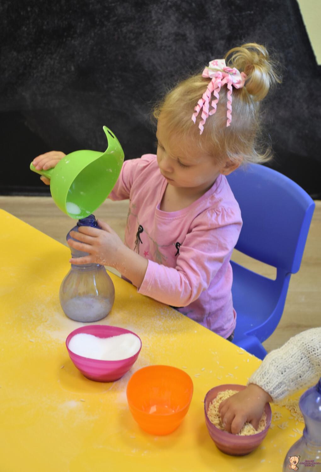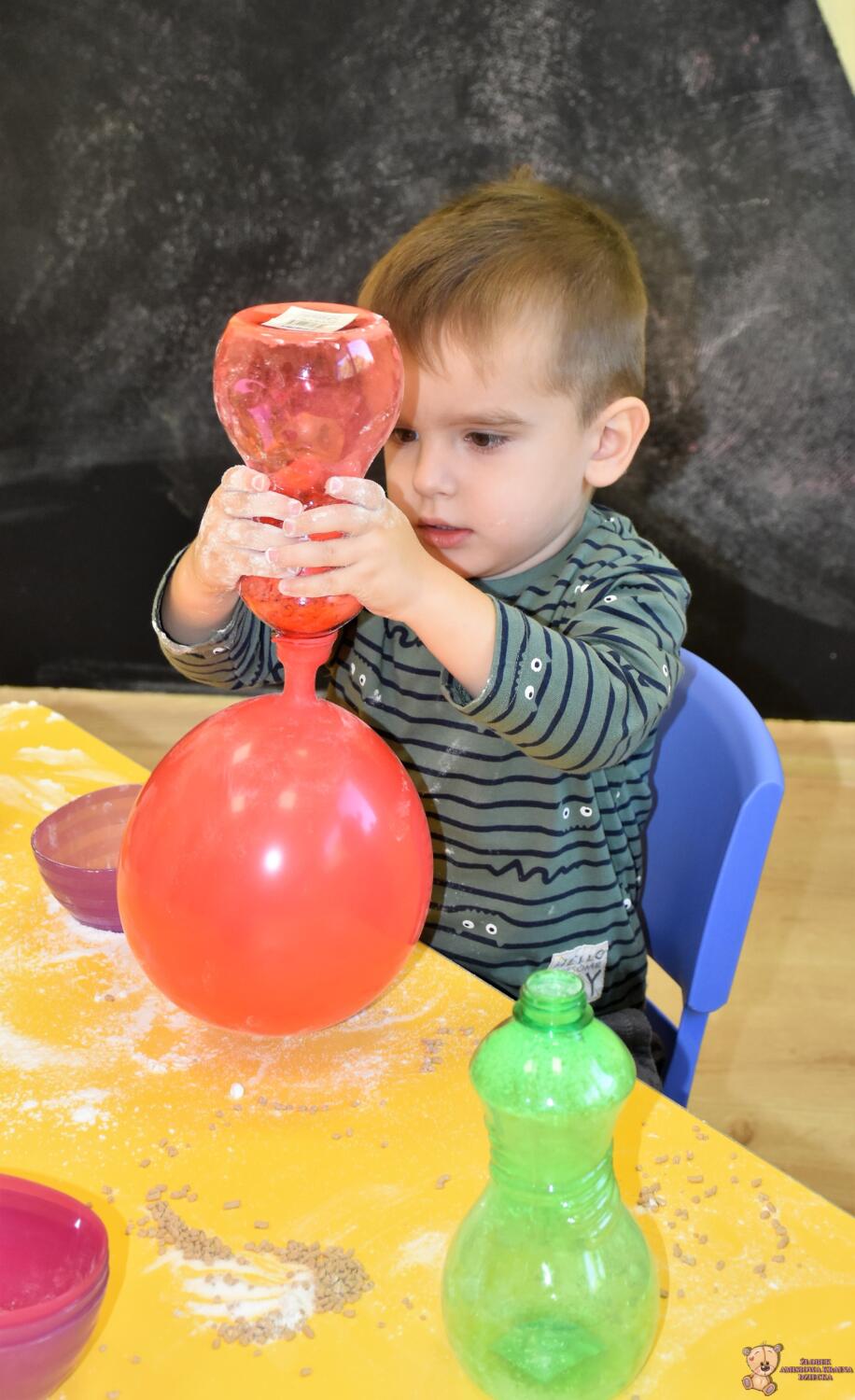 W ramach dzisiejszych zajęć z sensoplastyki dzieci miały okazję stworzyć własnoręcznie sensoryczne gniotki. Do przygotowanych kolorowych butelek, dzieci przesypywały suche produkty spożywcze: mąkę, sól, drobny makaron itd.  Następnie na butelki nakładaliśmy nadmuchane z pomocą cioci balony, by przesypać do nich zawartość butelek. Tak wypełnione balony, po zawiązaniu, zamieniły się w kolorowe gniotki. Dzieci podczas zajęć ćwiczyły motorykę małą, pobudzały swoją wyobraźnię i relaksowały się gniotąc w rączkach samodzielnie stworzone zabawki. 🙂