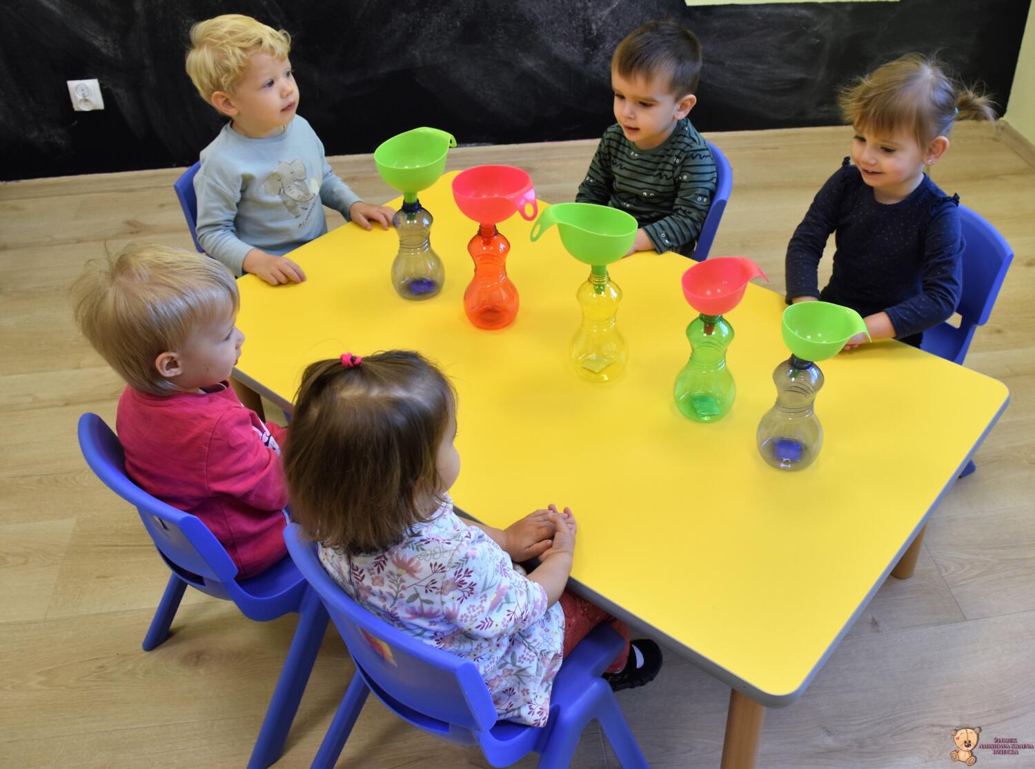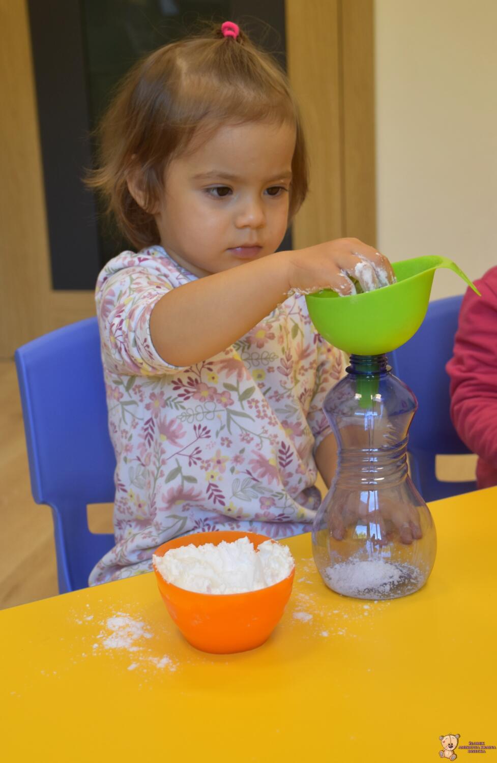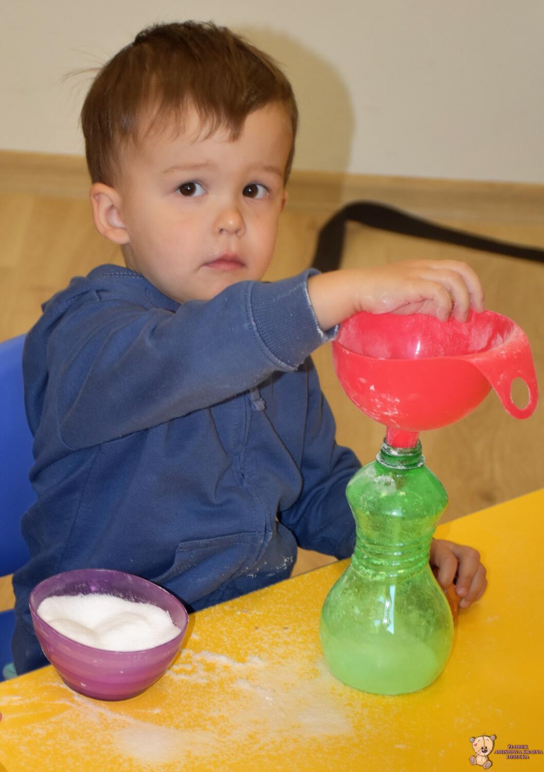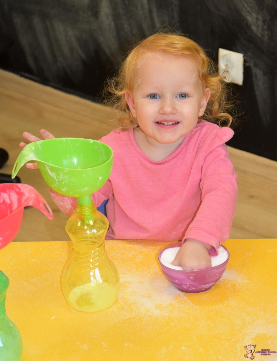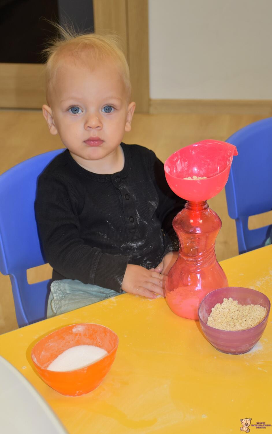 W ramach dzisiejszych zajęć z sensoplastyki dzieci miały okazję stworzyć własnoręcznie sensoryczne gniotki. Do przygotowanych kolorowych butelek, dzieci przesypywały suche produkty spożywcze: mąkę, sól, drobny makaron itd.  Następnie na butelki nakładaliśmy nadmuchane z pomocą cioci balony, by przesypać do nich zawartość butelek. Tak wypełnione balony, po zawiązaniu, zamieniły się w kolorowe gniotki. Dzieci podczas zajęć ćwiczyły motorykę małą, pobudzały swoją wyobraźnię i relaksowały się gniotąc w rączkach samodzielnie stworzone zabawki. 🙂