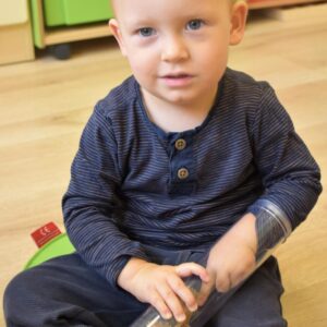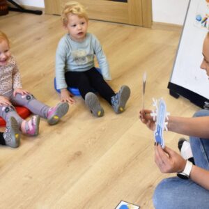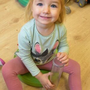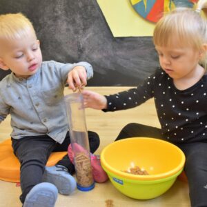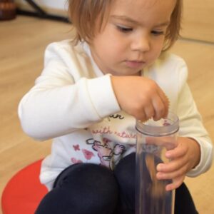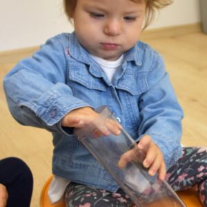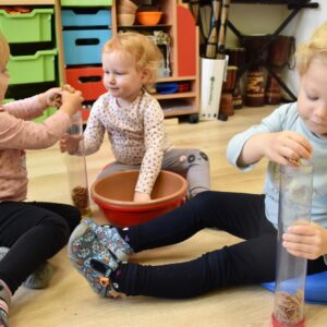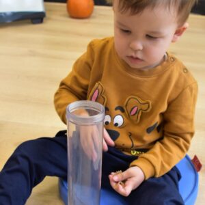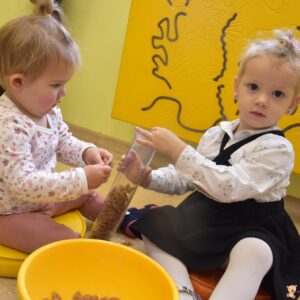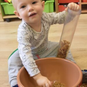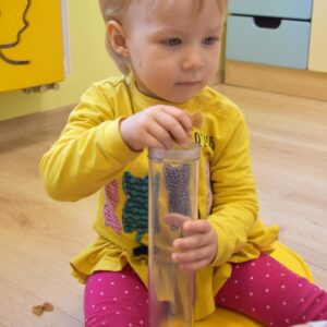 Dziś na zajęciach metodą Montessori AMIsiaki zajęły się wypełnianiem tub sensorycznych makaronem. Rozwijały w ten sposób swoje małe paluszki.  Poznawały świat za pomocą dotyku i słuchu grając na nich.