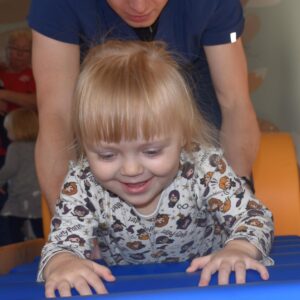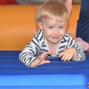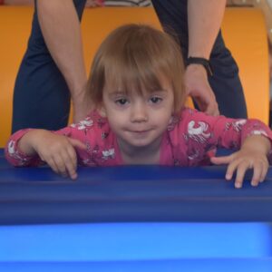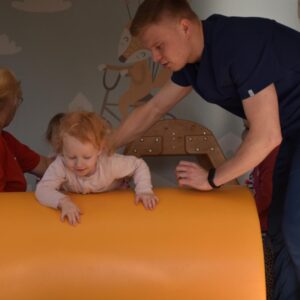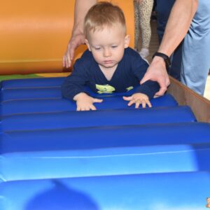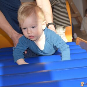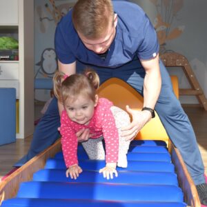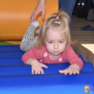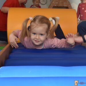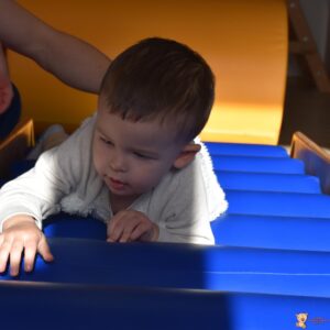 Dzisiaj nasze Skarby pokonywały tor przeszkód, wspinały się pod górę, przetaczały po wałku, a następnie pełzały po zjeżdżalni z wałków