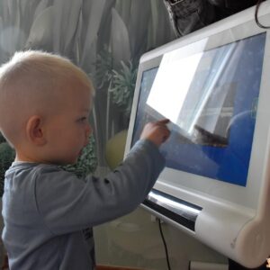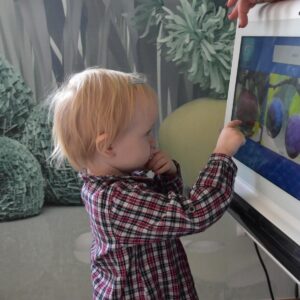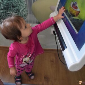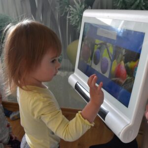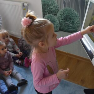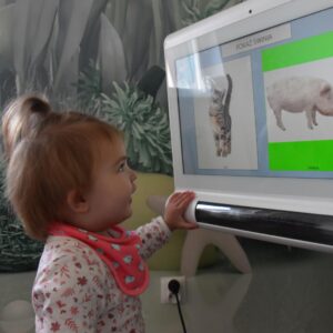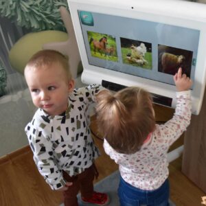 Dziś wizyta w gabinecie logopedycznym i praca na sprzęcie C- eye. Rozmawialiśmy o jesieni, dzieci zaznaczały na cyberoku wcześniej poznane dary. Nasi najmłodsi milusińscy naśladowały zwierzątka gospodarskie