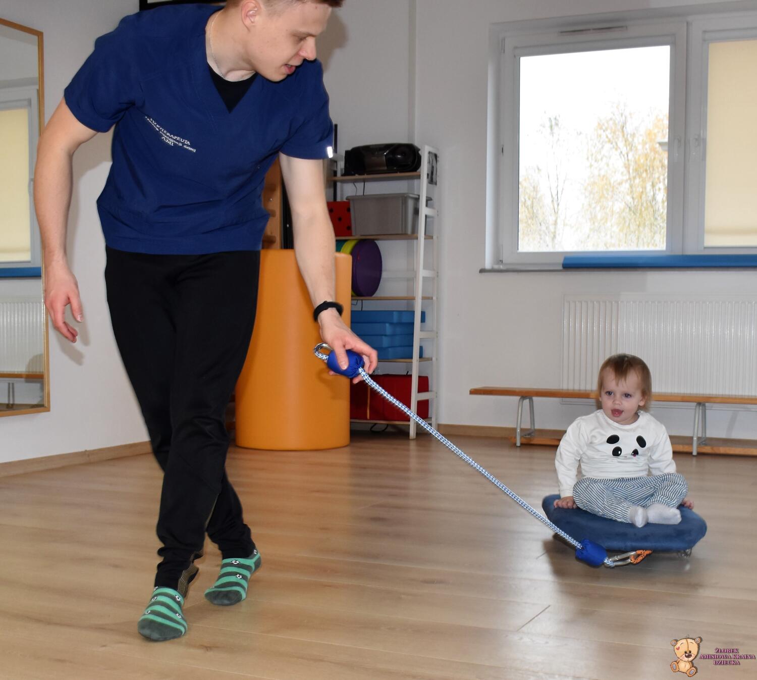 Choć była nas tylko garstka, to miło spędziliśmy czas. Pokonywaliśmy razem podwieszoną obręcz i spadaliśmy na miękkie poduszki, dzieciaki uwielbiają takie zabawy. Wujek z każdym z nas bawił się również na piłce, a także przewiózł na deskorolce terapeutycznej ![]()