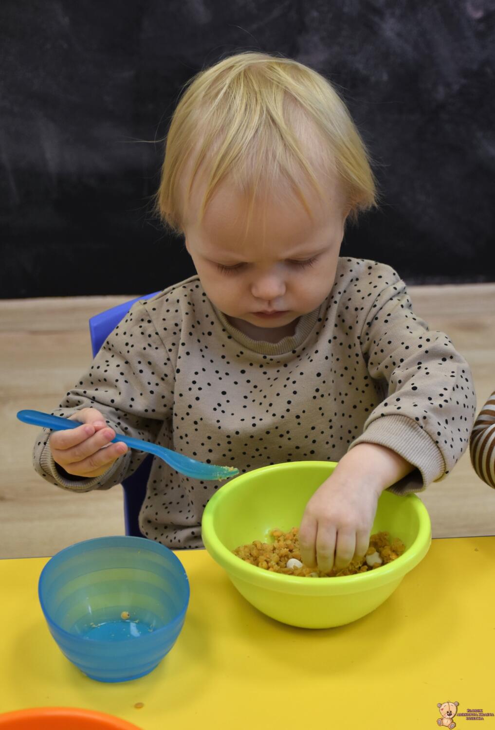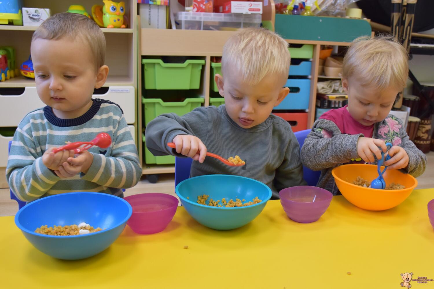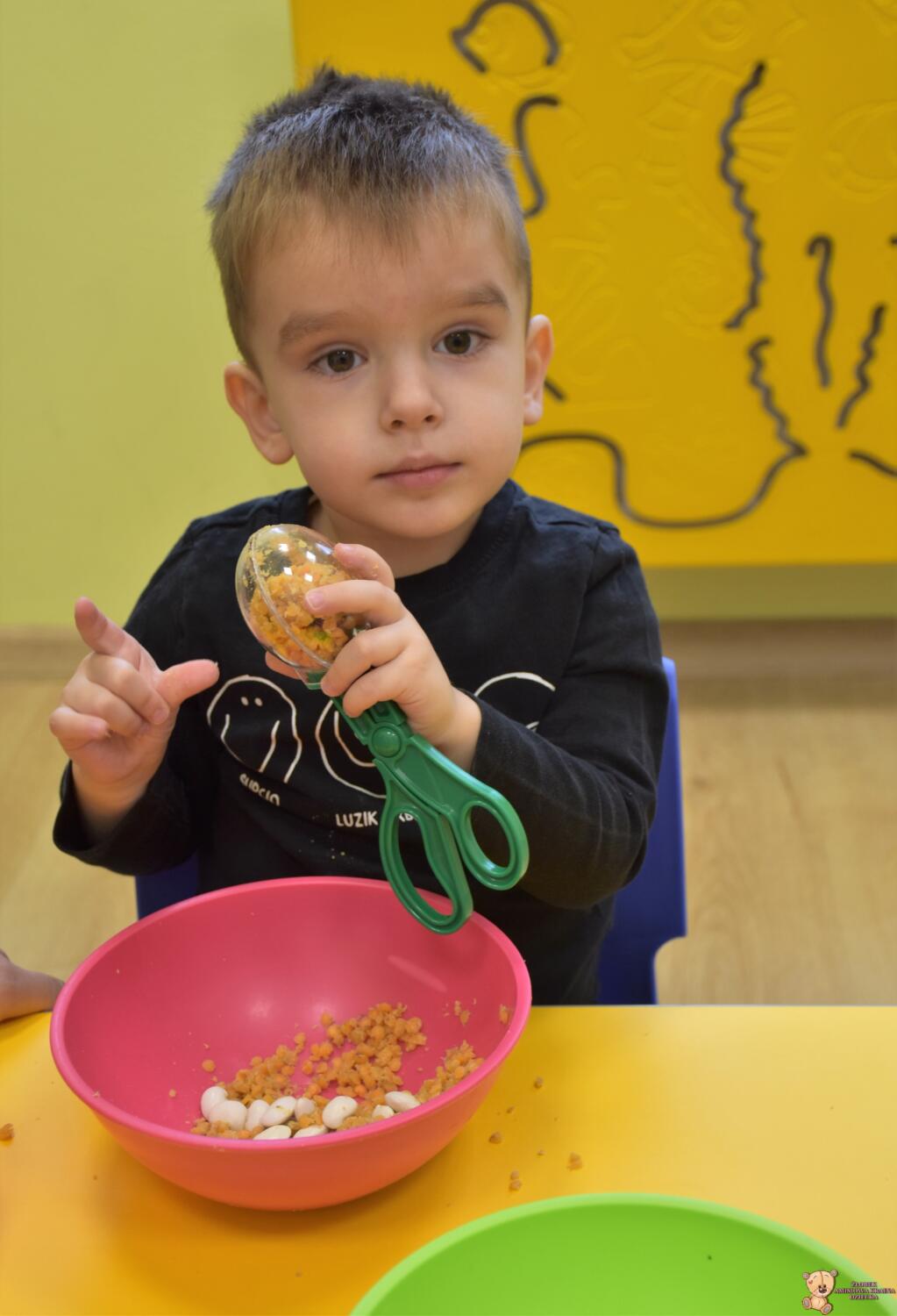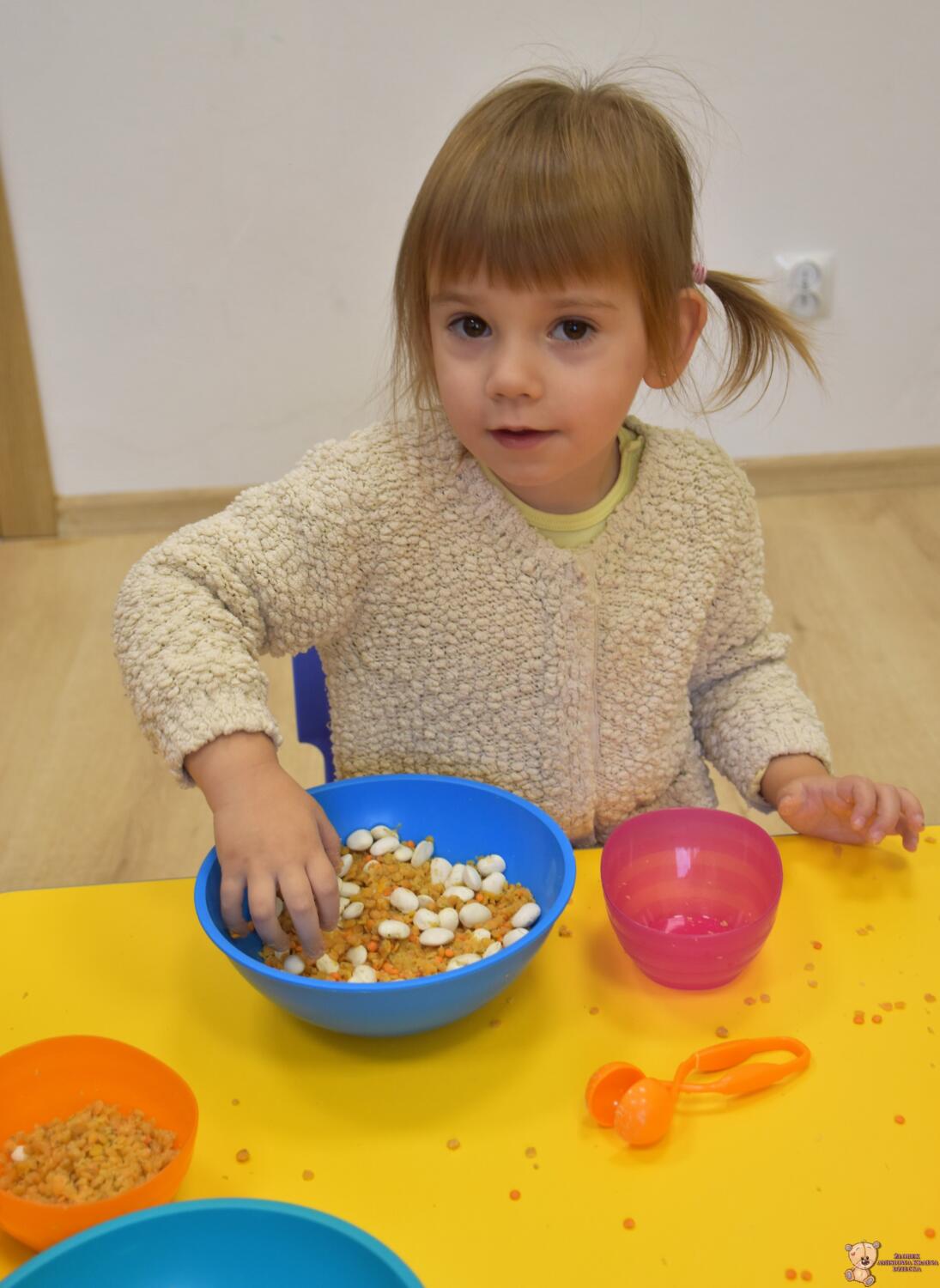 Na dzisiejszych zajeciach metodą Montessori Amisiaki przekładały ugotowaną ciecierzycę za pomocą szczypcy- młodsze dzieci za pomocą łyżek😀. Obserwowały również różnice pomiędzy wyglądem, oraz odgłosem gotowanej a surowej ciecierzycy. Doświadczyły również wrażeń sensorycznych poprzez ugniatanie, oraz segregacje. 😀