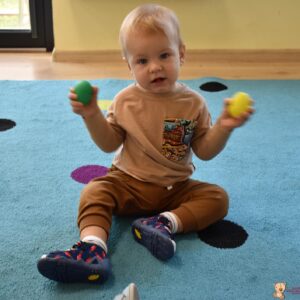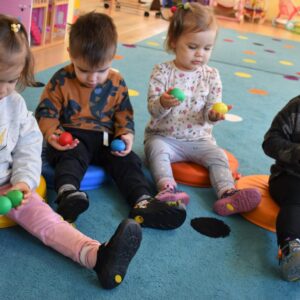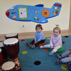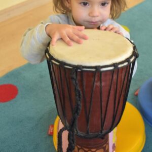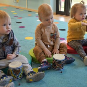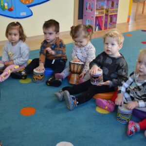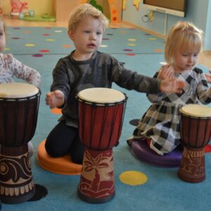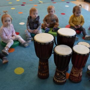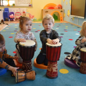Na dzisiejszej rytmice ciocia pokazała Nam nowe instrumenty – bębny. Są w kształcie kielicha, na których na górną część naciągnięta jest membrana. Skórę tą naciąga się za pomocą specjalnie splatanego sznura. Mają one interesujące wzory oraz ciekawe brzmienie. Ciocia opowiedziała Nam o ich pochodzeniu i sposobie gry. Bawiliśmy się w rytmizację słowną, i powtarzaliśmy rytm do znanych nam piosenek. Poprzez ćwiczenie rytmiczne uczymy się kontrolowania własnych ruchów, i napięć mięśniowych.