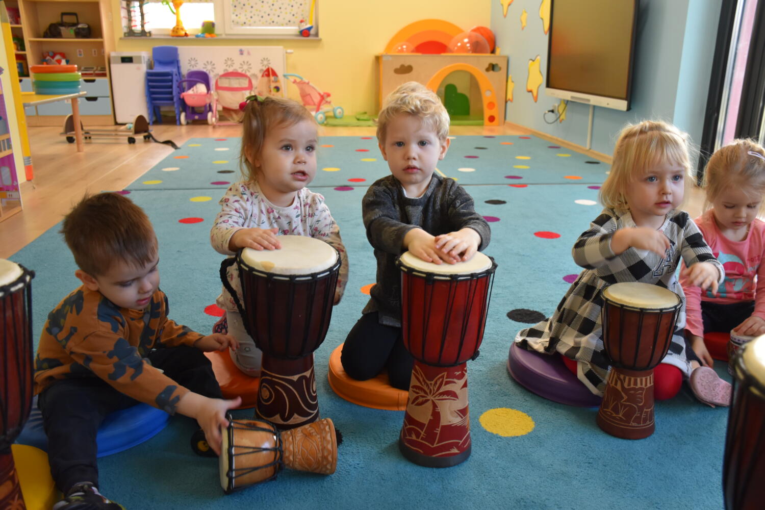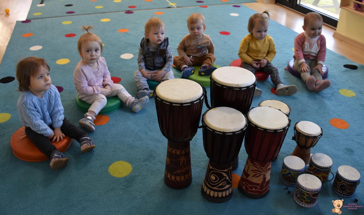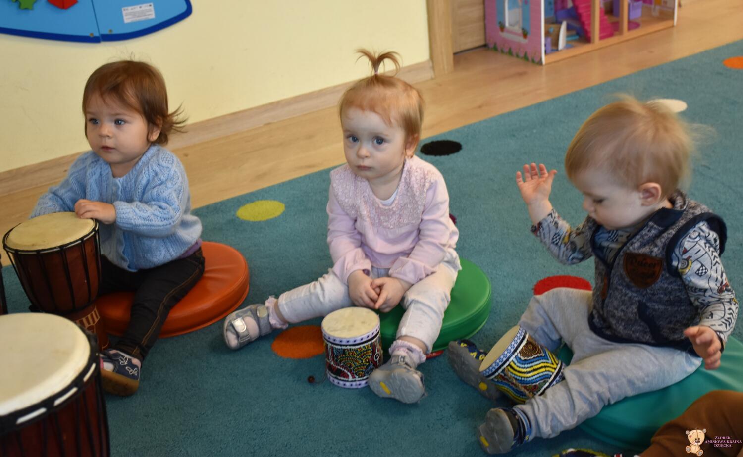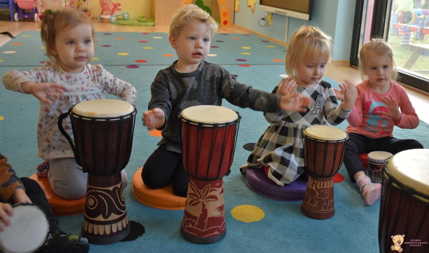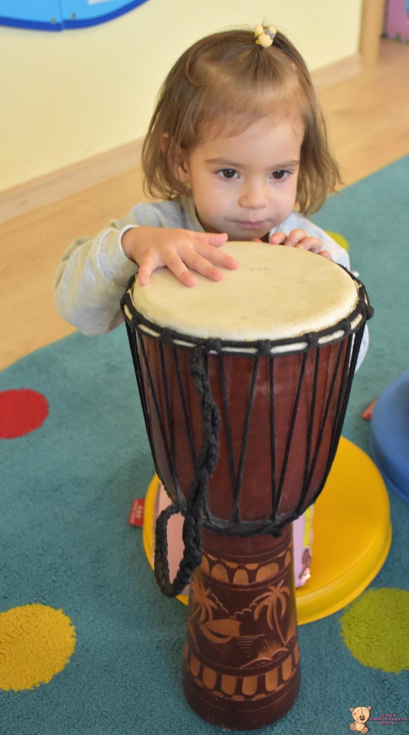 Na dzisiejszej rytmice ciocia pokazała Nam nowe instrumenty – bębny. Są w kształcie kielicha, na których na górną część naciągnięta jest membrana. Skórę tą naciąga się za pomocą specjalnie splatanego sznura. Mają one interesujące wzory oraz ciekawe brzmienie. Ciocia opowiedziała Nam o ich pochodzeniu i sposobie gry. Bawiliśmy się w rytmizację słowną, i powtarzaliśmy rytm do znanych nam piosenek. Poprzez ćwiczenie rytmiczne uczymy się kontrolowania własnych ruchów, i napięć mięśniowych.