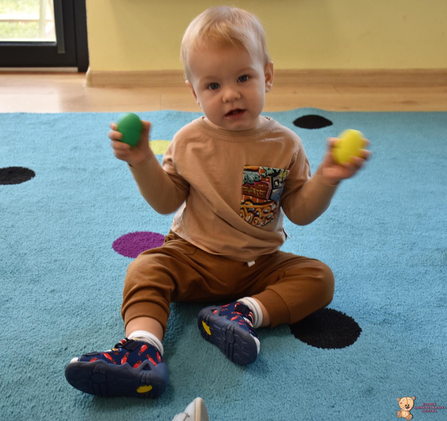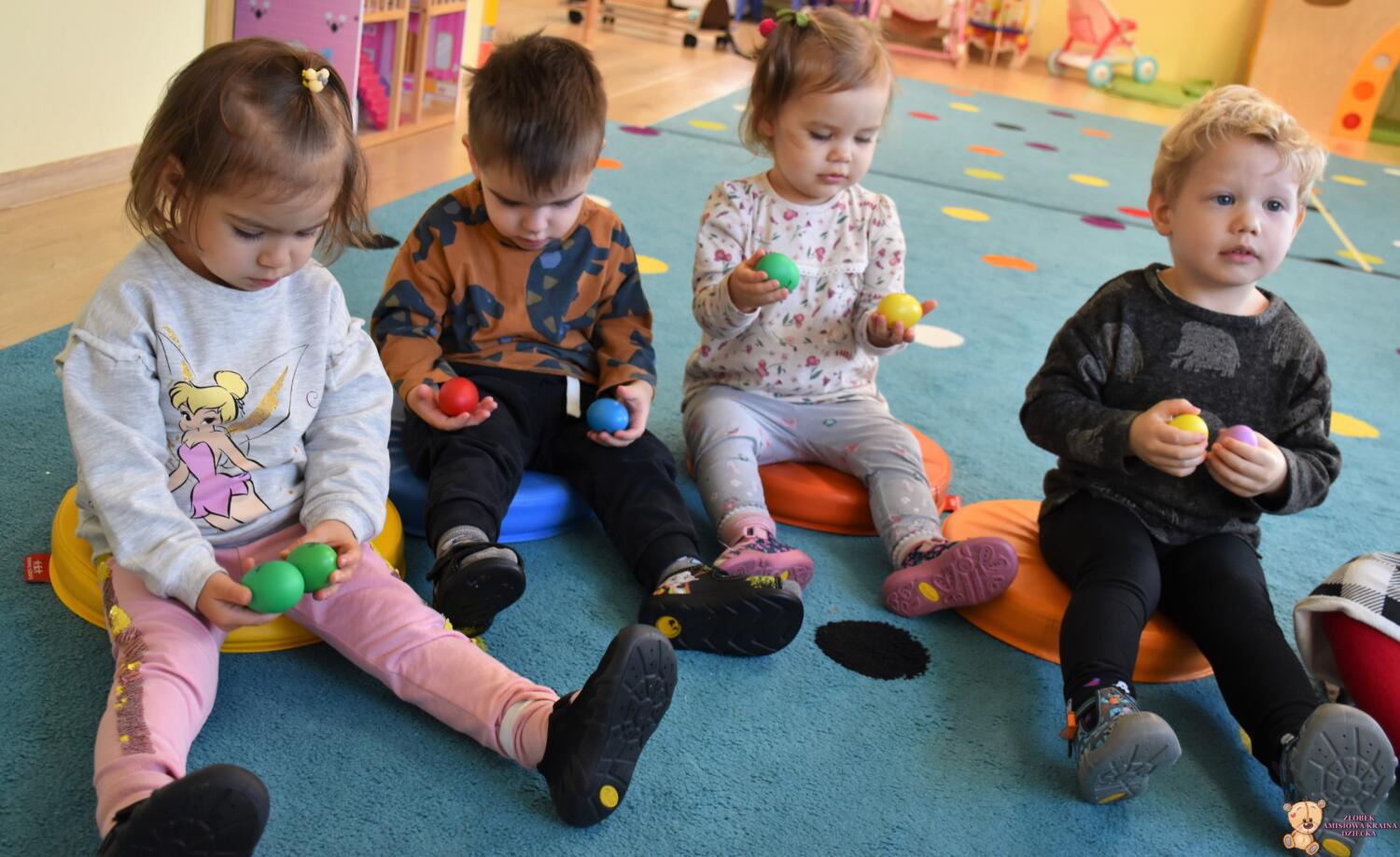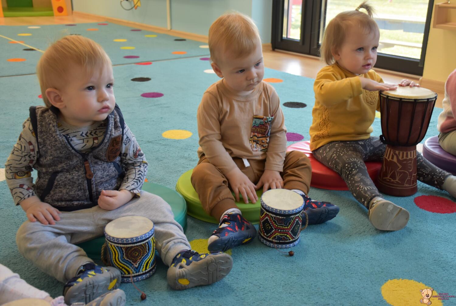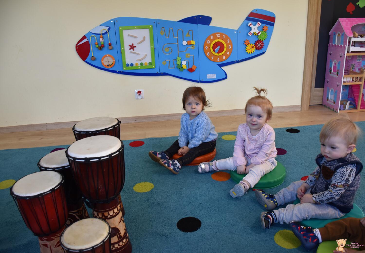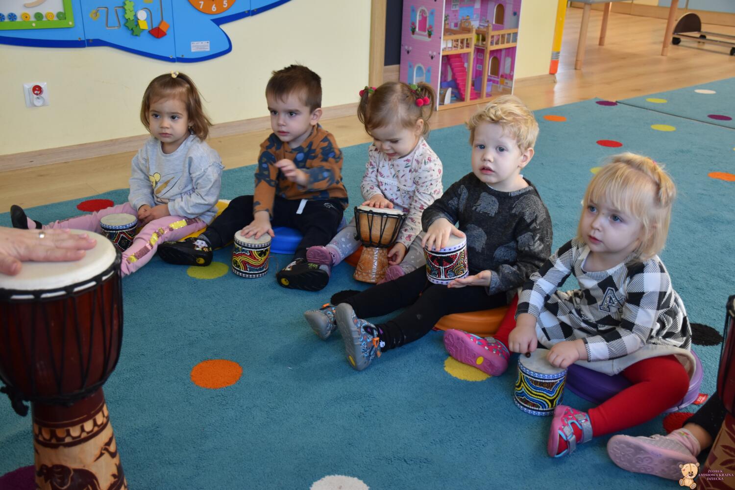 Na dzisiejszej rytmice ciocia pokazała Nam nowe instrumenty – bębny. Są w kształcie kielicha, na których na górną część naciągnięta jest membrana. Skórę tą naciąga się za pomocą specjalnie splatanego sznura. Mają one interesujące wzory oraz ciekawe brzmienie. Ciocia opowiedziała Nam o ich pochodzeniu i sposobie gry. Bawiliśmy się w rytmizację słowną, i powtarzaliśmy rytm do znanych nam piosenek. Poprzez ćwiczenie rytmiczne uczymy się kontrolowania własnych ruchów, i napięć mięśniowych.