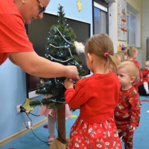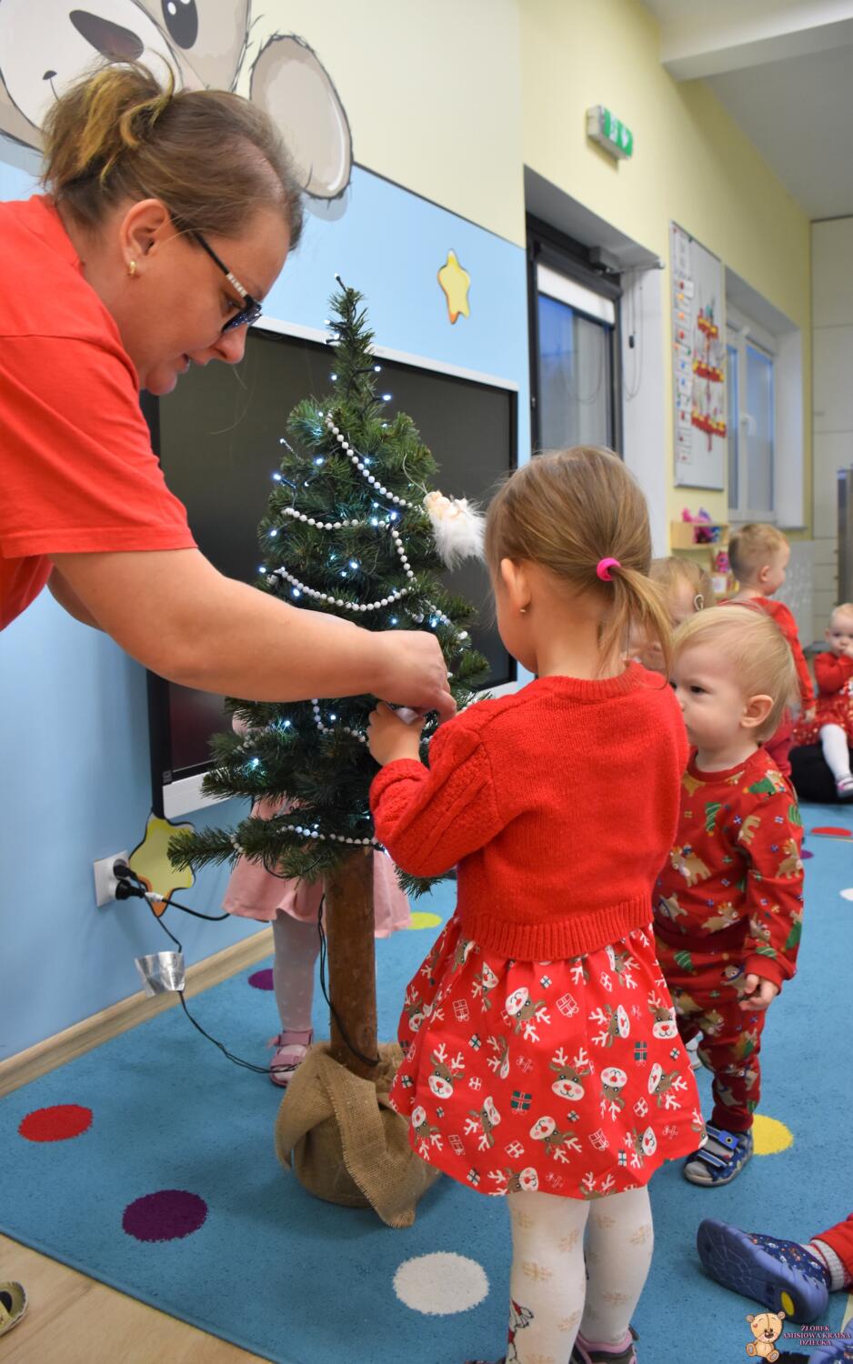 W dniu dzisiejszym obchodzimy Mikołajki ! Dzieci rozpoczęły dzień od ubierania żłobkowej choinki, przy akompaniamencie świątecznych piosenek i kolęd. I nagle… tuż za naszym oknem, wśród wirujących płatków śniegu, dzieci dostrzegły sanie Świętego Mikołaja, sunące po niebie, w kierunku AMIsiowego Żłobka. I nagle do drzwi, zapukał ON !