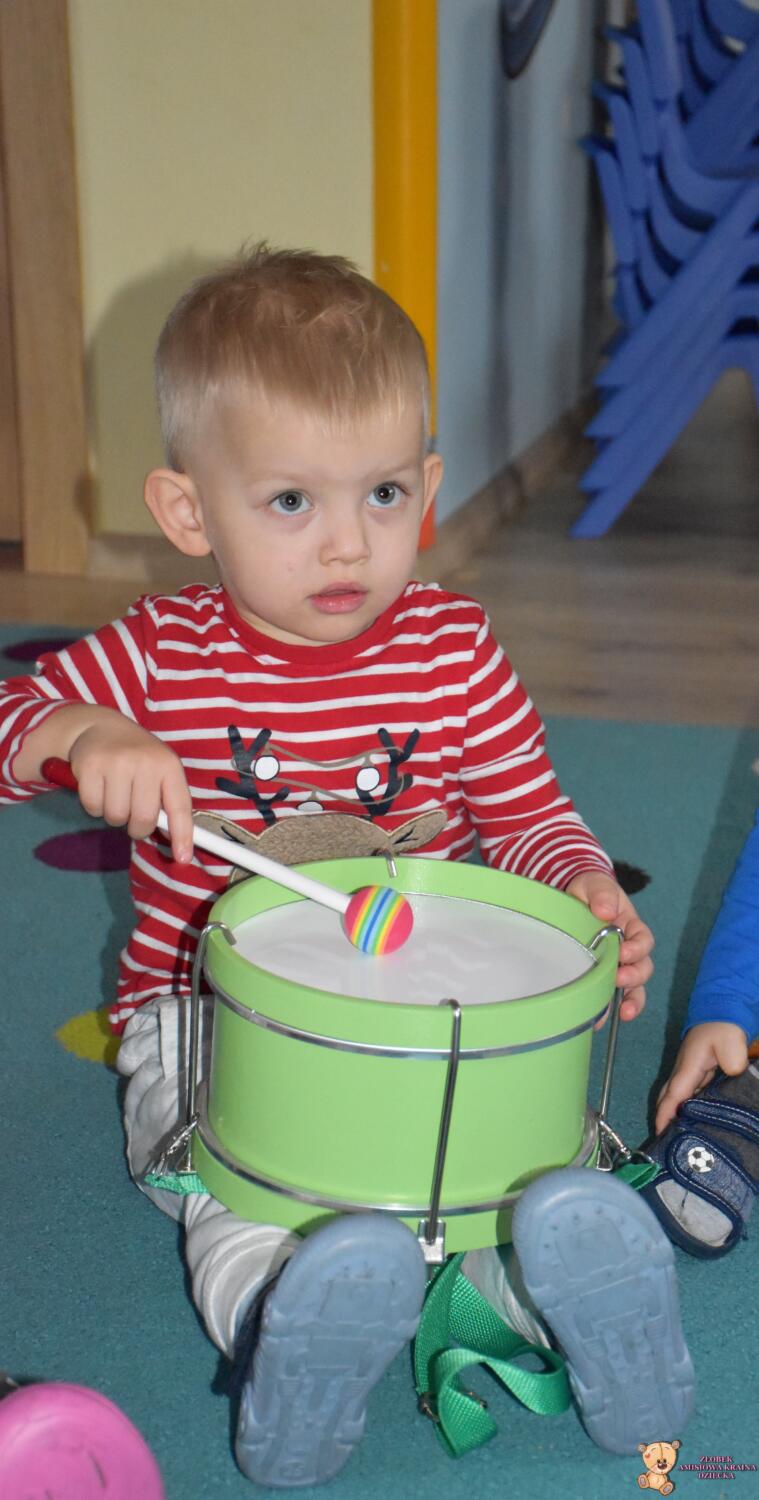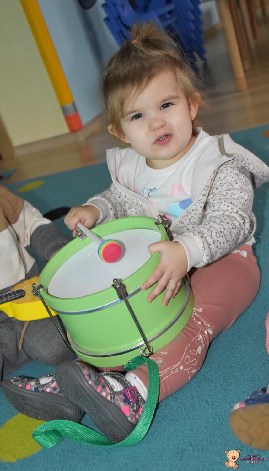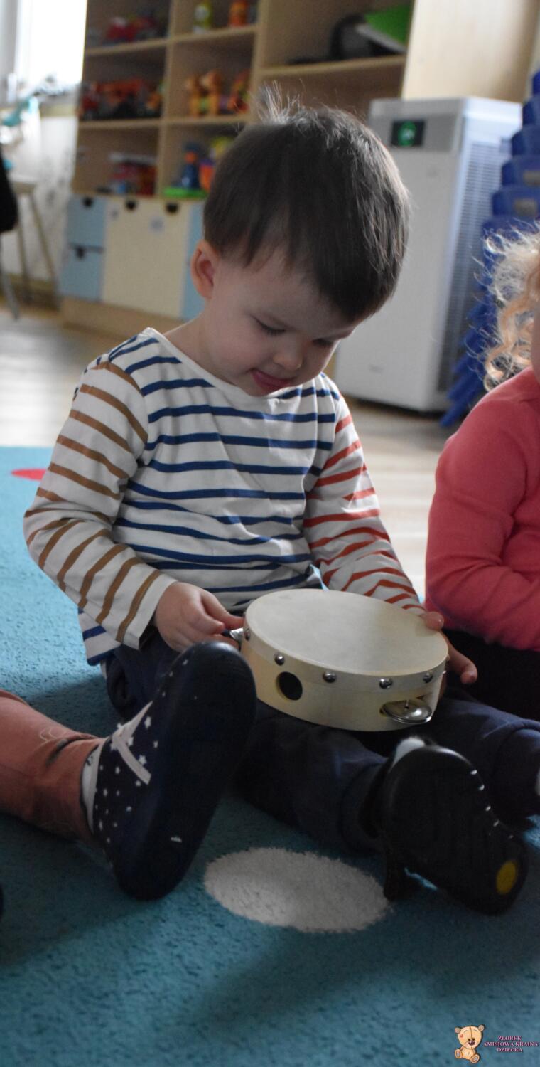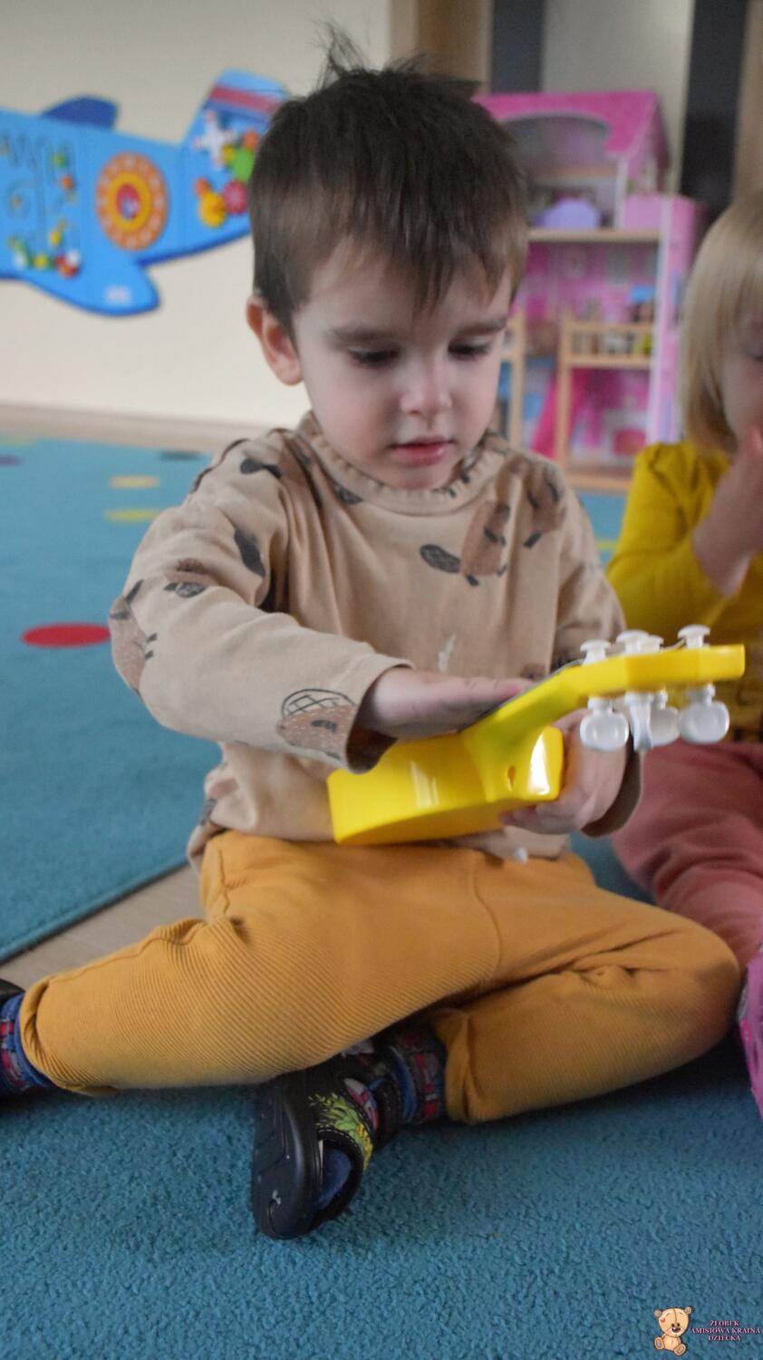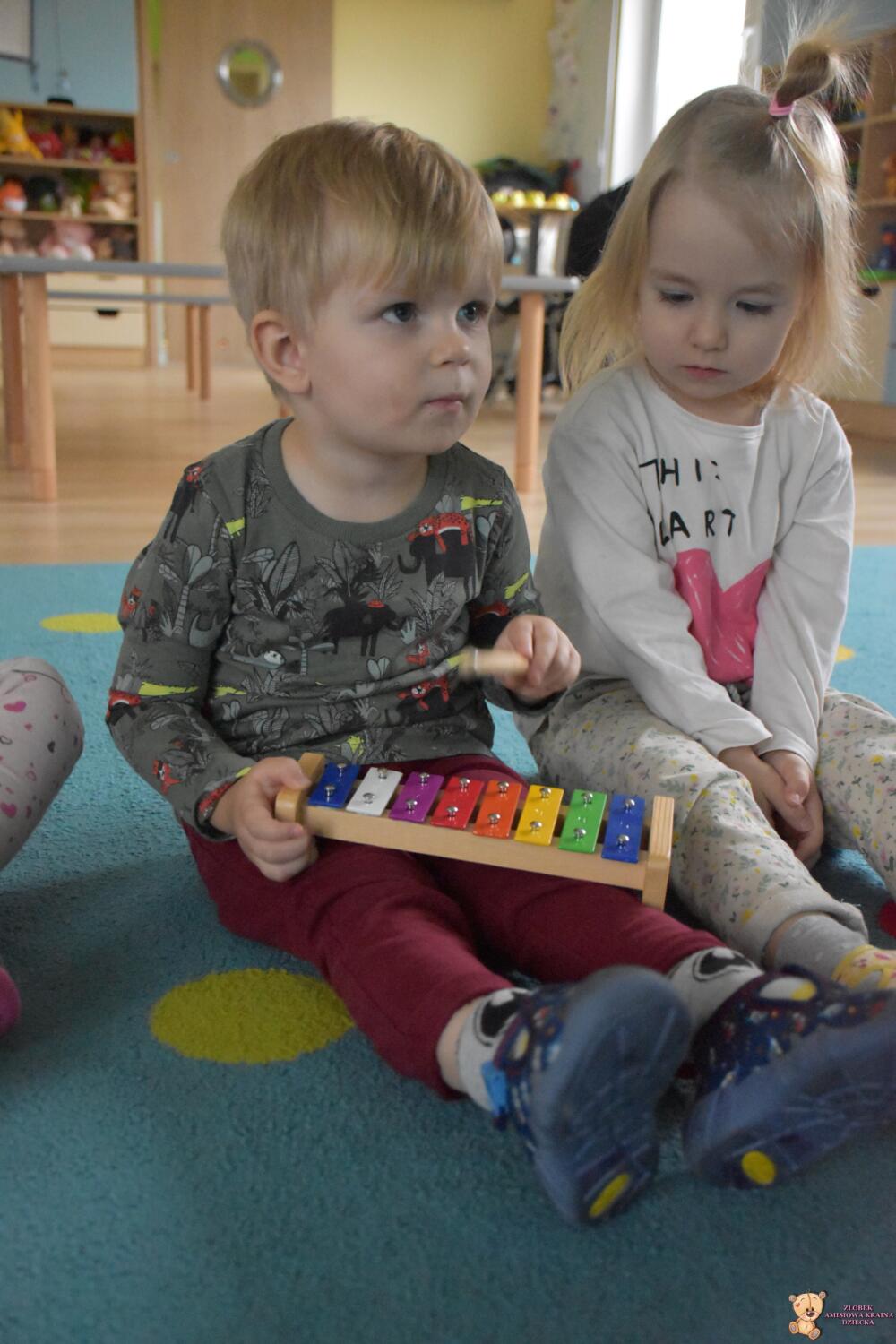 Dzisiaj na zajęciach z muzykoterapii dzieci wybrały się w muzyczny świat instrumentów z małym Ludwikiem. Na ekranie monitora pokazywały nam się różne instrumenty, ich brzmienie, budowa i sposób gry. Ciocia również przyniosła dla nas niektóre instrumenty: bębenek, ksylofon( cymbały), tamburyn, gitarę i talerze.. Choć nazwa i sposób gry była trudna to i tak sobie świetnie poradziliśmy. Uwielbiamy zabawę z instrumentami.