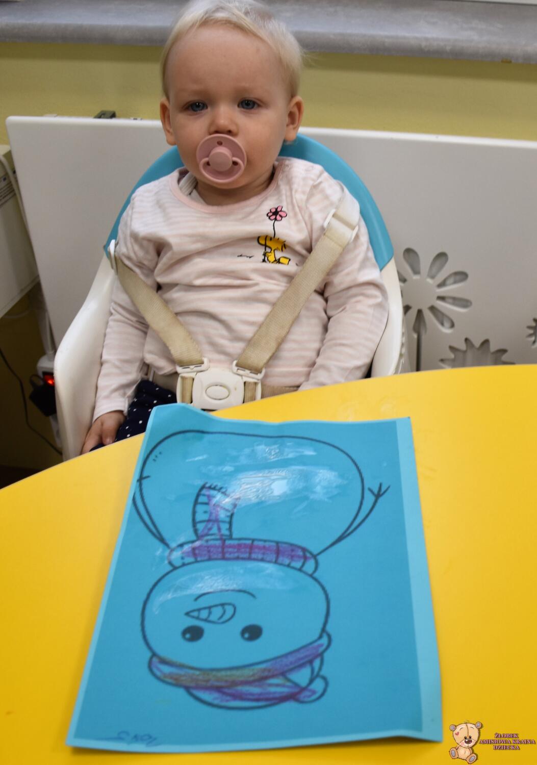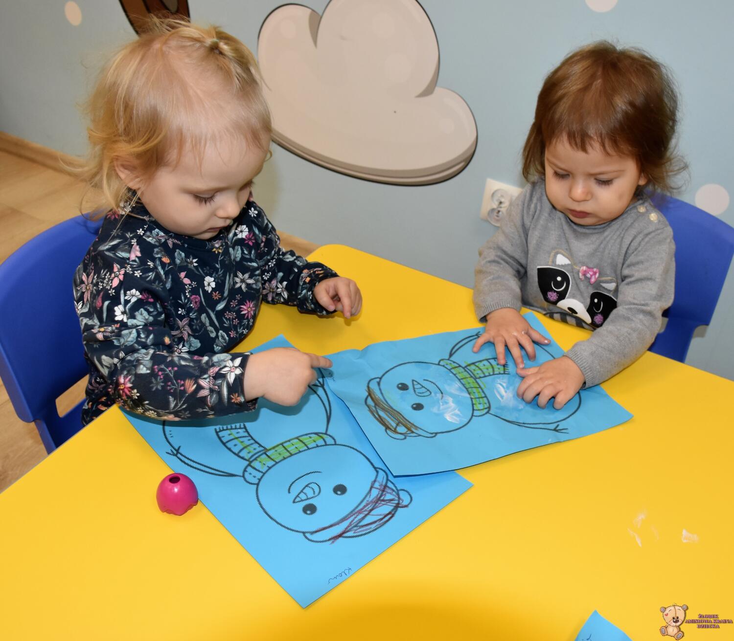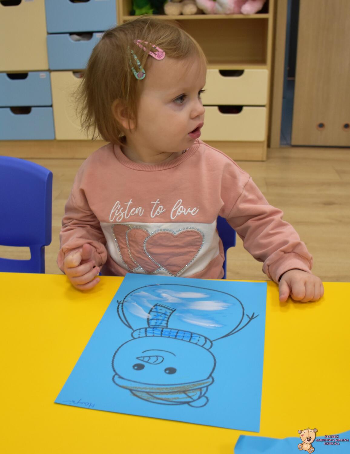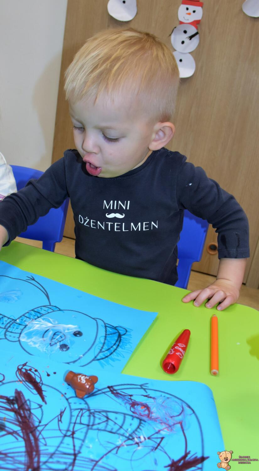 Dzisiaj pracą plastyczną było wykonanie bałwanka pasta,brokatem i kredkami.Nasze AMISIAKI zwinnie paluszkami wykonywali pracę co sprawiło ogromną frajdę ![]()
