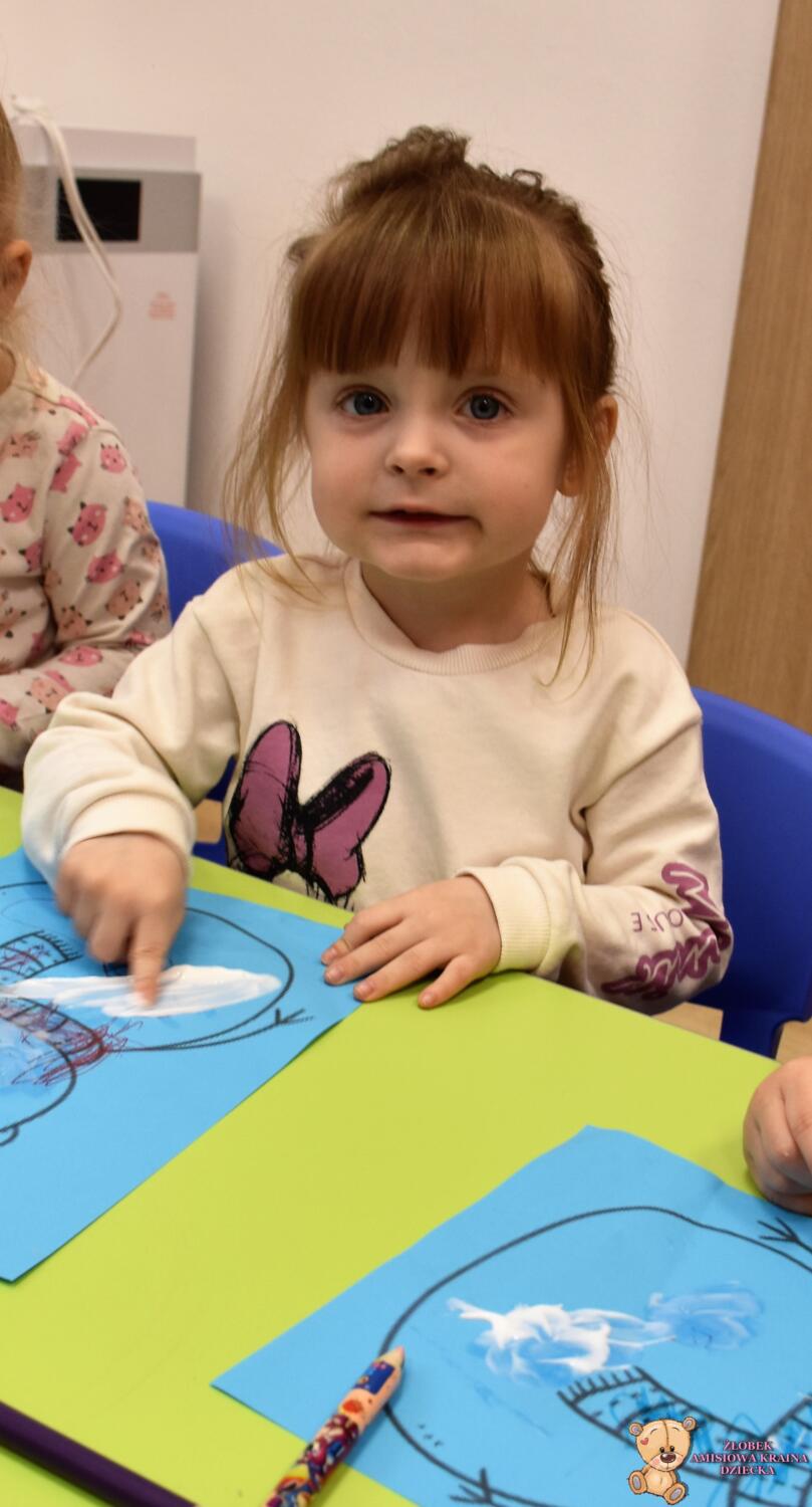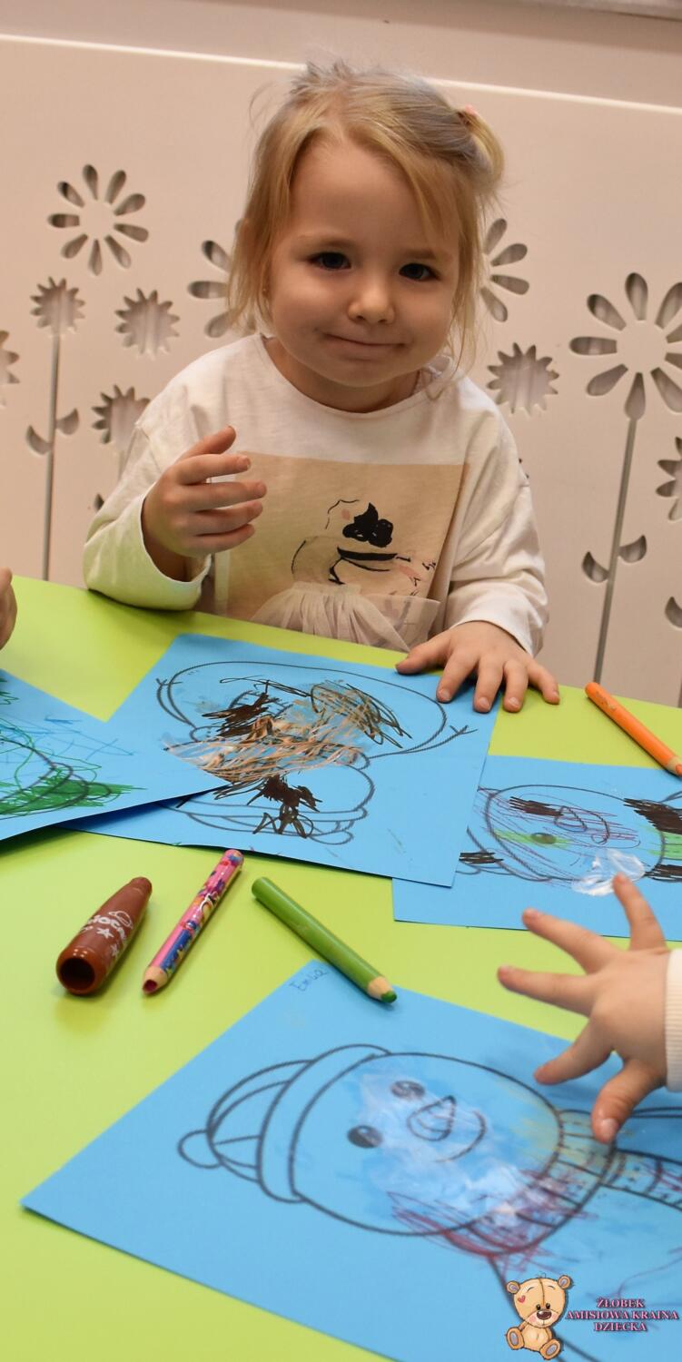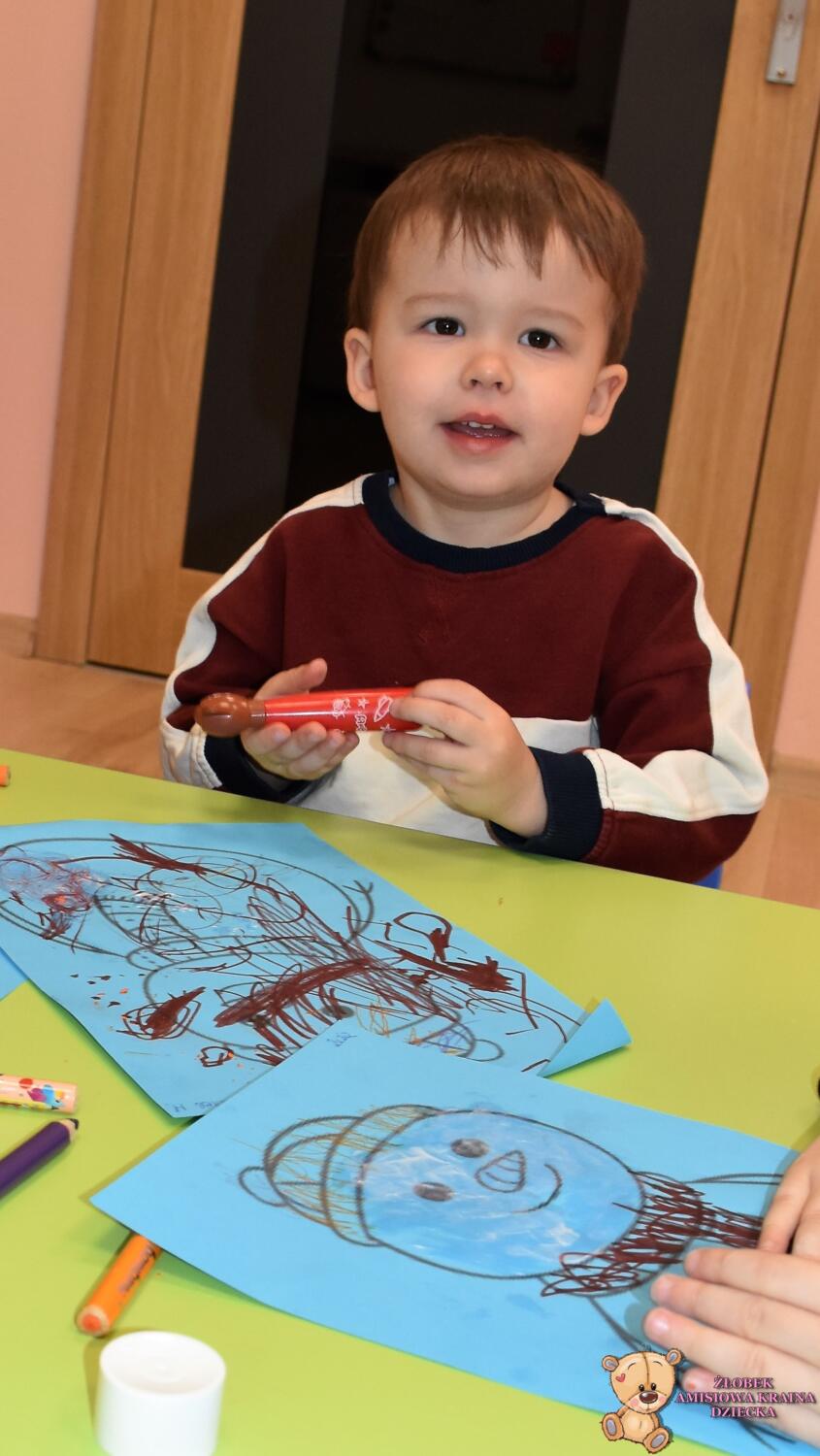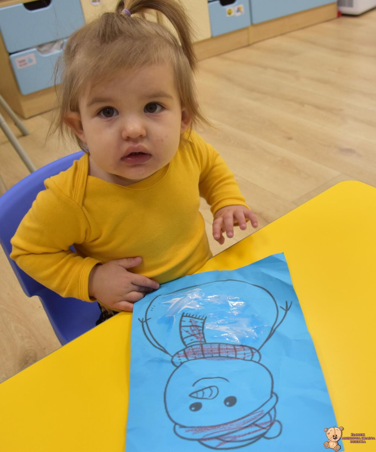 Dzisiaj pracą plastyczną było wykonanie bałwanka pasta,brokatem i kredkami.Nasze AMISIAKI zwinnie paluszkami wykonywali pracę co sprawiło ogromną frajdę ![]()