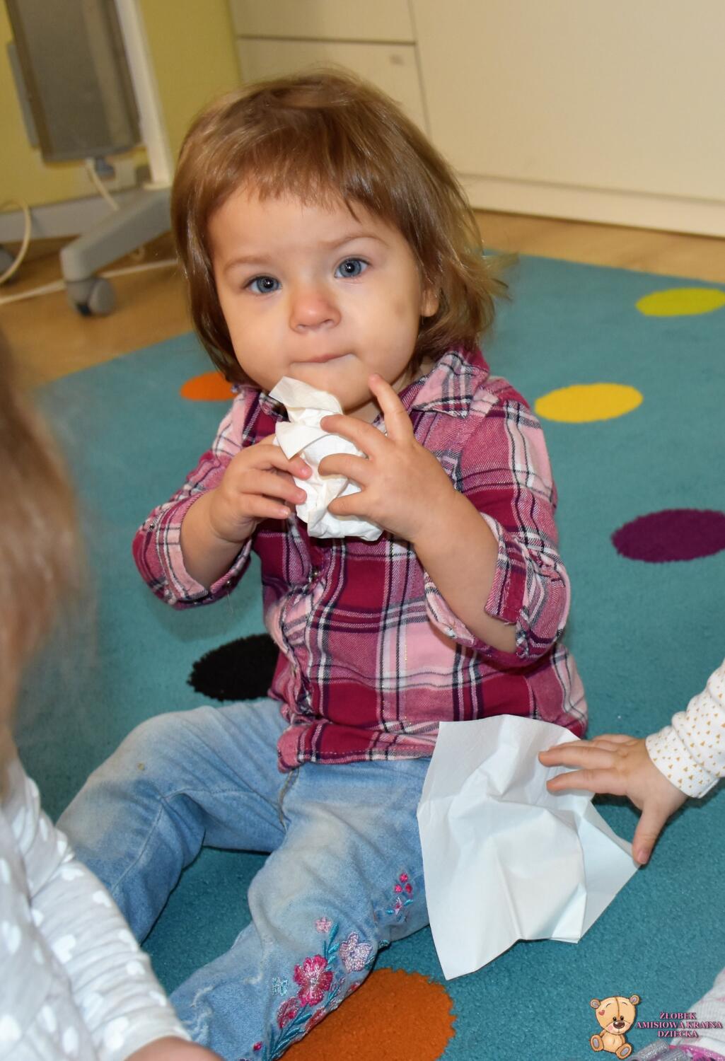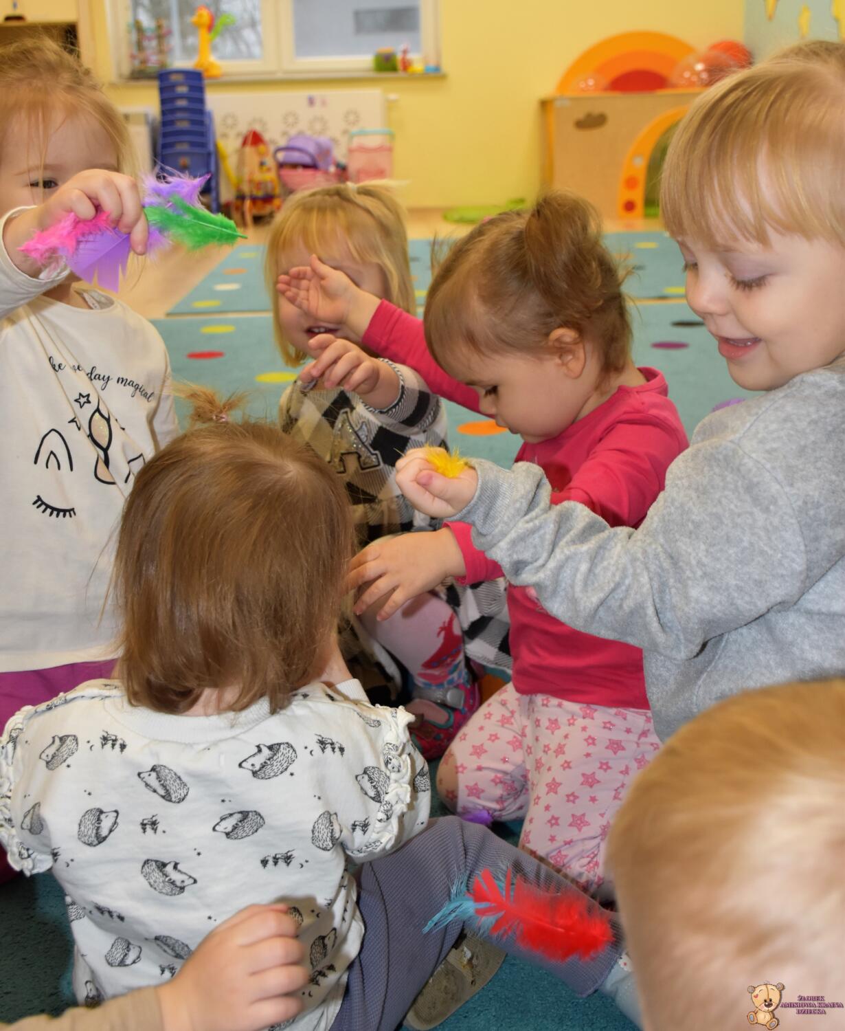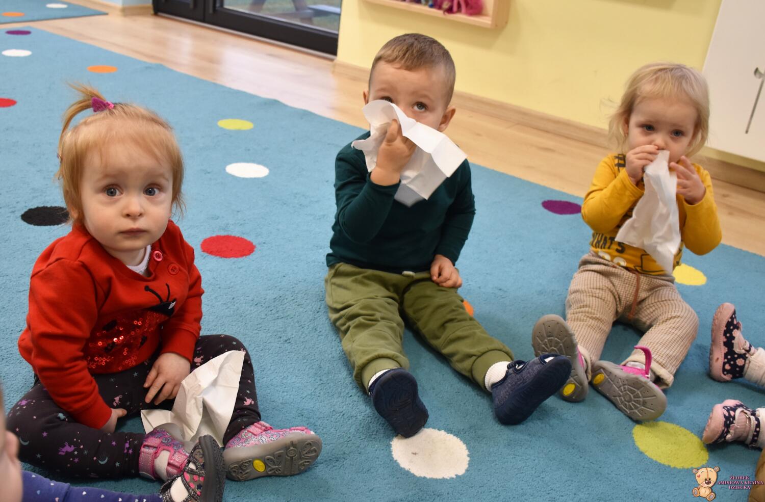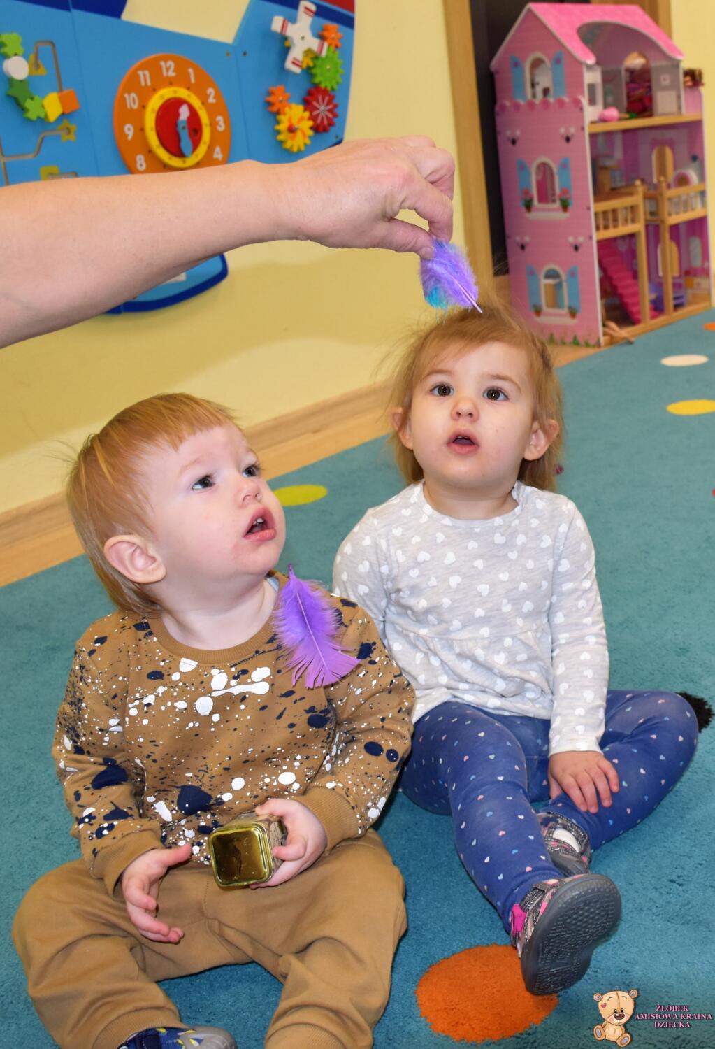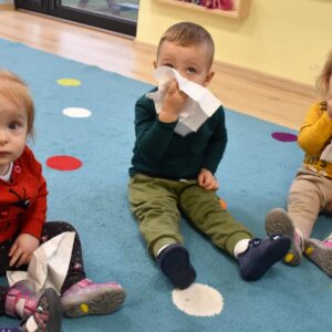 Dziś nasze Amisiaki wraz z panią pielęgniarką wykonywały wesołe eksperymenty: dmuchały w chusteczki, wąchały schowane w pudełeczku perfumy i oceniały czy podoba im się ten zapach. Na końcu zajęć bawiliśmy się piórkami, dmuchaliśmy, by unosiły się do góry, sprawiło to nam wiele radości. 🙂