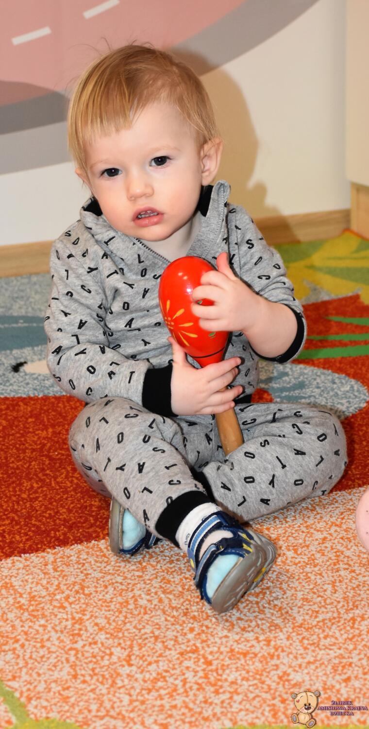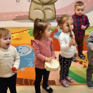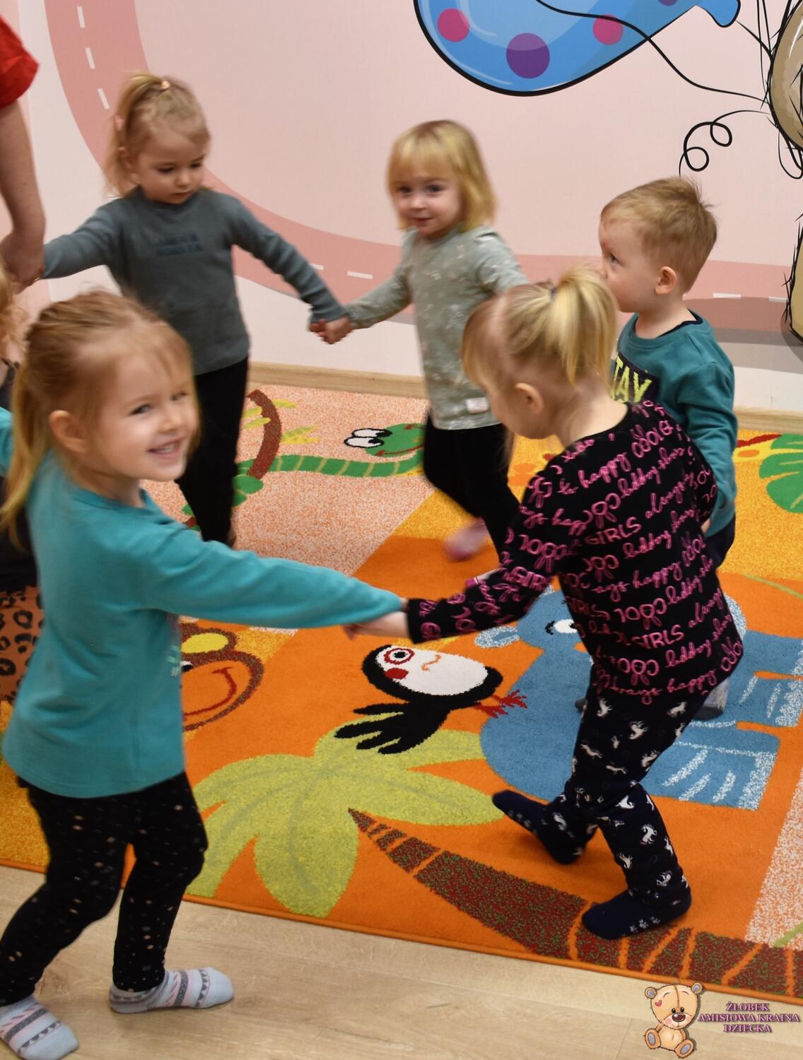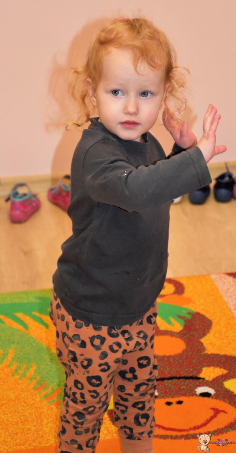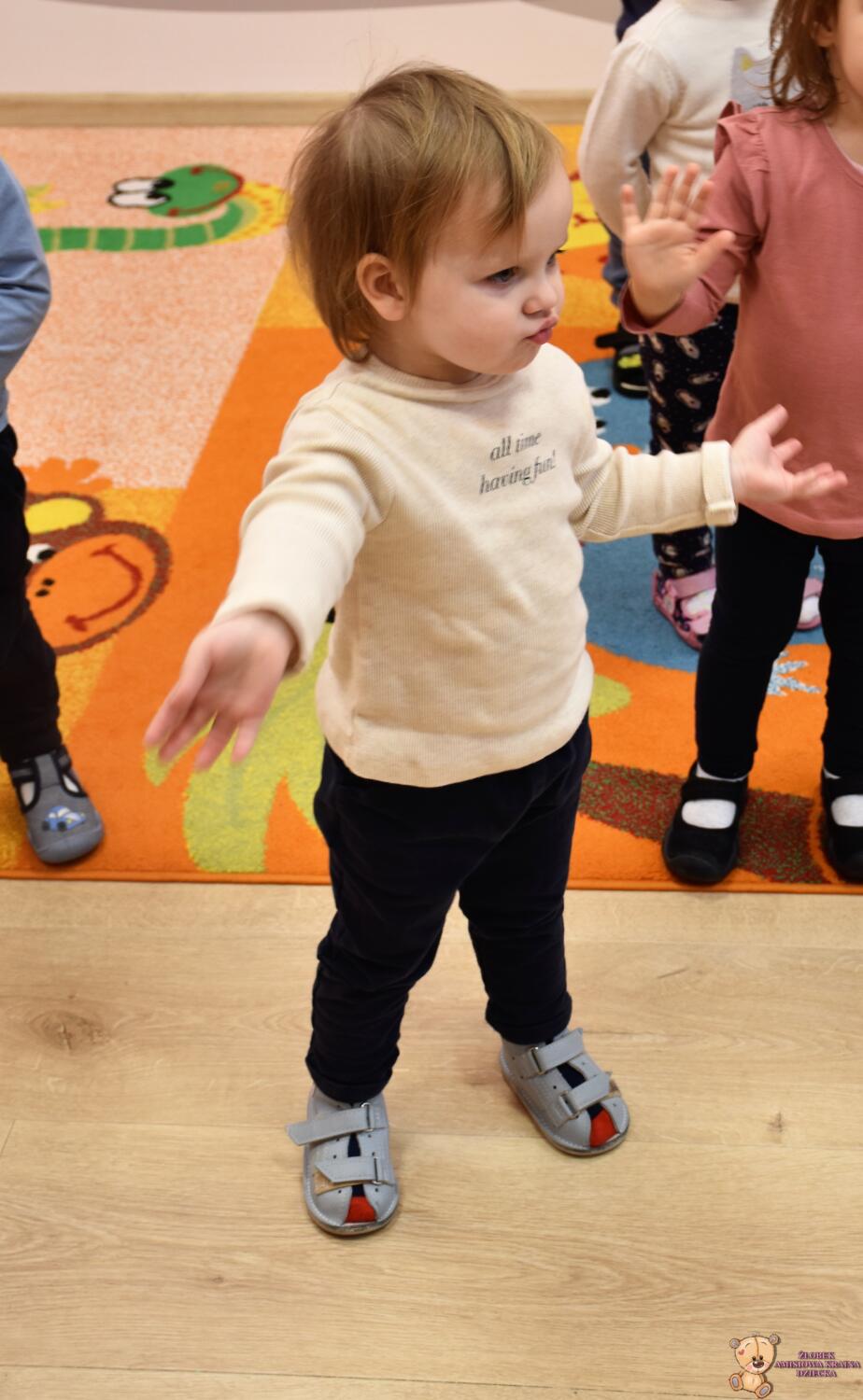 Na zajęciach muzykoterapii kontynuowaliśmy zabawy zimowe przy muzyce. Dzieci wraz ciocią Pauliną wykonywały różne figury taneczne, pokazując przy tym swoją gibkość ciała. Zamieniliśmy się w Pingwinka, który pokazywał jak się pływa, zjeżdża na brzuszku i podskakuje. Natomiast zabawa z wróbelkiem była spokojniejsza lecz wymagała większej spostrzegawczości. Z instrumentami graliśmy raz głośno, raz cicho, ćwicząc przy okazji rytmizację ,a na koniec porównaliśmy barwy instrumentów.