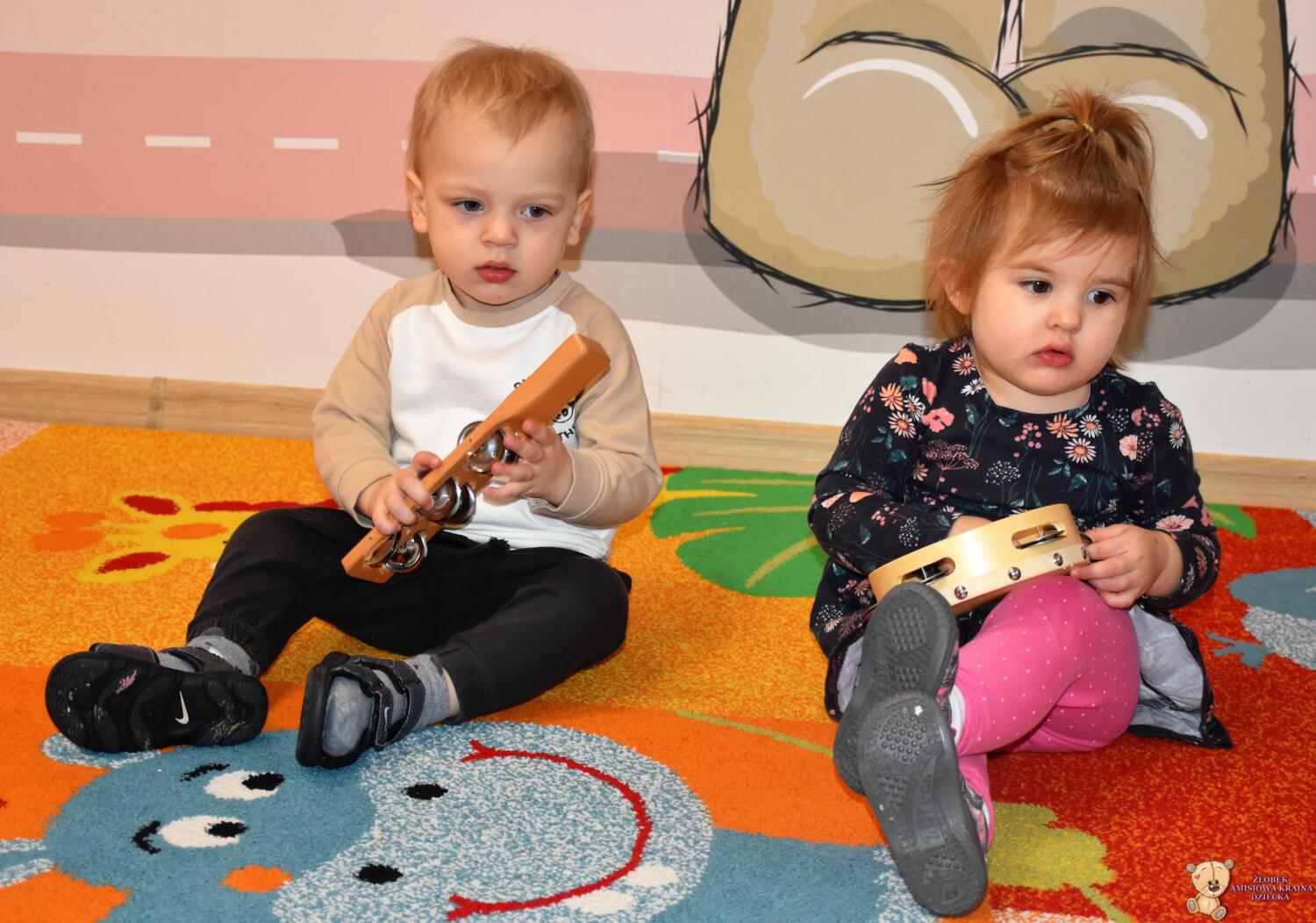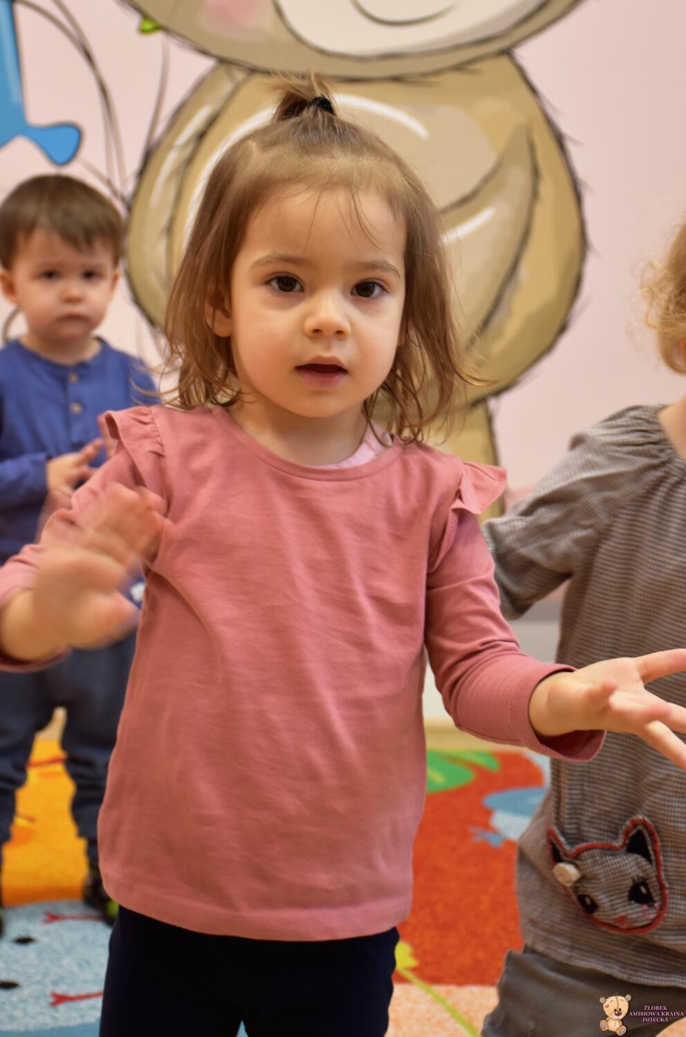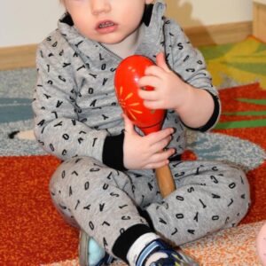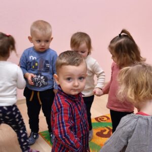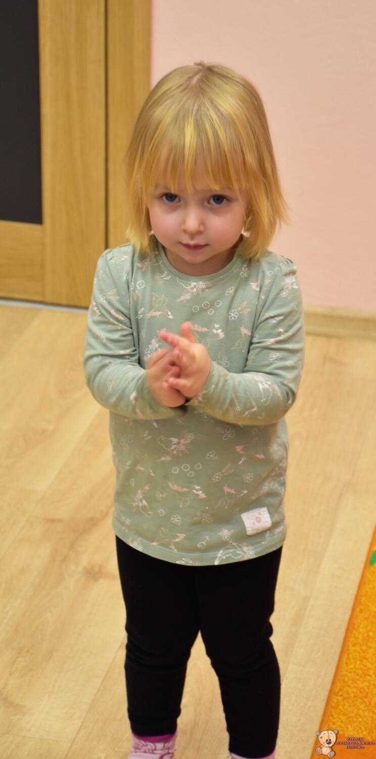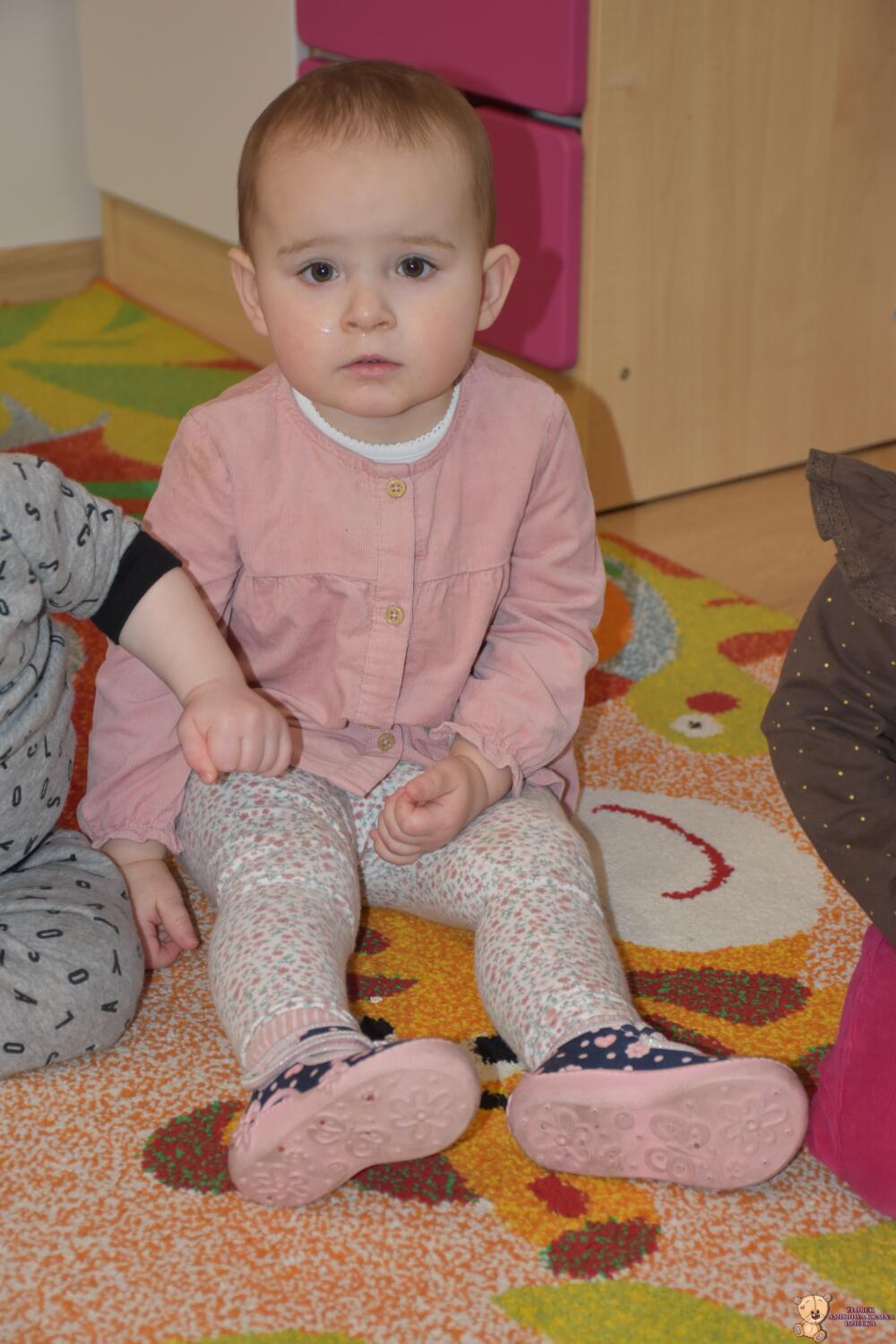 Na zajęciach muzykoterapii kontynuowaliśmy zabawy zimowe przy muzyce. Dzieci wraz ciocią Pauliną wykonywały różne figury taneczne, pokazując przy tym swoją gibkość ciała. Zamieniliśmy się w Pingwinka, który pokazywał jak się pływa, zjeżdża na brzuszku i podskakuje. Natomiast zabawa z wróbelkiem była spokojniejsza lecz wymagała większej spostrzegawczości. Z instrumentami graliśmy raz głośno, raz cicho, ćwicząc przy okazji rytmizację ,a na koniec porównaliśmy barwy instrumentów.