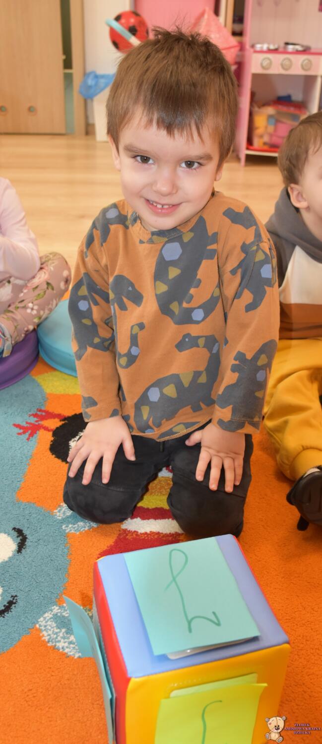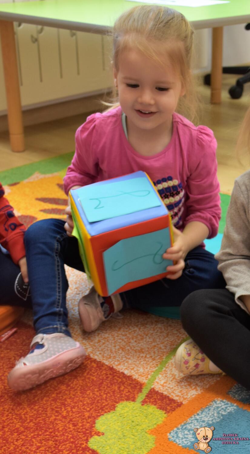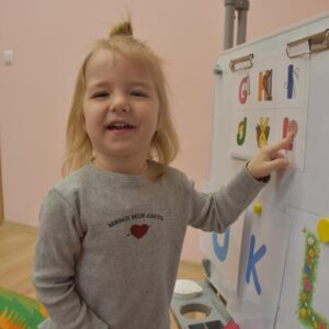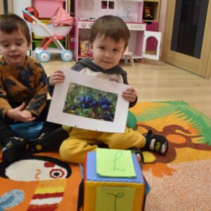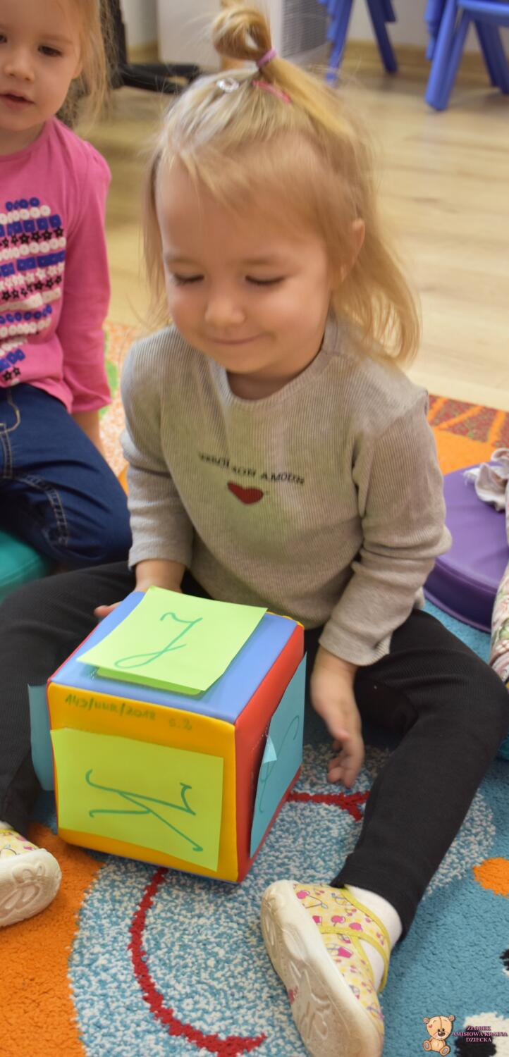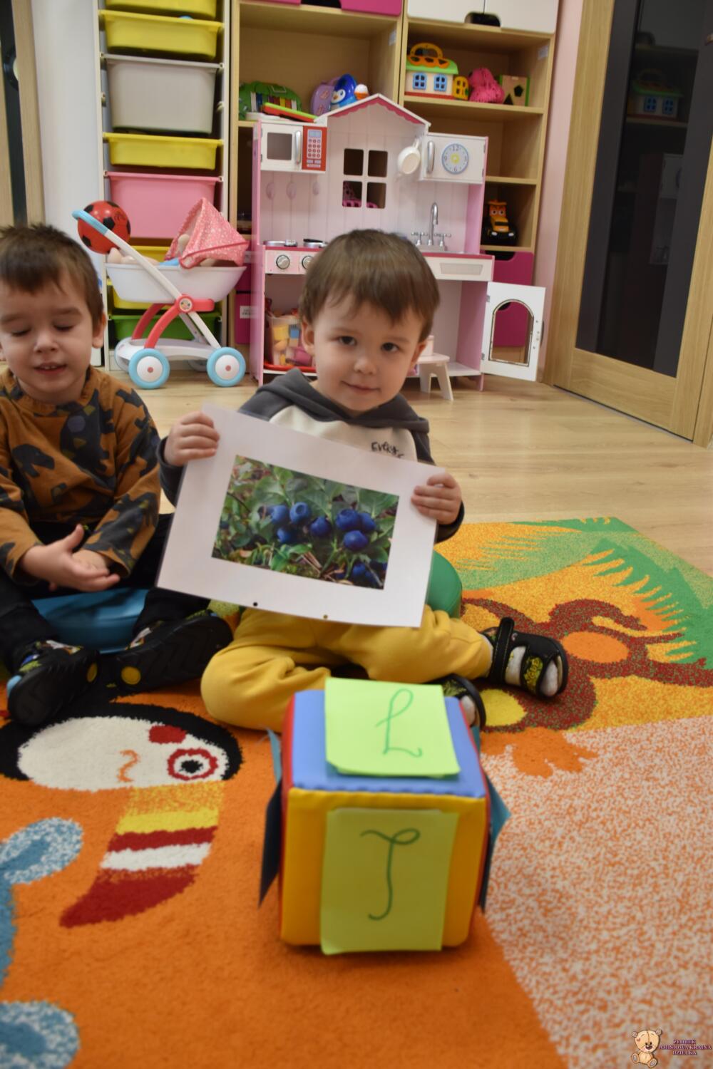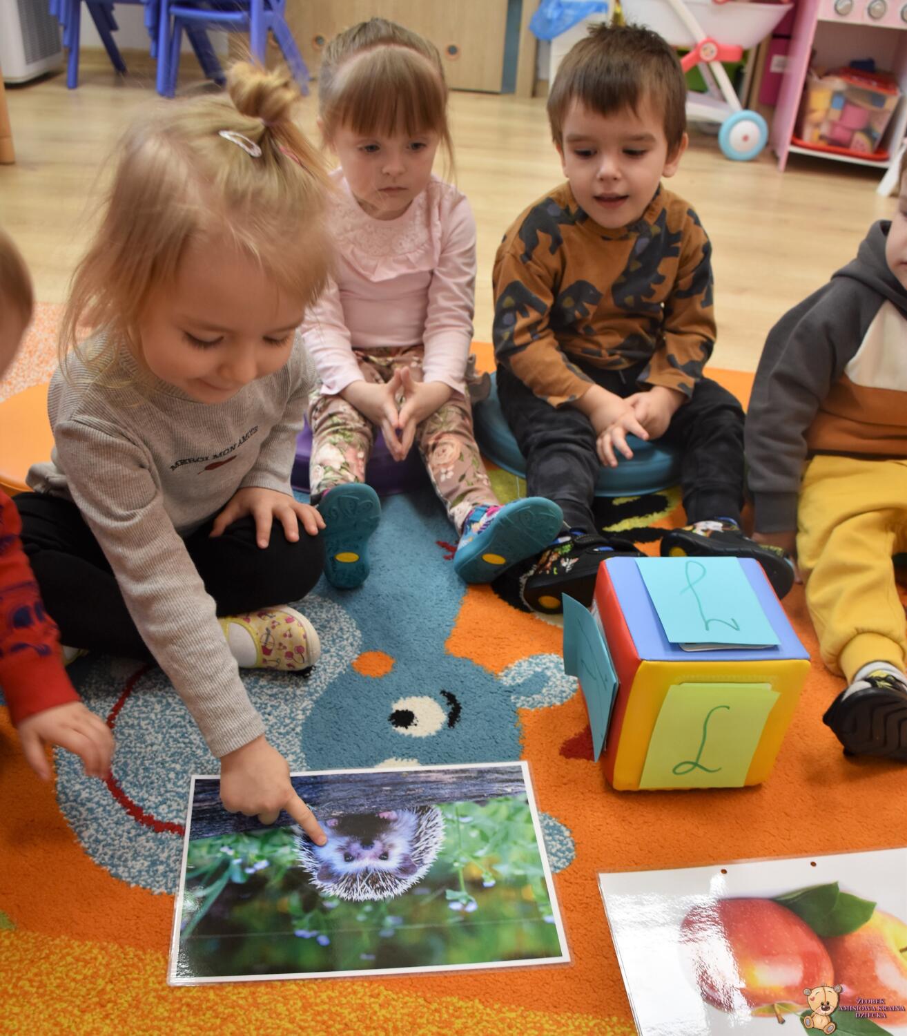 dzieci rzucały kostką i odgadywały jaka wypadła litera, następnie szukaliśmy wśród ilustracji zwierzątek i owoców na daną literkę