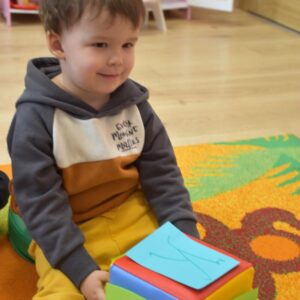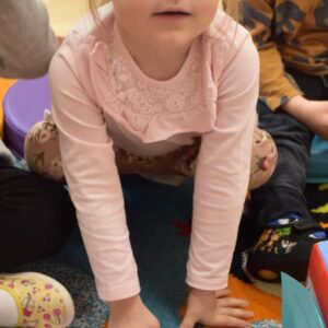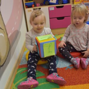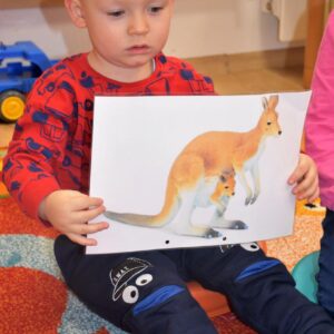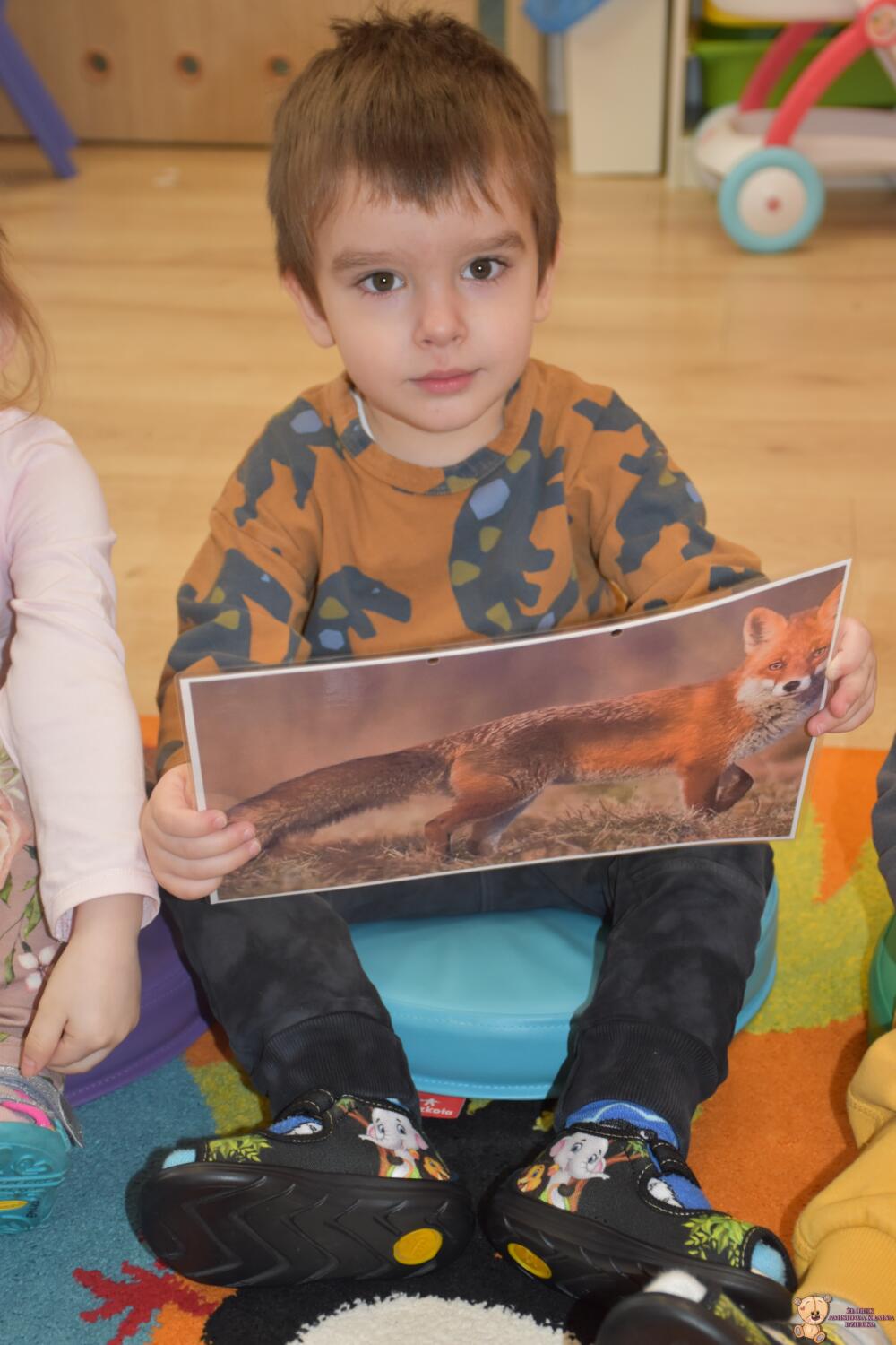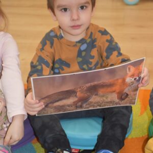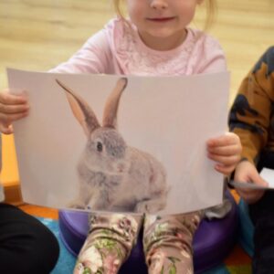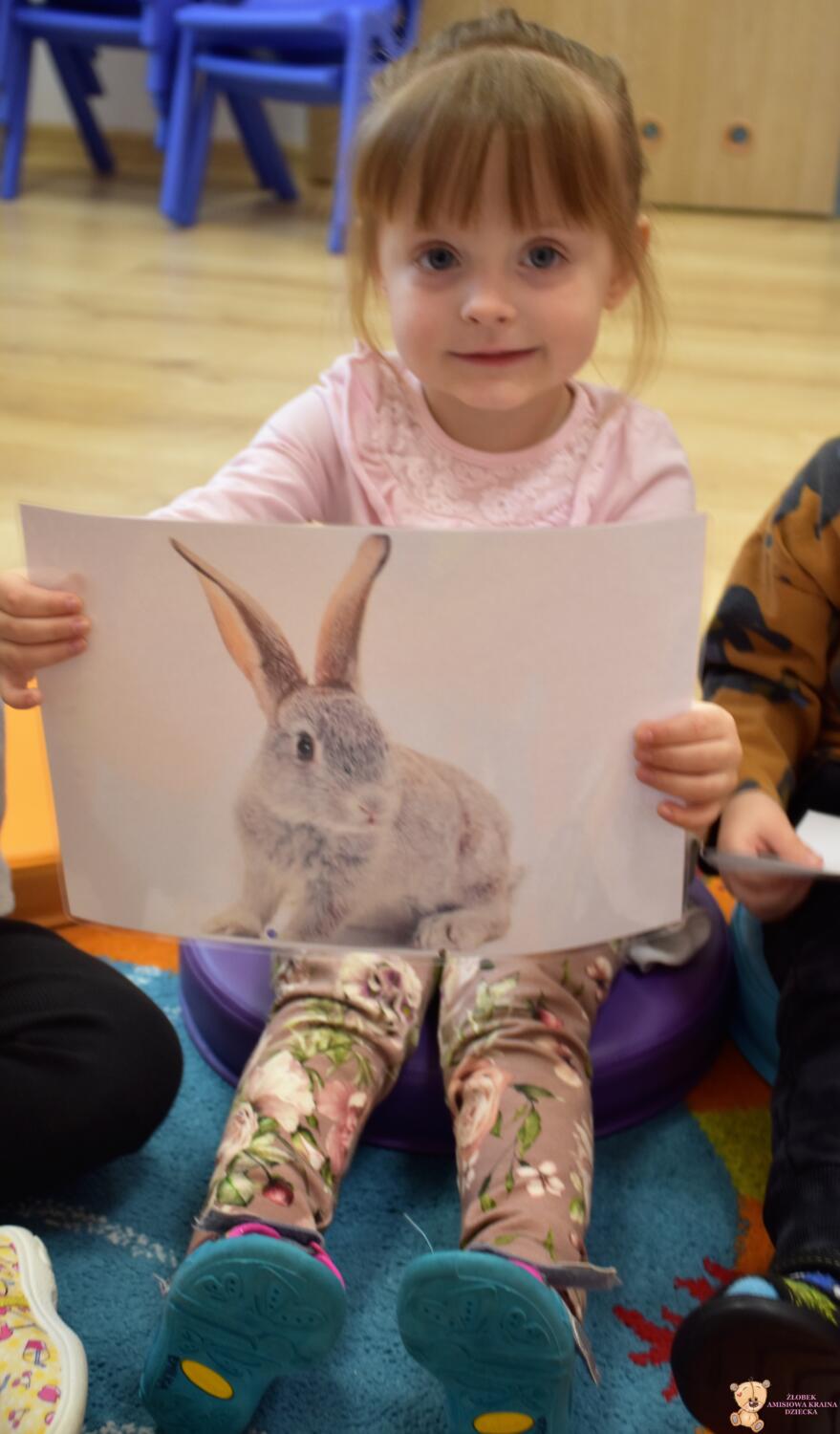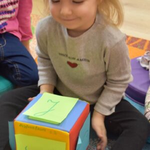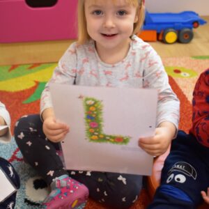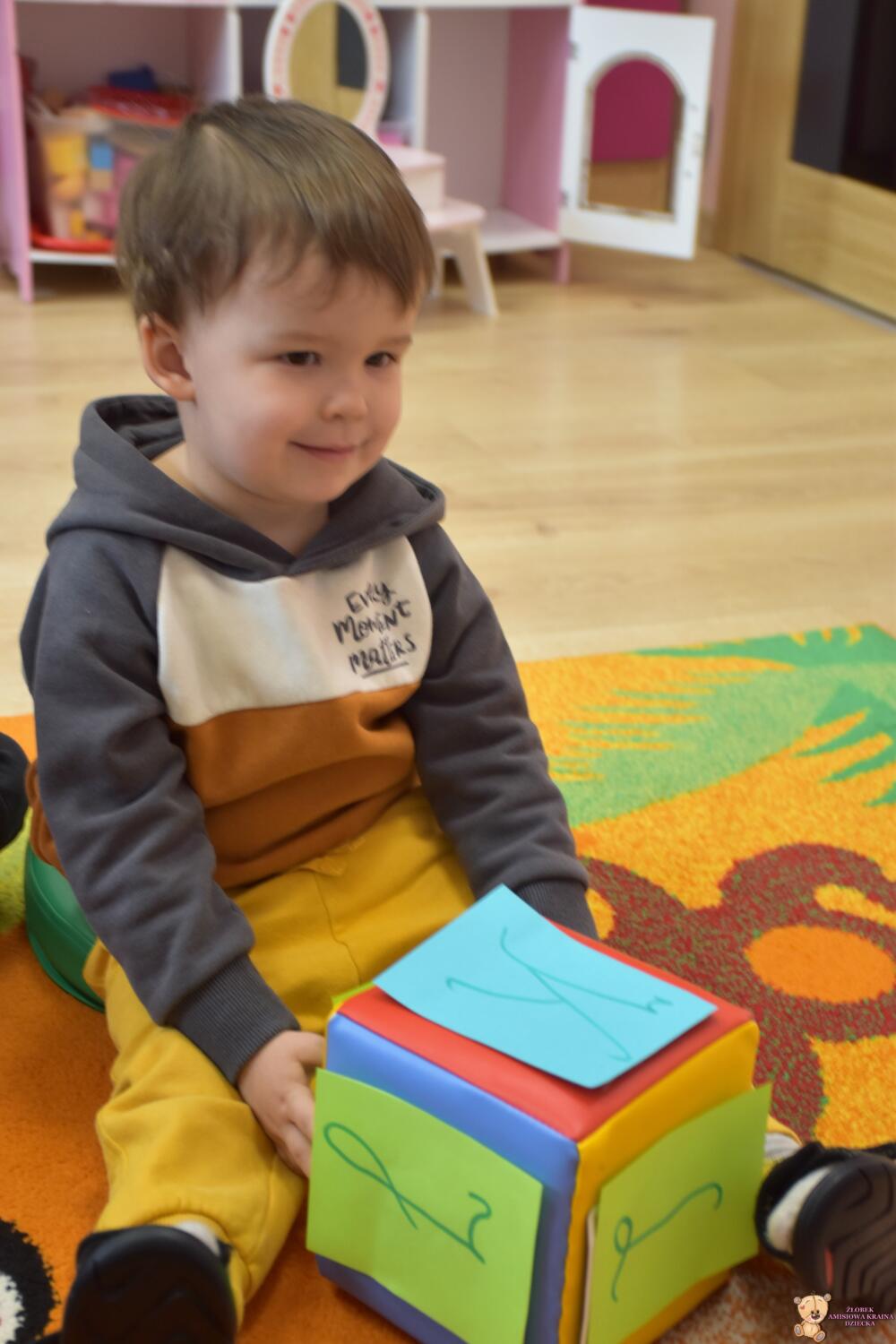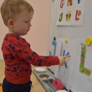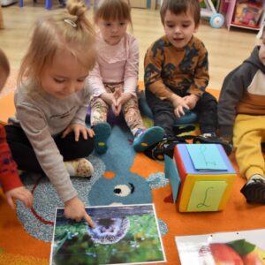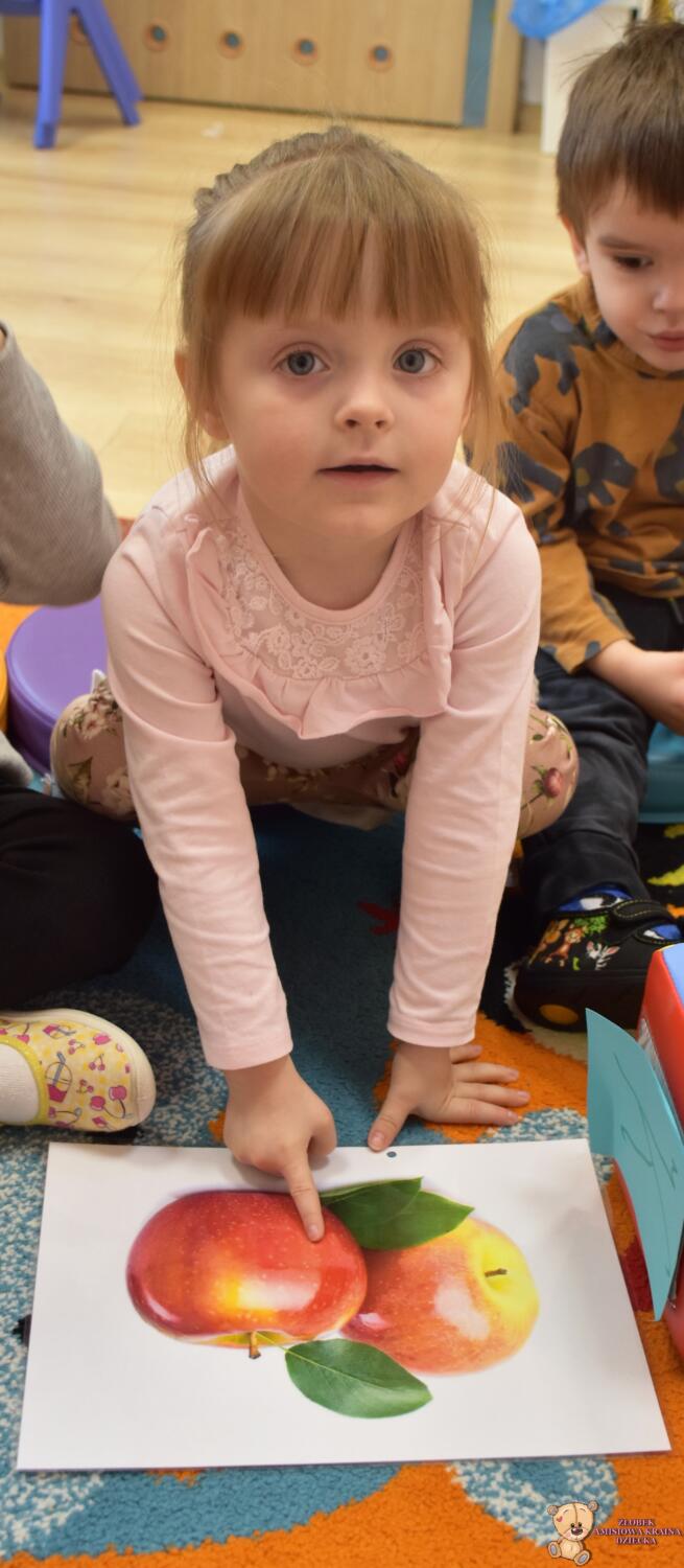dzieci rzucały kostką i odgadywały jaka wypadła litera, następnie szukaliśmy wśród ilustracji zwierzątek i owoców na daną literkę