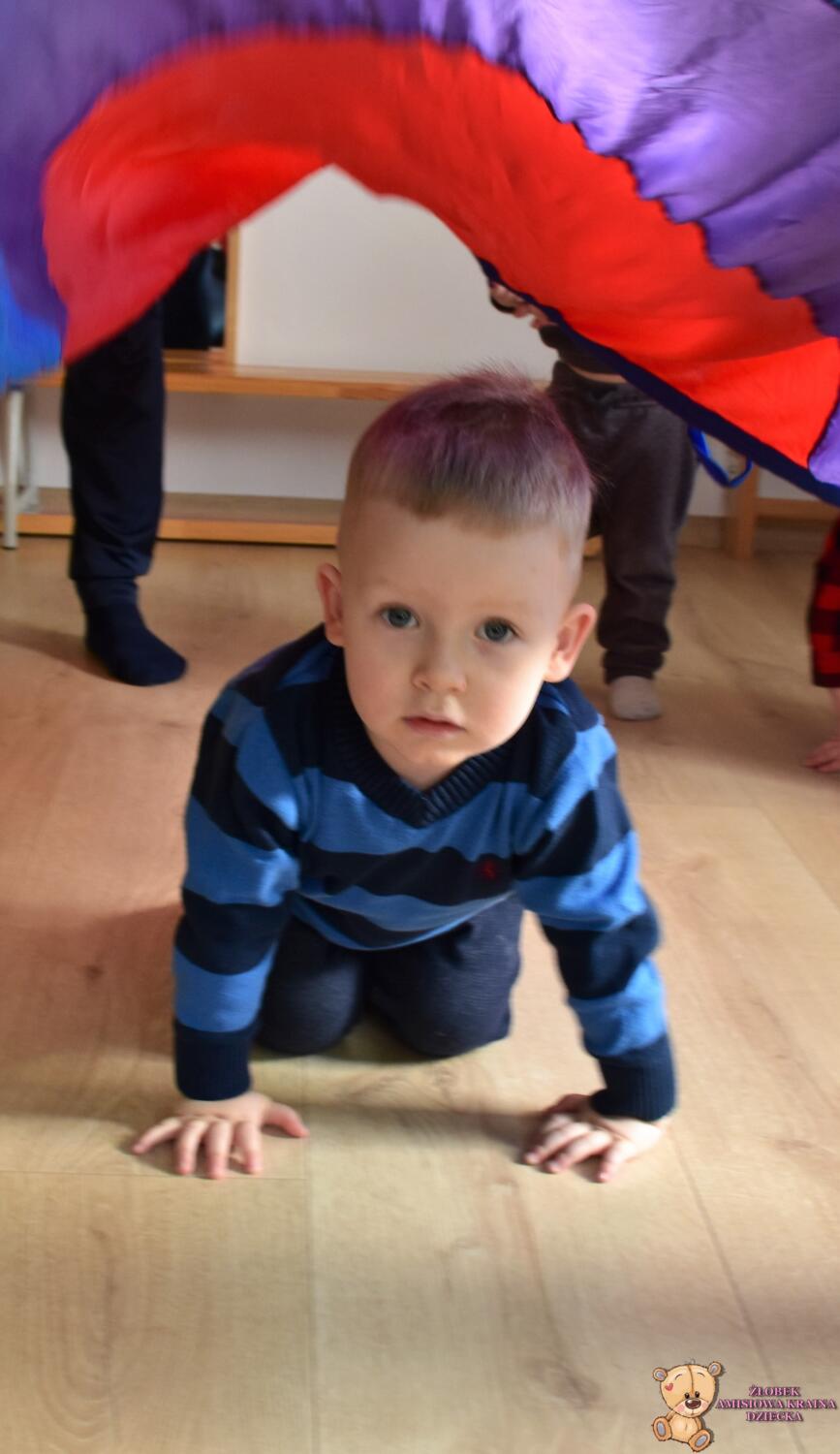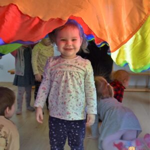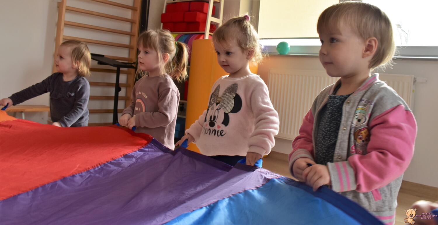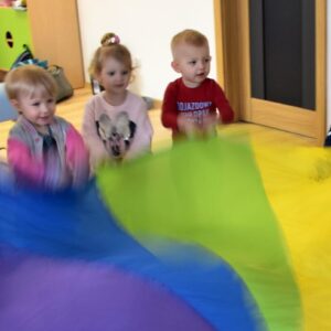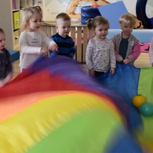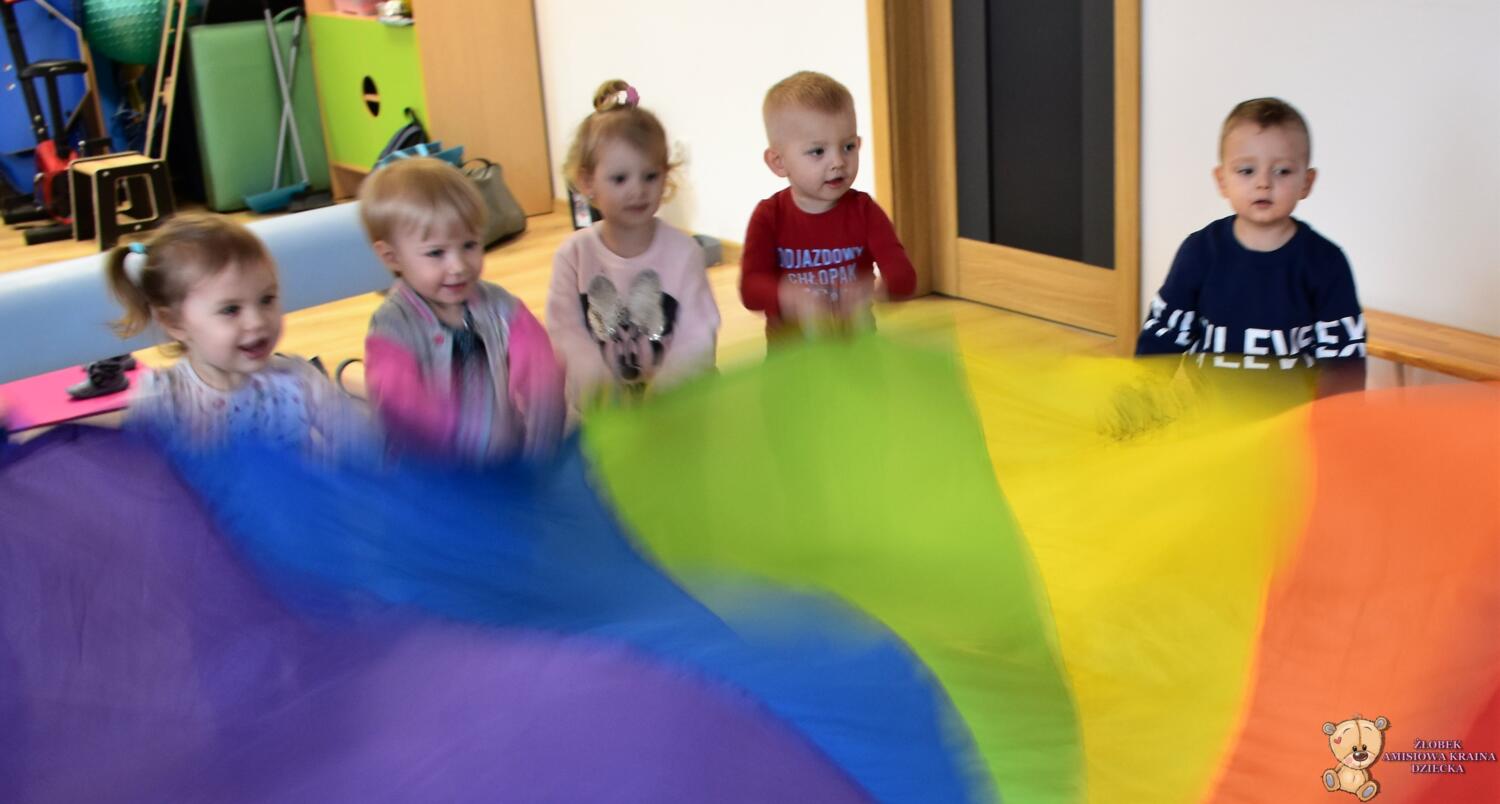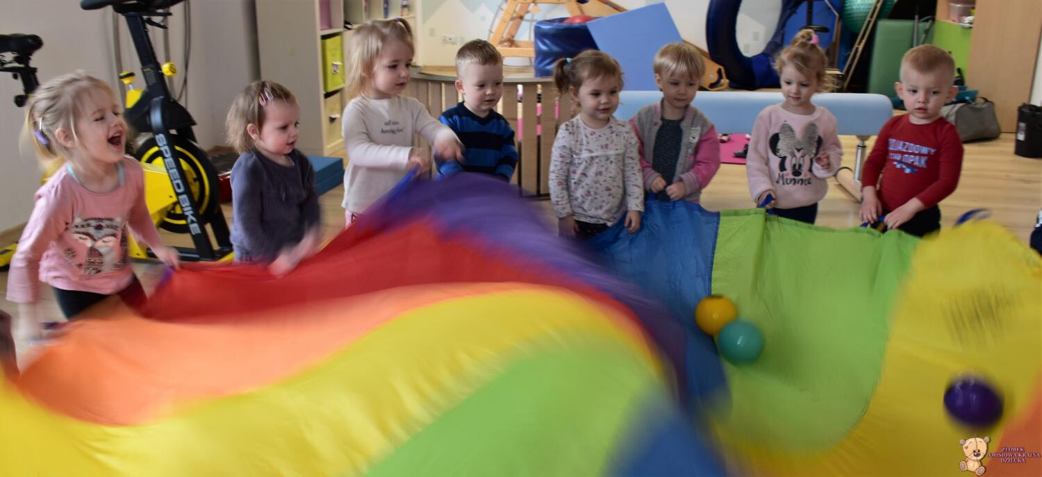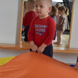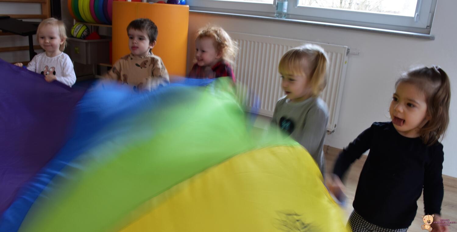 Dzieci bawiły się dziś chustą animacyjną. Ćwiczyliśmy rozróżnianie kolorów, podrzucaliśmy piłkę i balon, pilnowaliśmy żeby nie uciekły poza obwód naszej chustki. Chodziliśmy też w koło razem trzymając chustę i zmienialiśmy kierunki