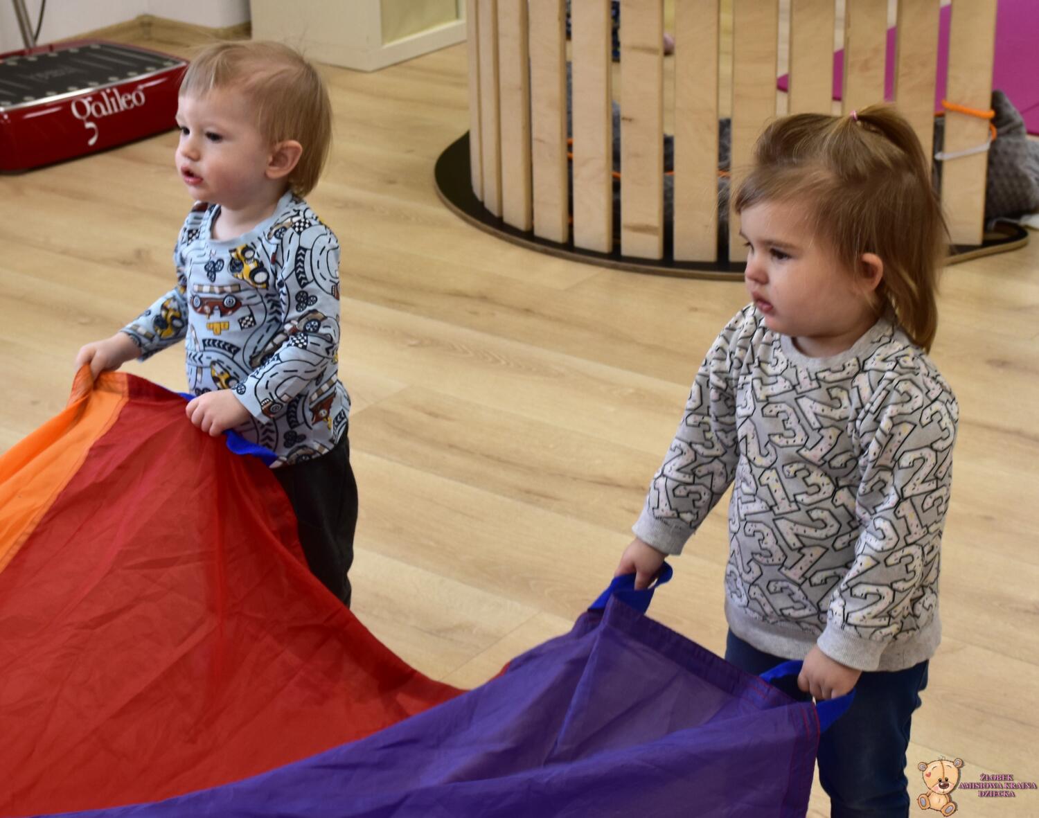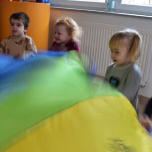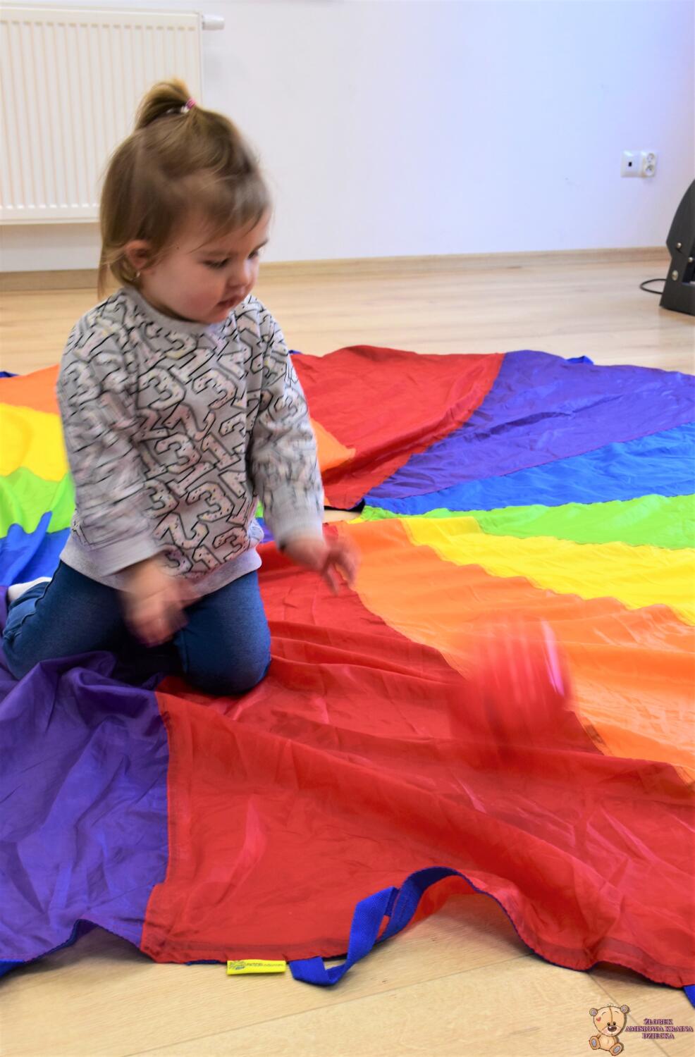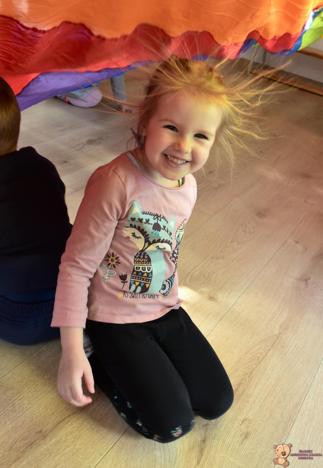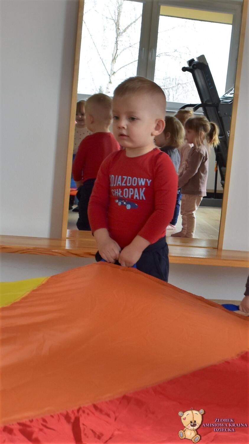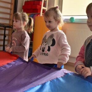 Dzieci bawiły się dziś chustą animacyjną. Ćwiczyliśmy rozróżnianie kolorów, podrzucaliśmy piłkę i balon, pilnowaliśmy żeby nie uciekły poza obwód naszej chustki. Chodziliśmy też w koło razem trzymając chustę i zmienialiśmy kierunki