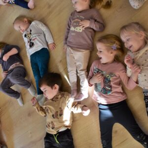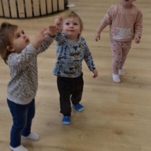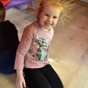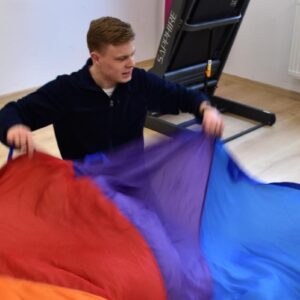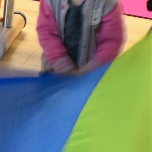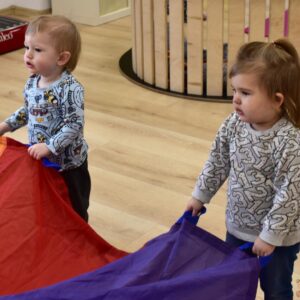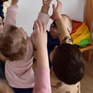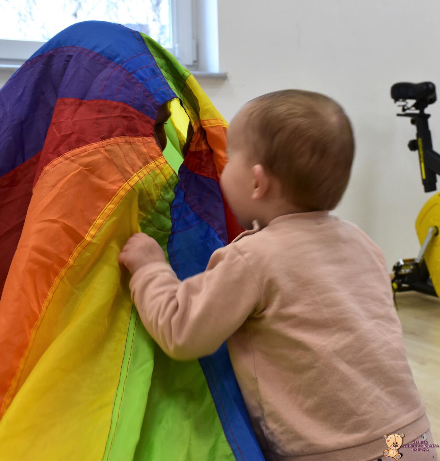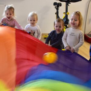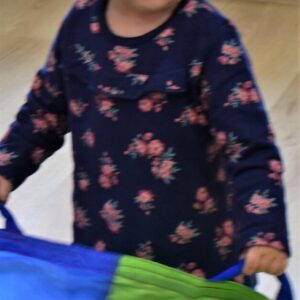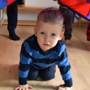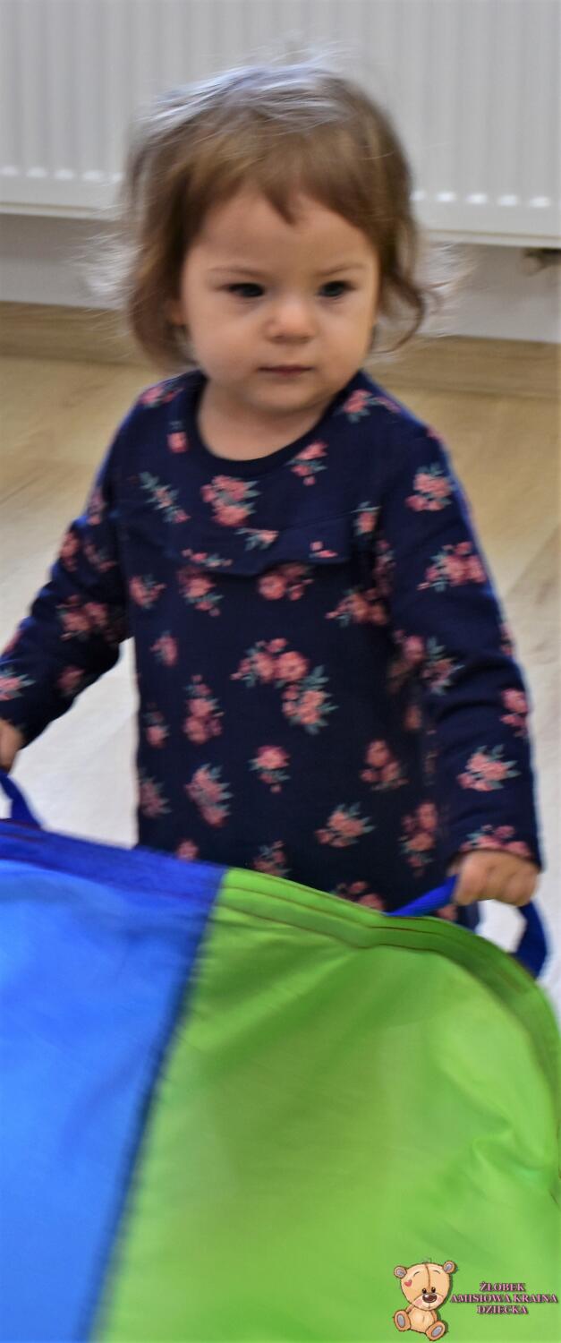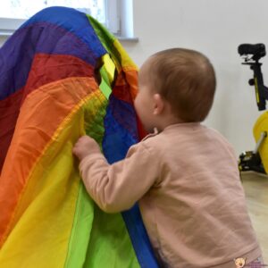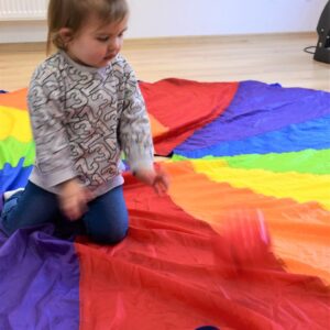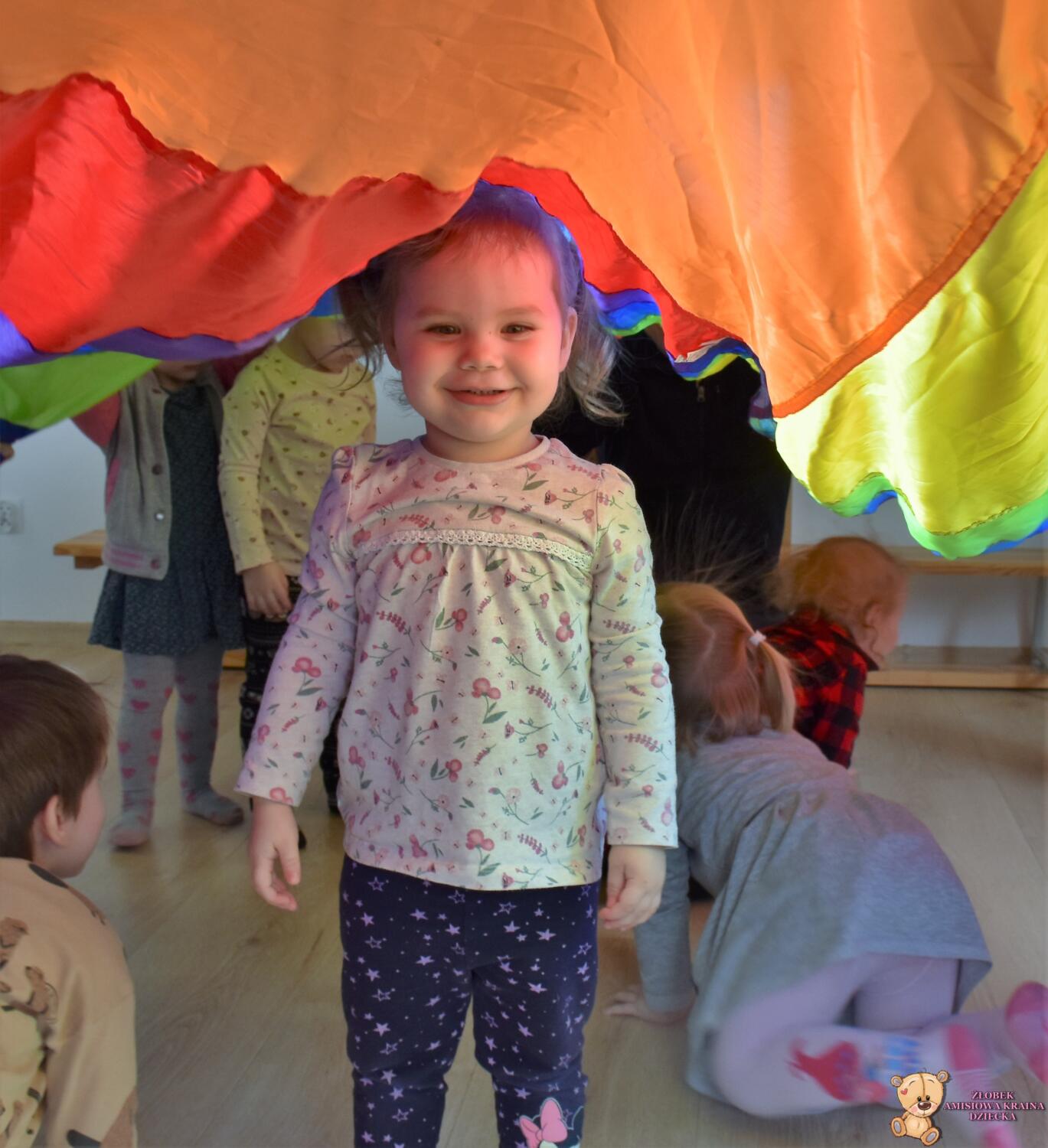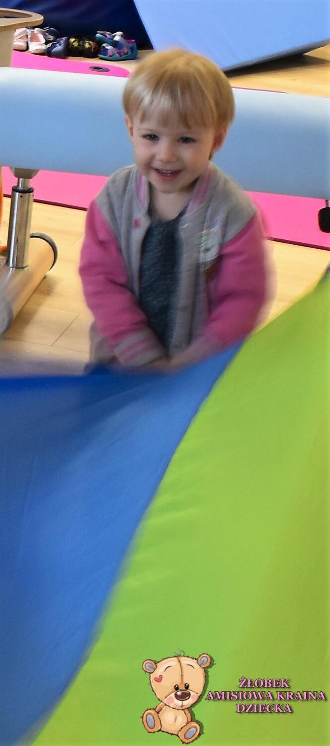 Dzieci bawiły się dziś chustą animacyjną. Ćwiczyliśmy rozróżnianie kolorów, podrzucaliśmy piłkę i balon, pilnowaliśmy żeby nie uciekły poza obwód naszej chustki. Chodziliśmy też w koło razem trzymając chustę i zmienialiśmy kierunki