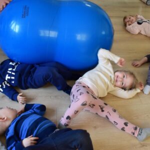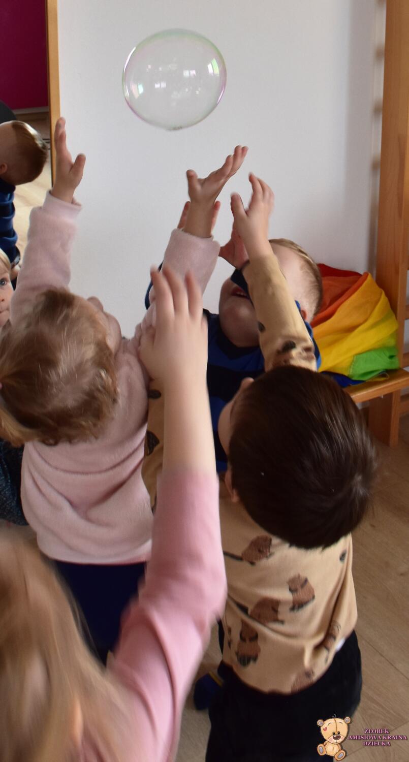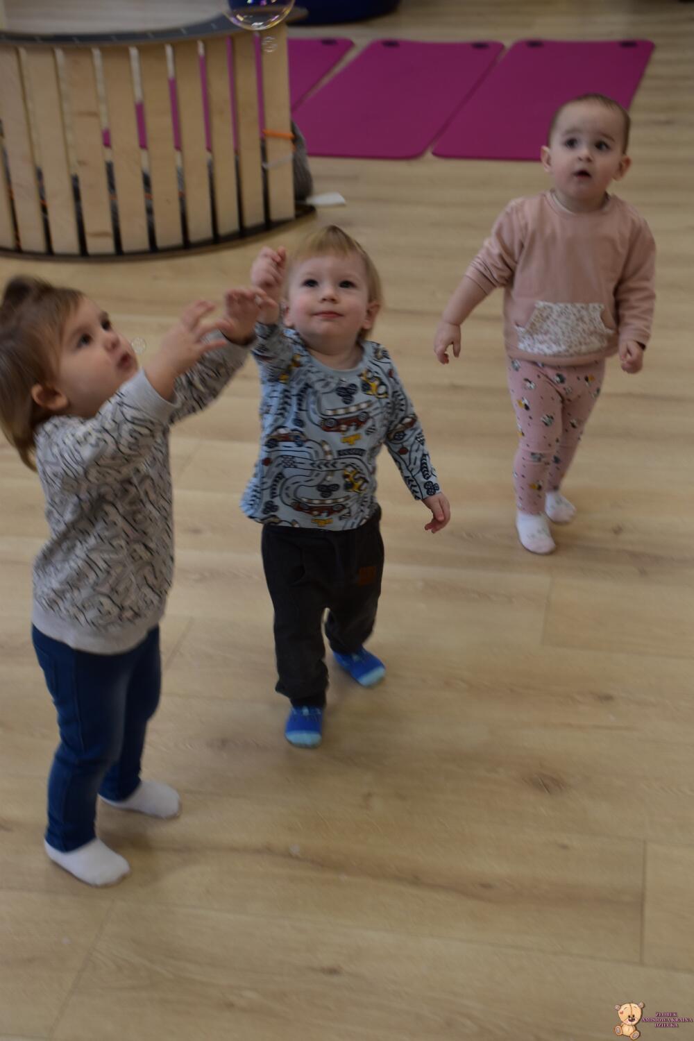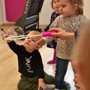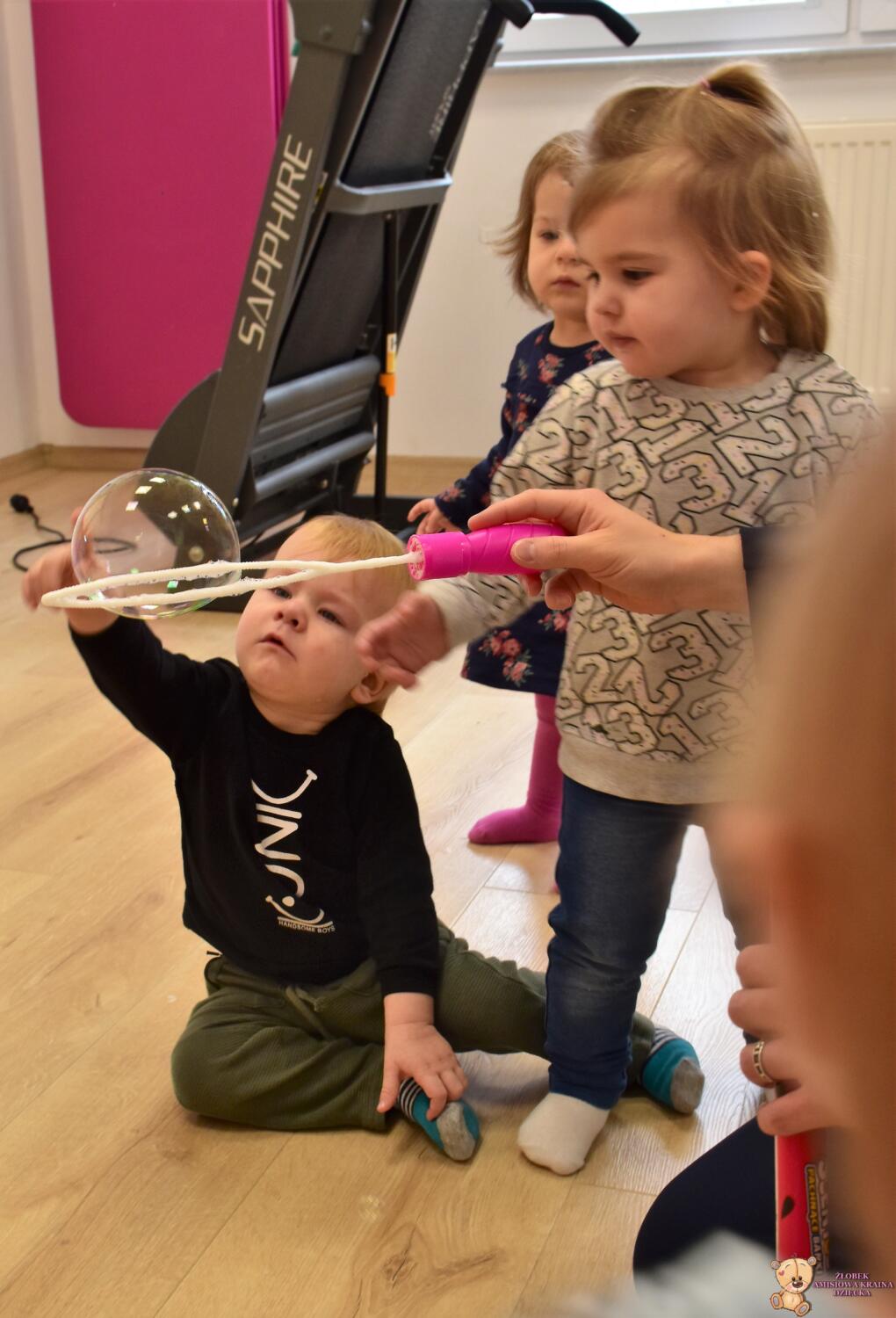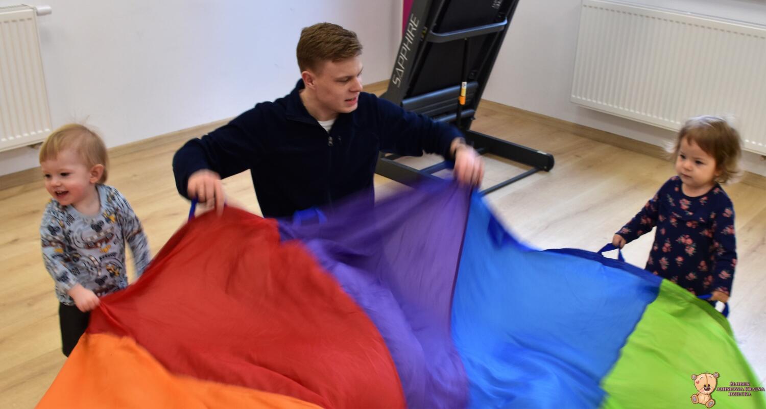mogliśmy też przechodzić pod chustką. W nagrodę wujek puścił nam bańki mydlane, które wspólnie zbijaliśmy, a także ugniatał nas dużą piłką „fasolką” ![]()