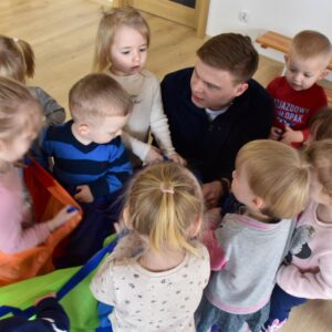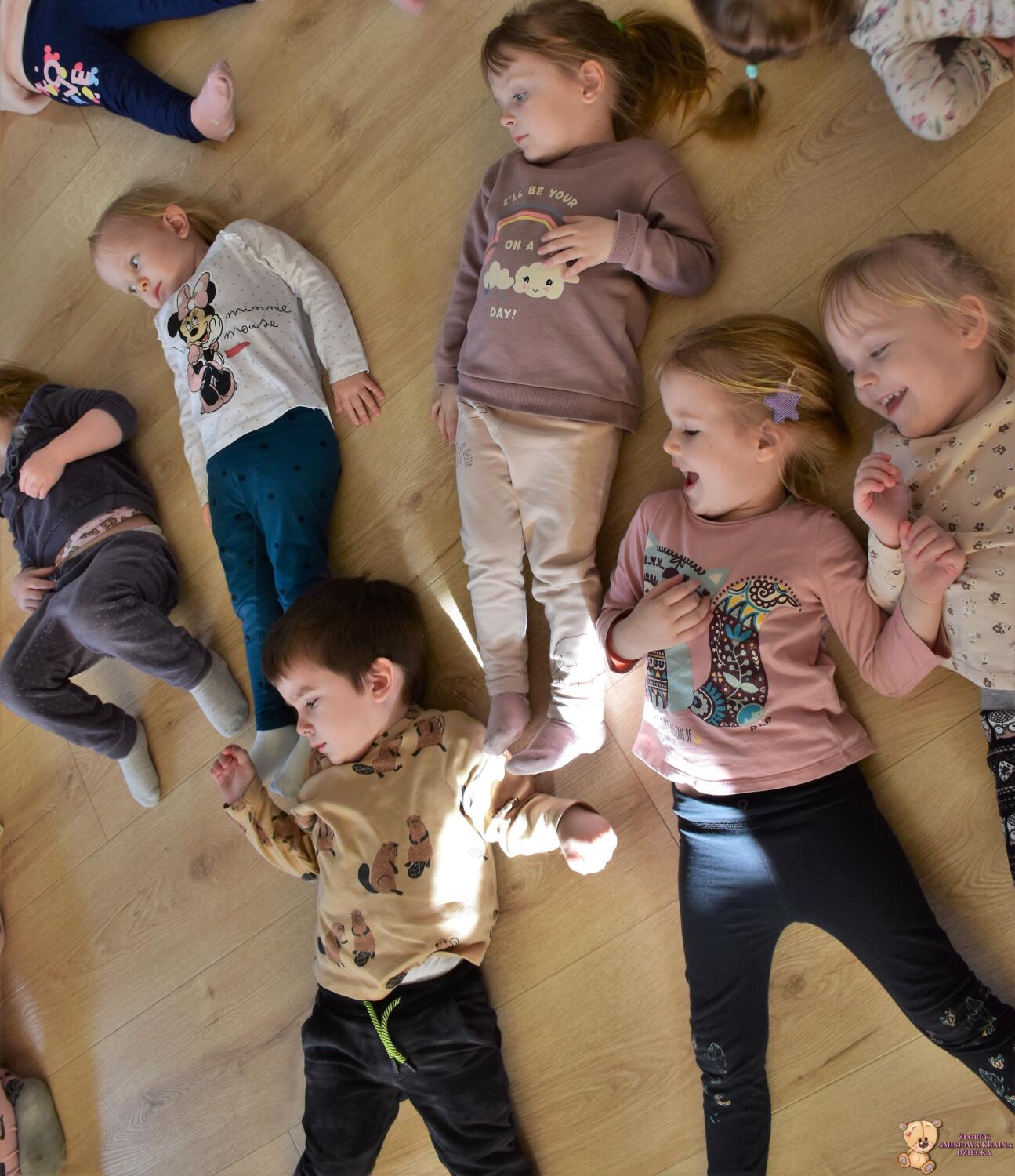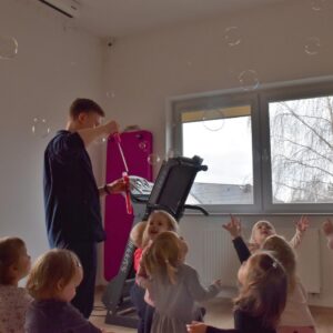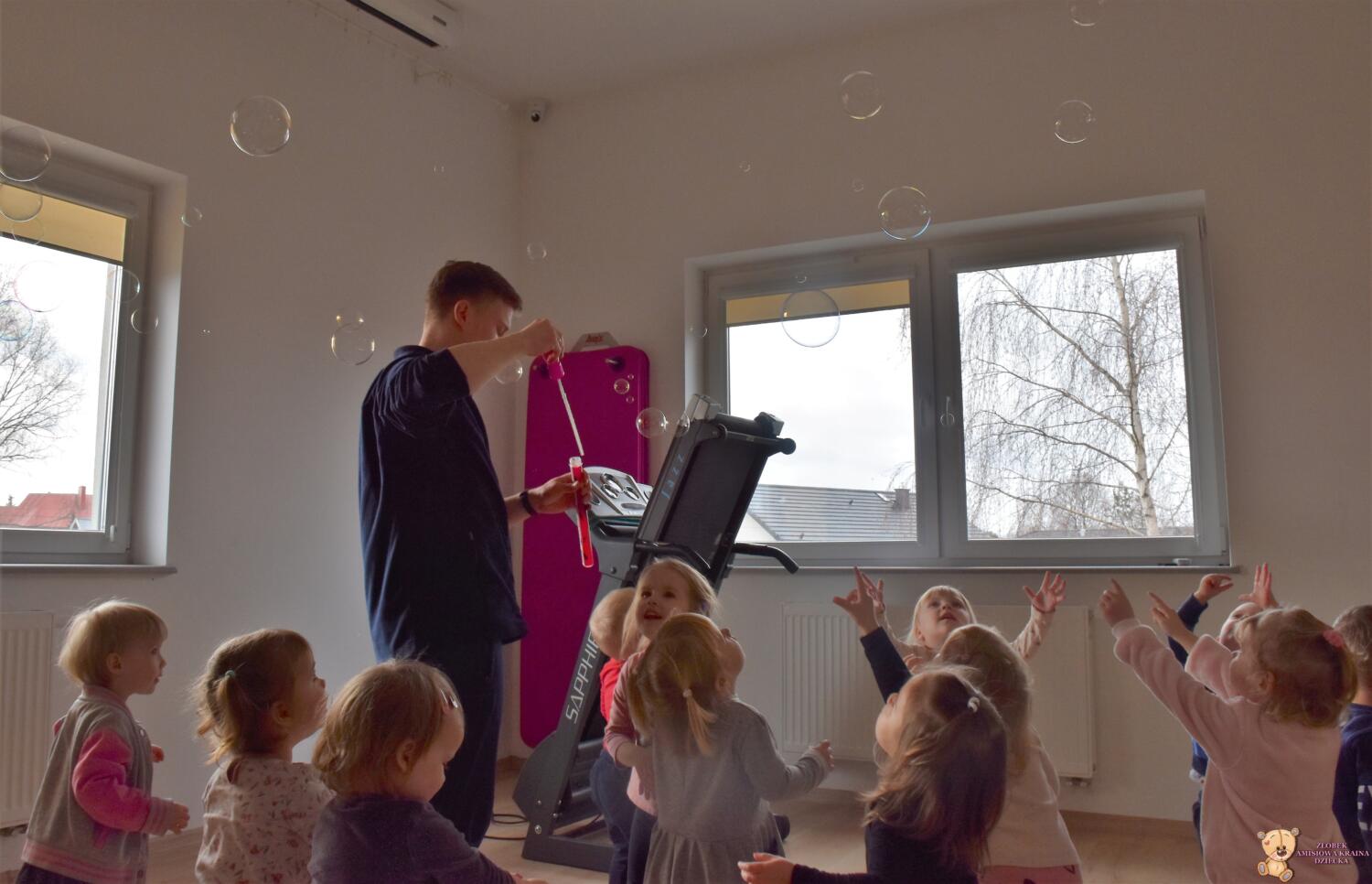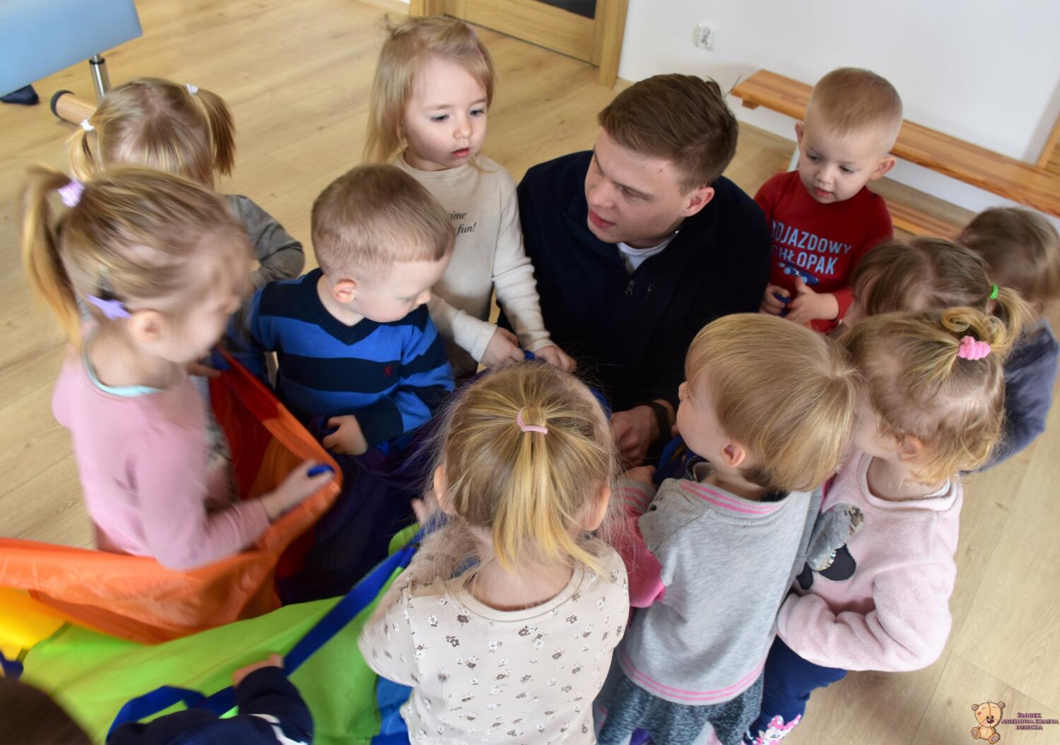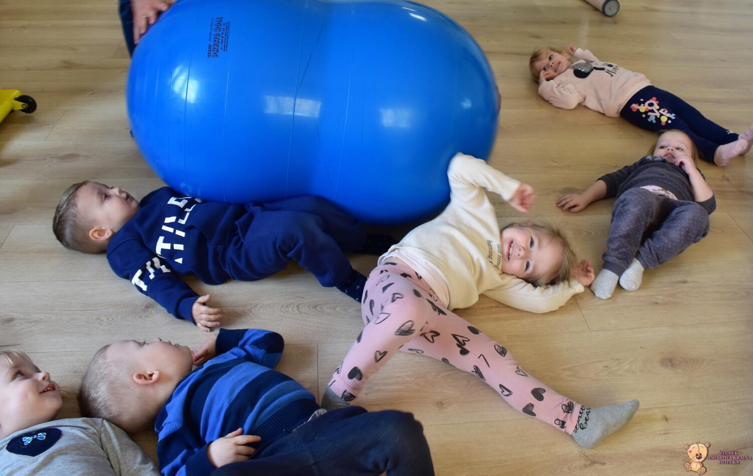 mogliśmy też przechodzić pod chustką. W nagrodę wujek puścił nam bańki mydlane, które wspólnie zbijaliśmy, a także ugniatał nas dużą piłką „fasolką” ![]()